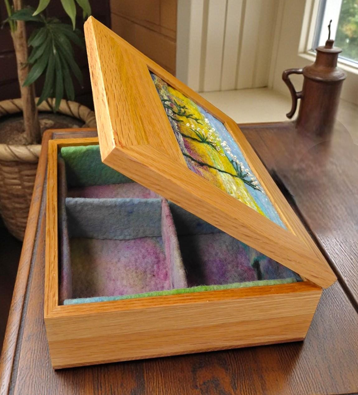 I have embroidered some flowers onto a wet-felted background, which is inlaid into the lid.