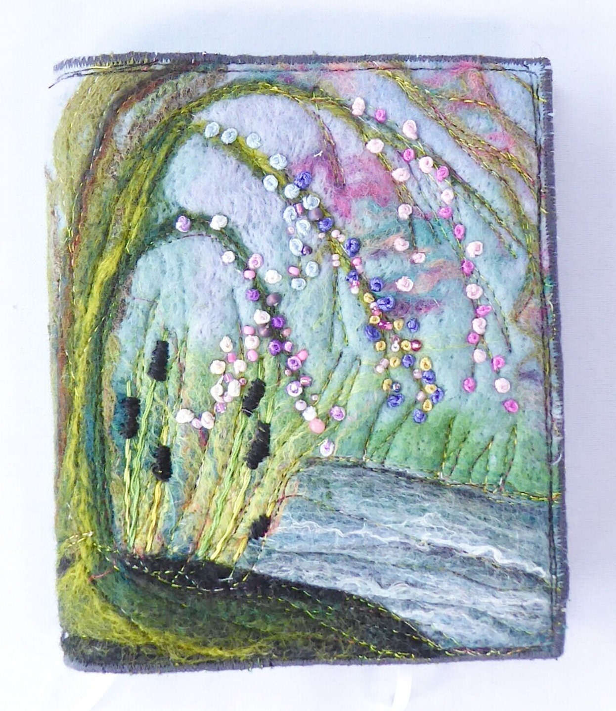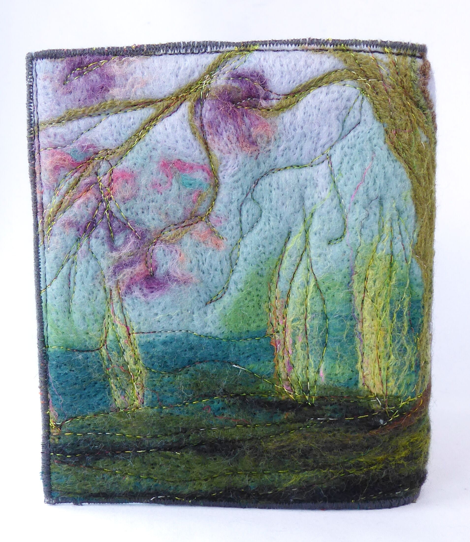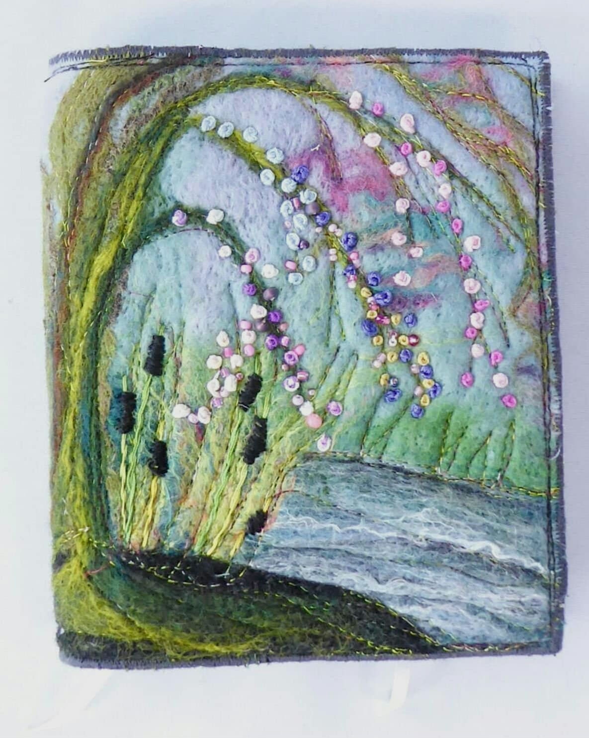 The book cover is an acrylic painting on canvas, with hand-felted embellishments and machine embroidery.