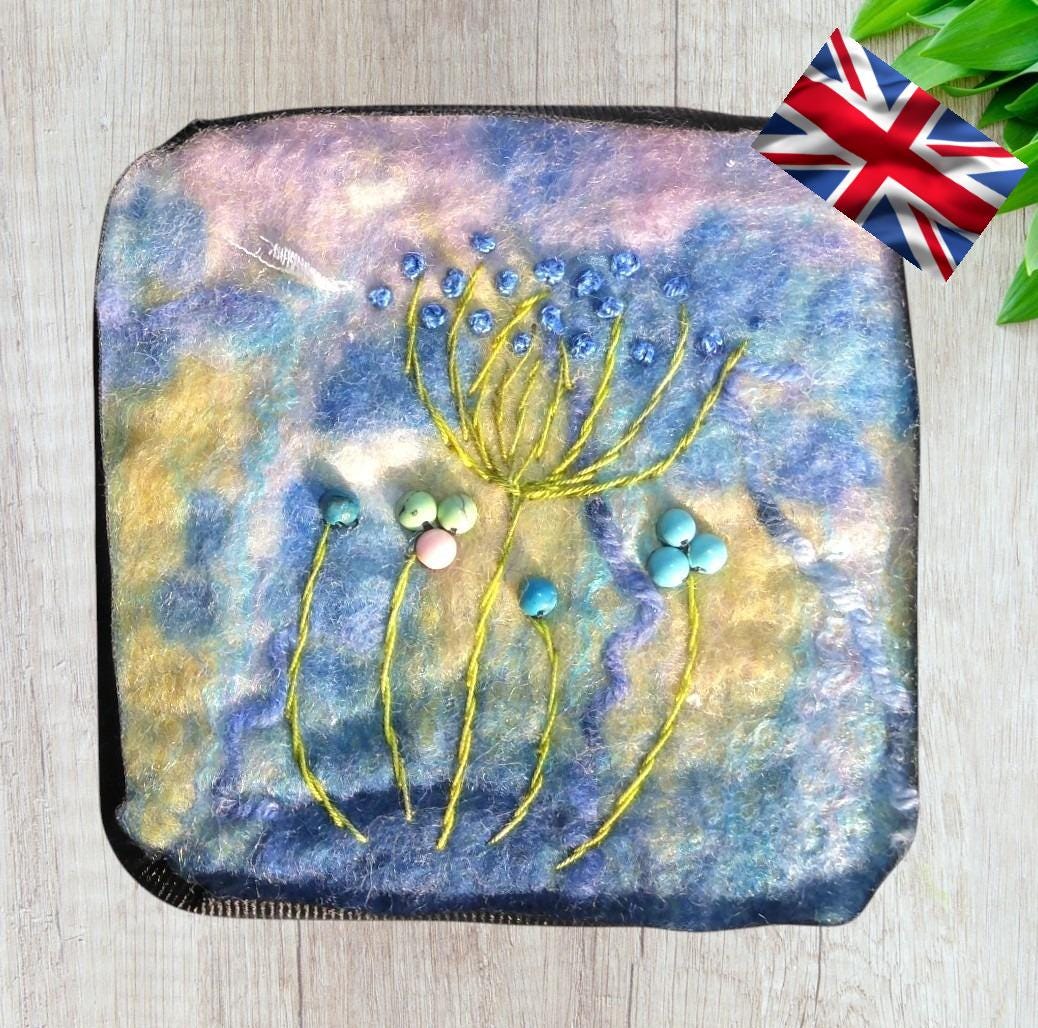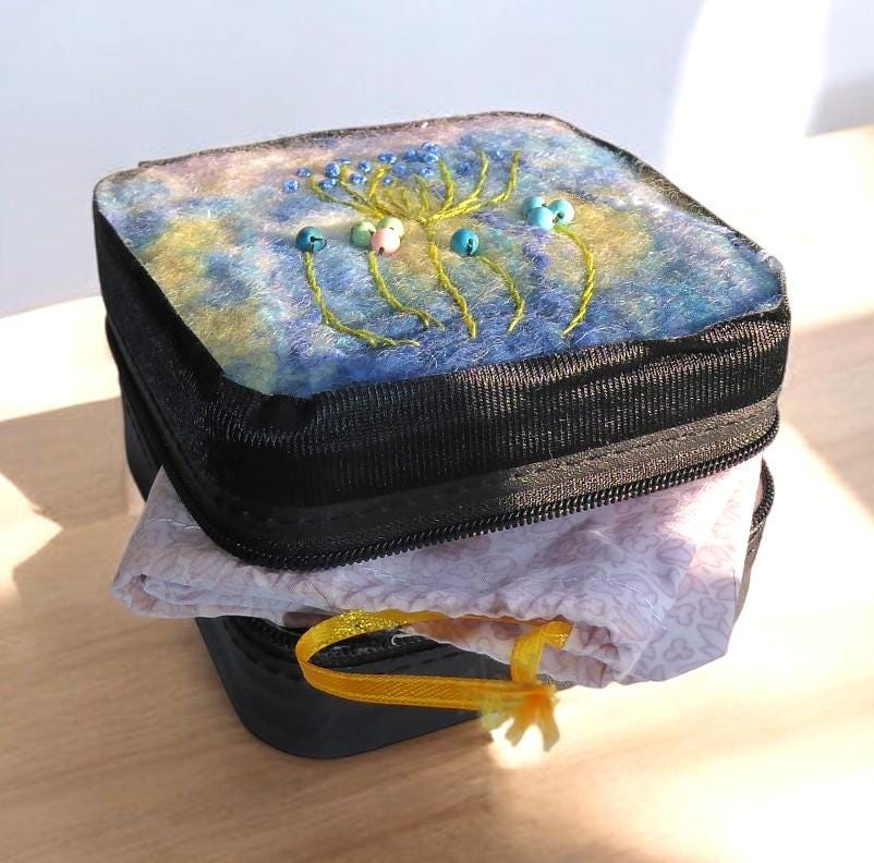 This box features an embroidered floral design, with beads, on a wet-felted background.