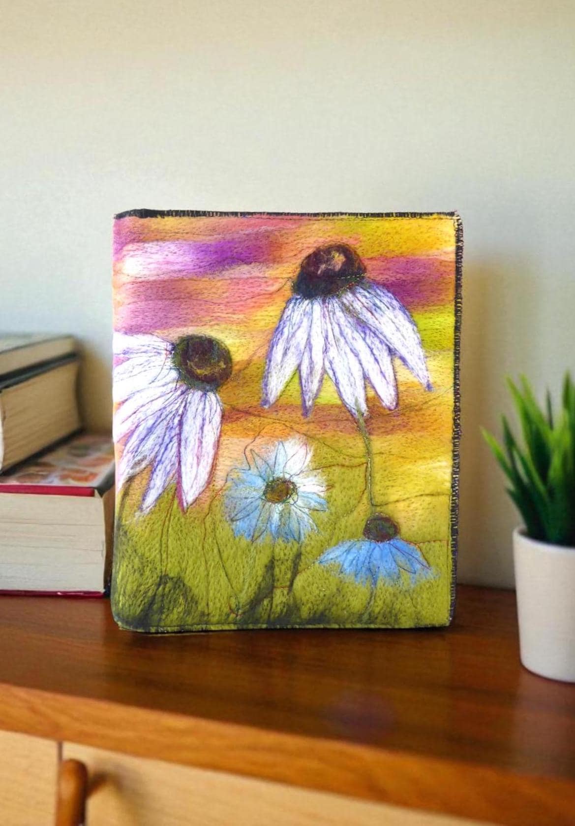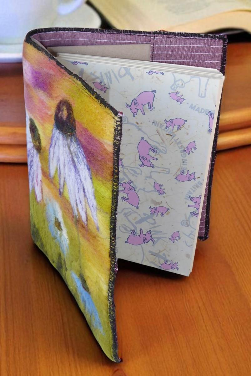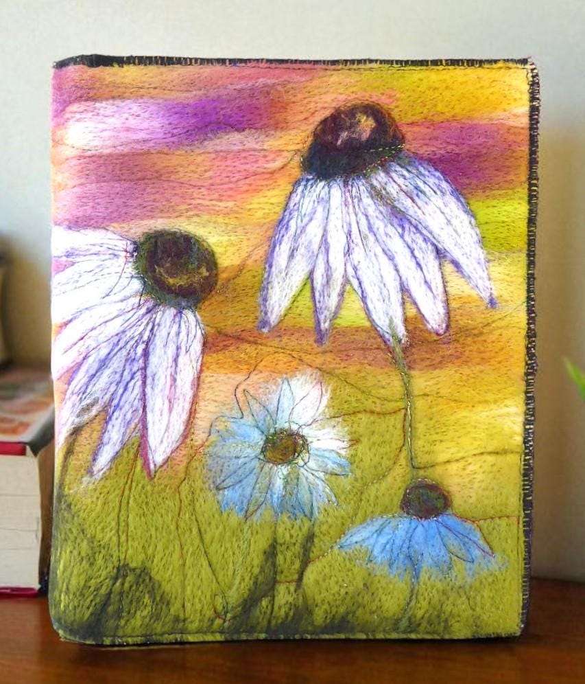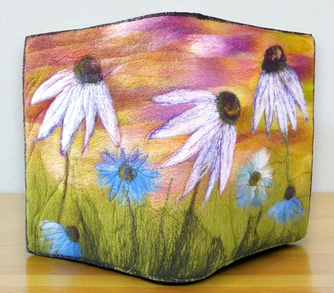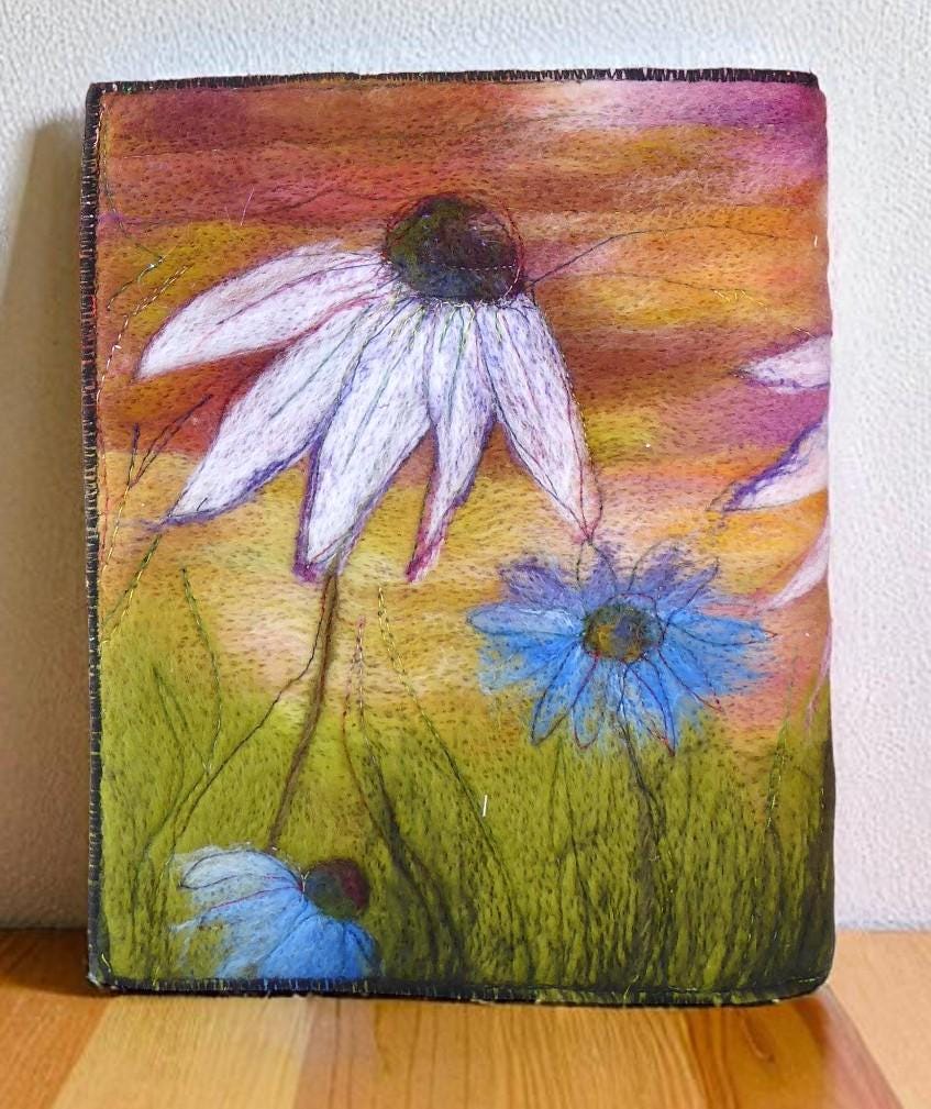I have needle-felted a floral design onto black, acrylic felt. Onto this, I have added embroidery to give the picture added depth.