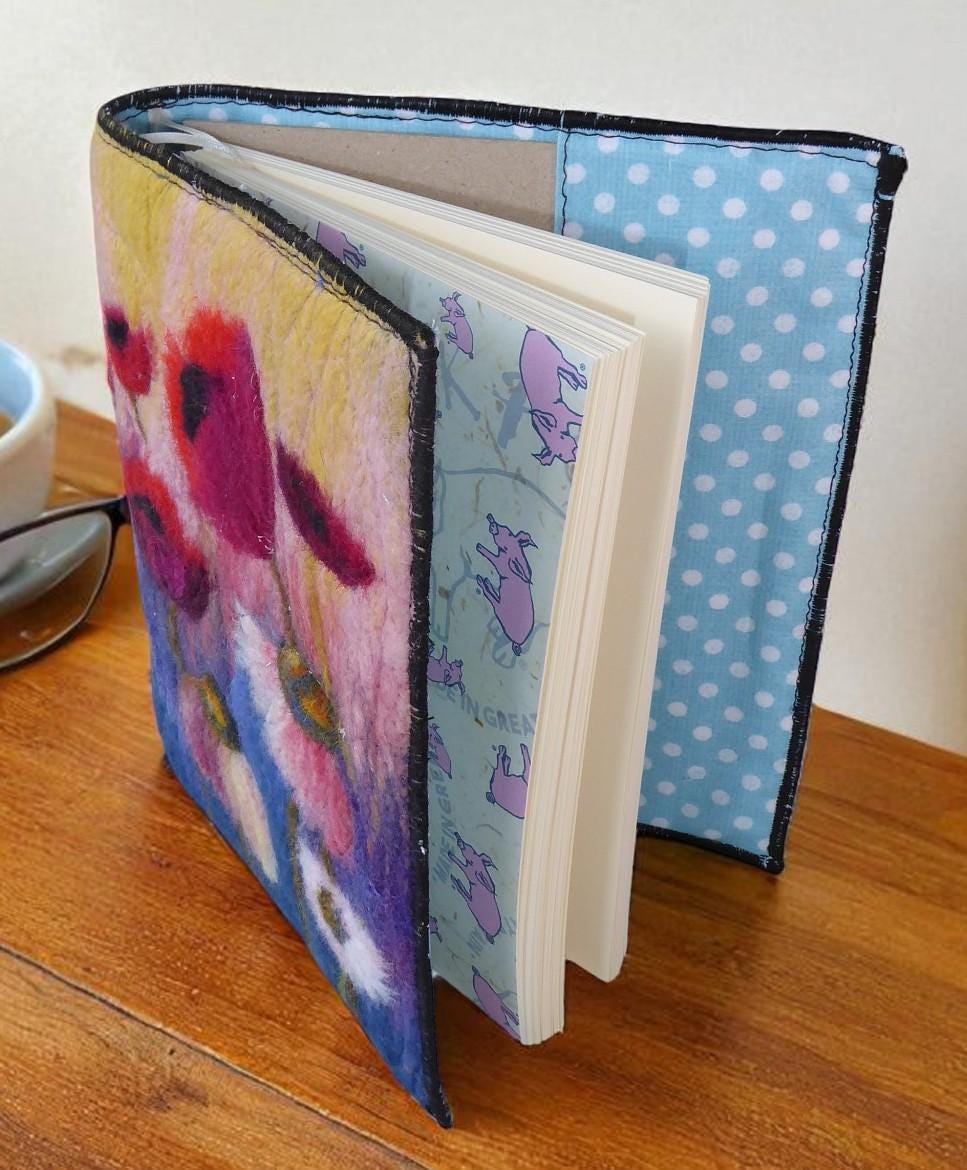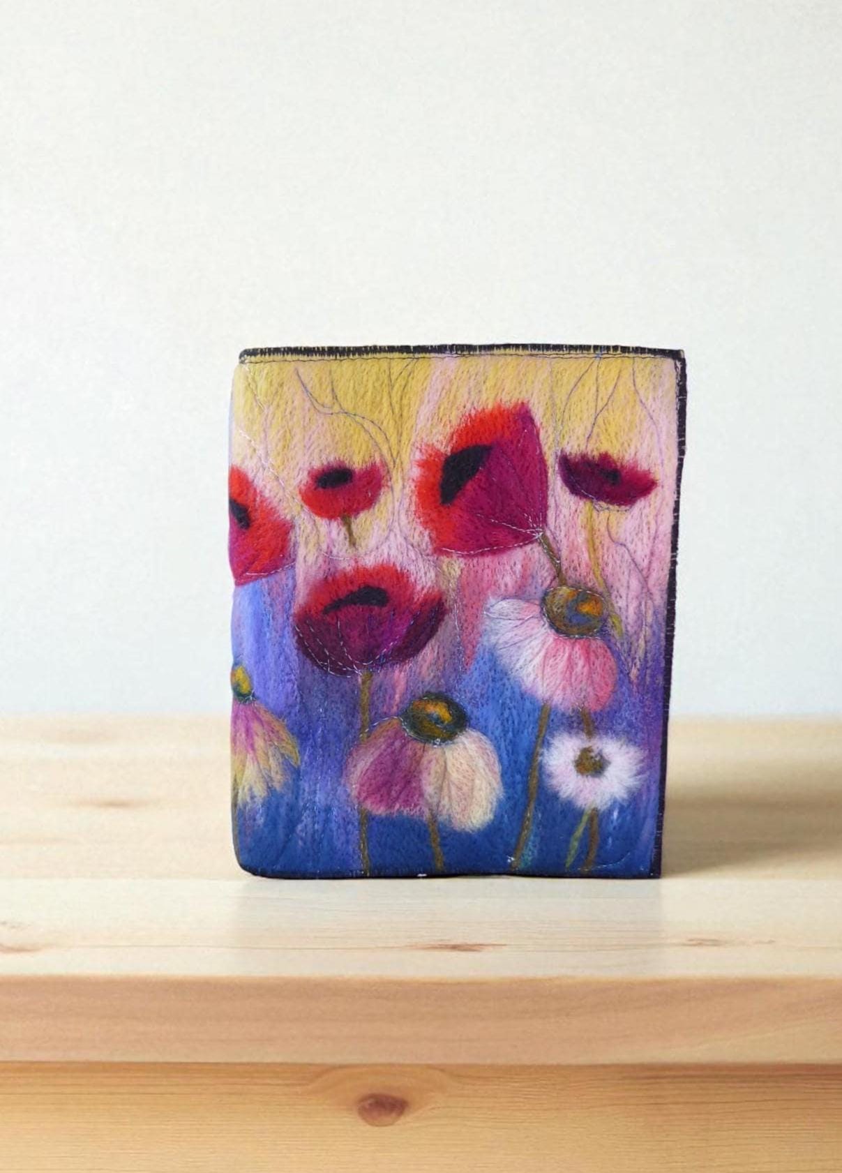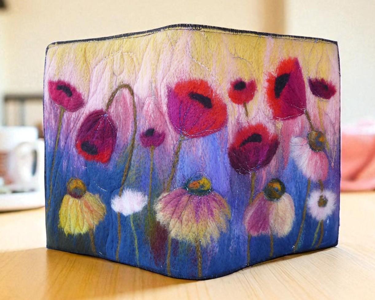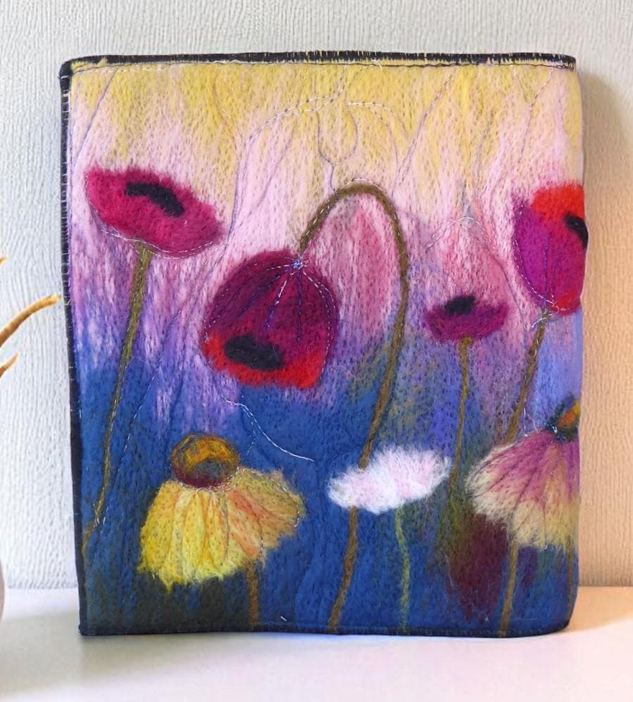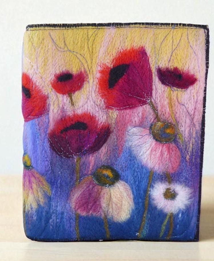 I have needle-felted a floral design onto black, acrylic felt. Onto this, I have added embroidery to give the picture added depth.