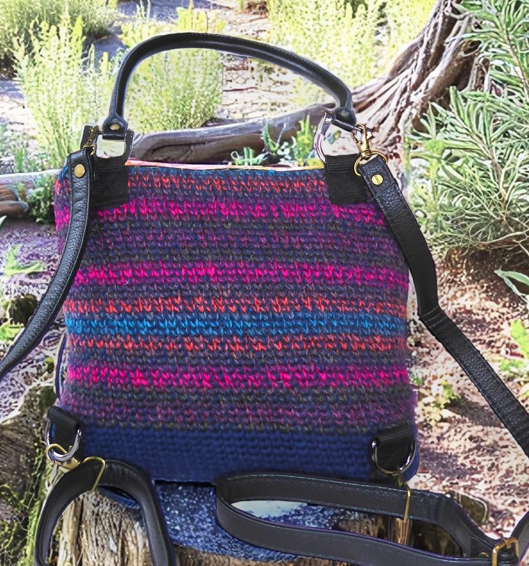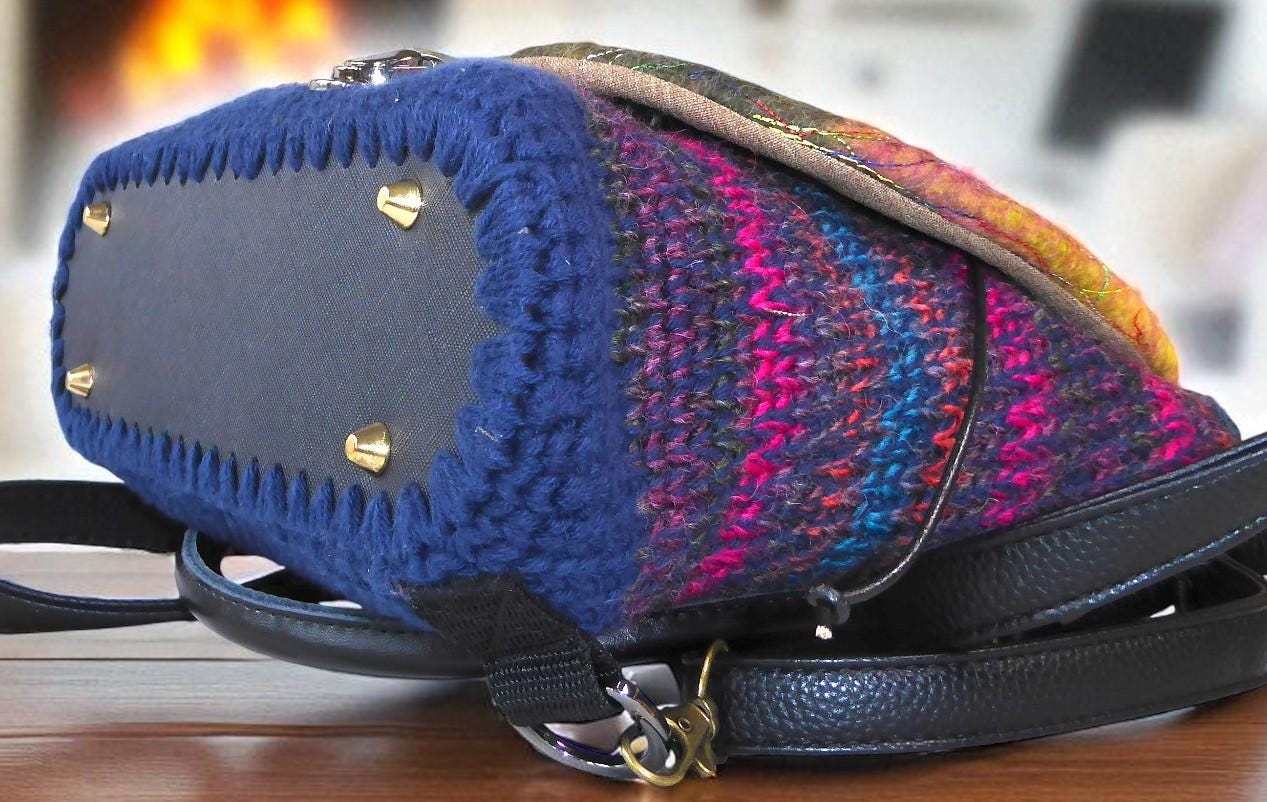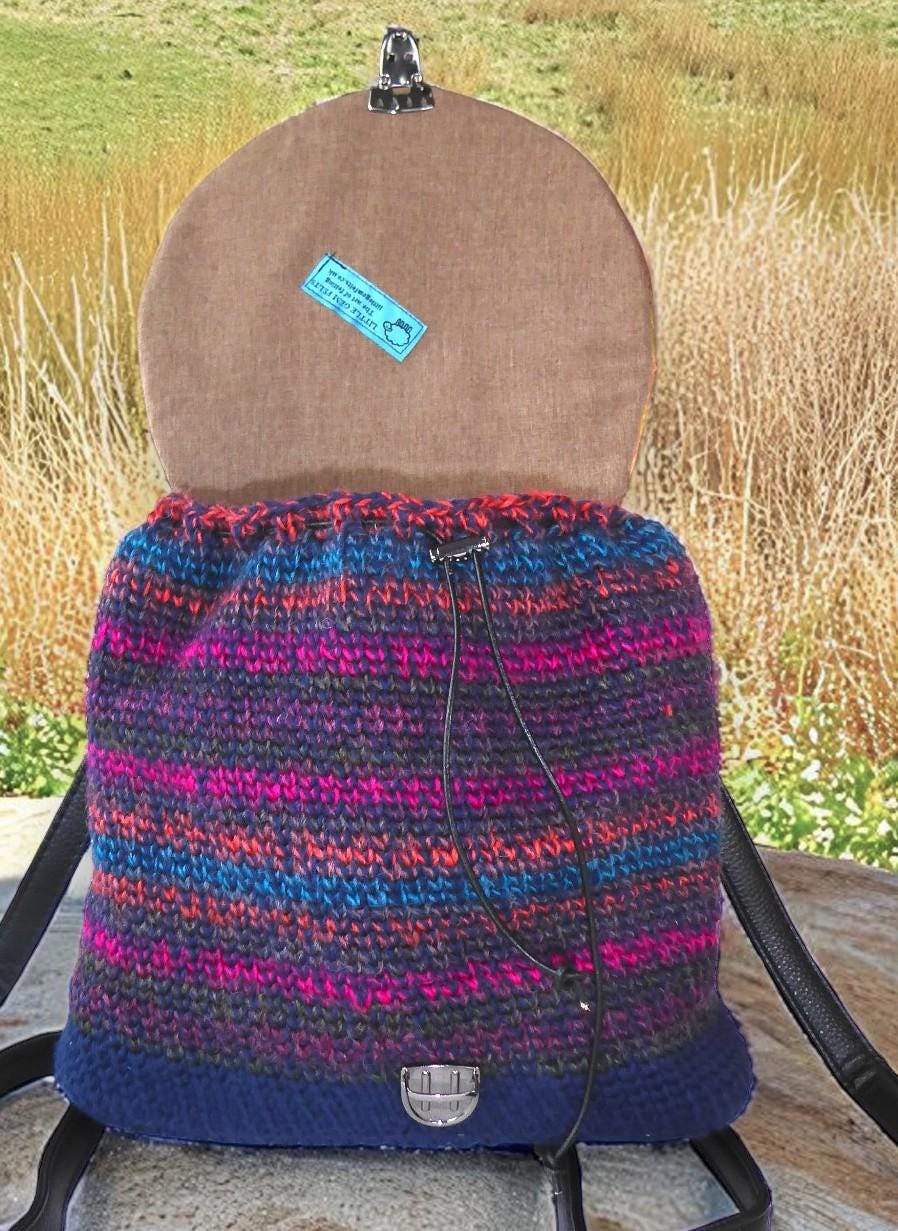 The body is crocheted cotton with a base and feet to protect the back-pack when you put it down.