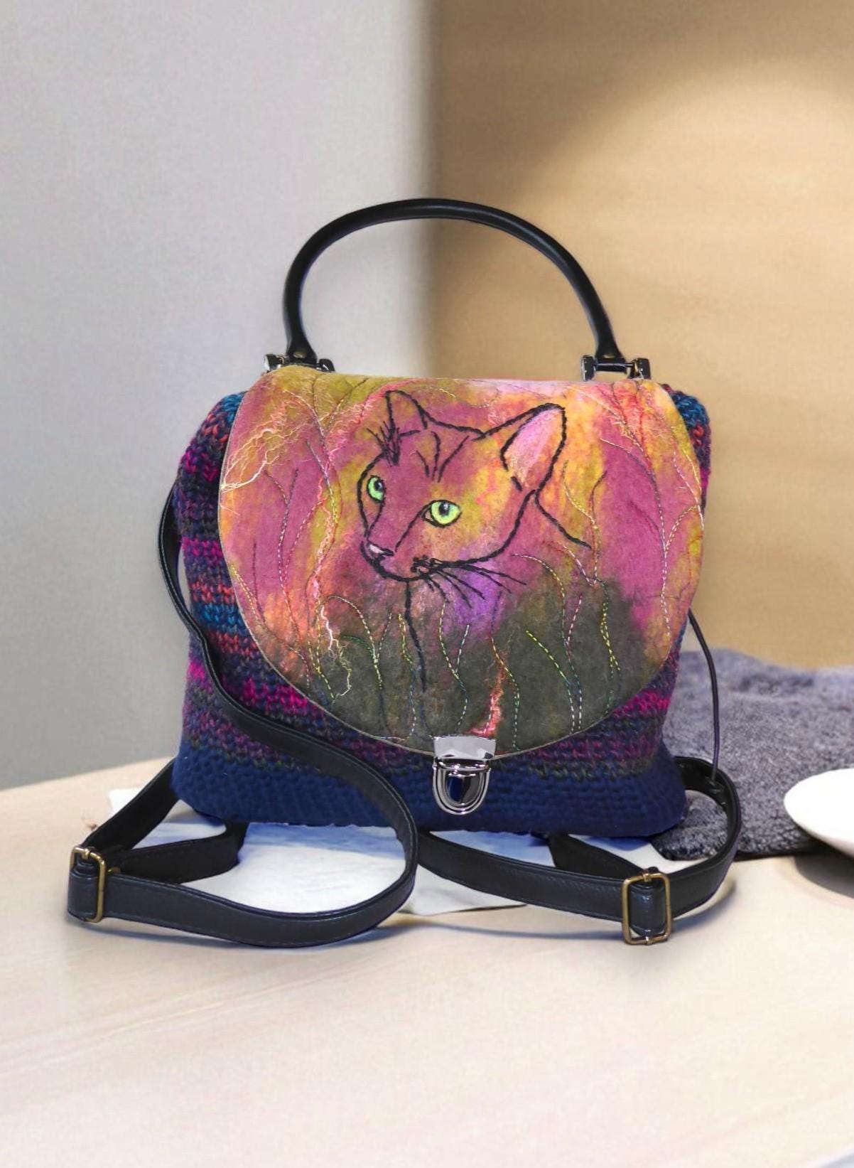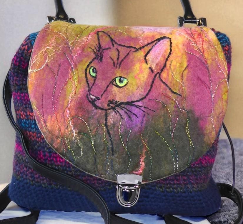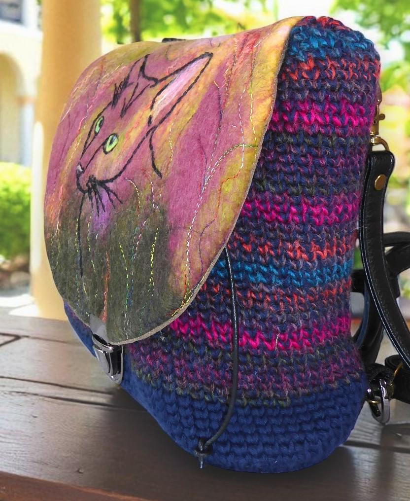The back-pack has a flap, onto which I have needle-felted a cat on a wet-felted background. I have then added embroidery to give definition.