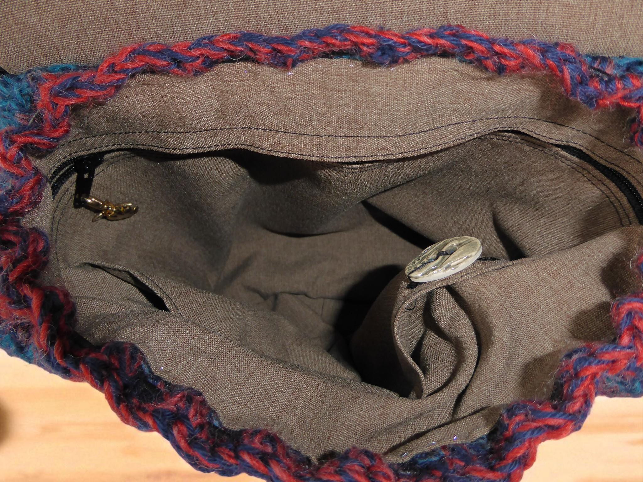 This shoulder back-pack is fully lined and has two buttoned pockets and a zipped pocket inside. The buttons are hand-made ceramic.