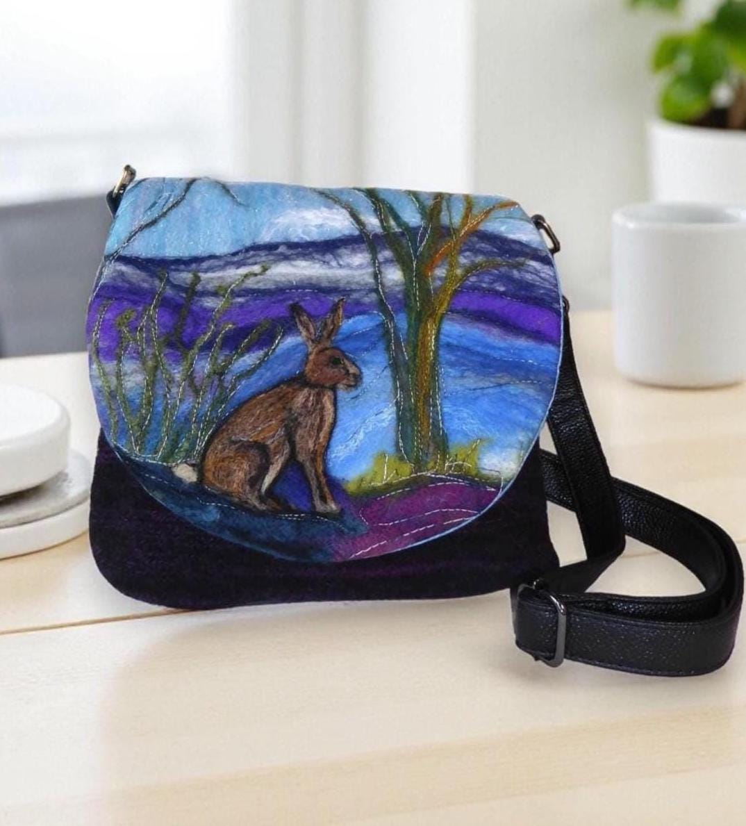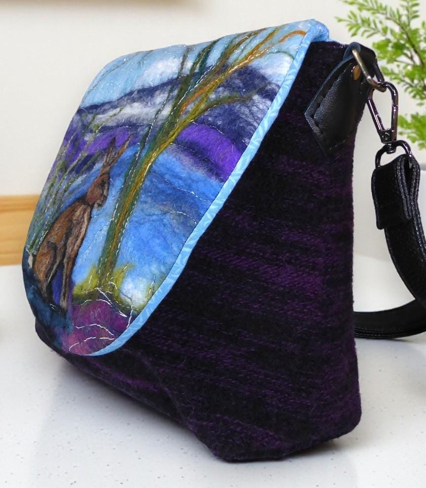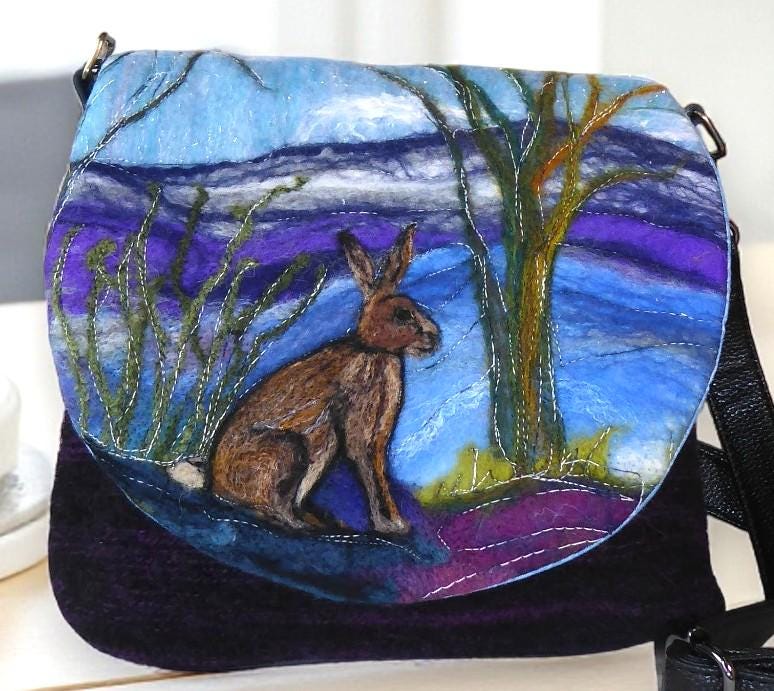 The bag has a flap onto which I have needle-felted a hare. I have added embroidery to give some added definition.