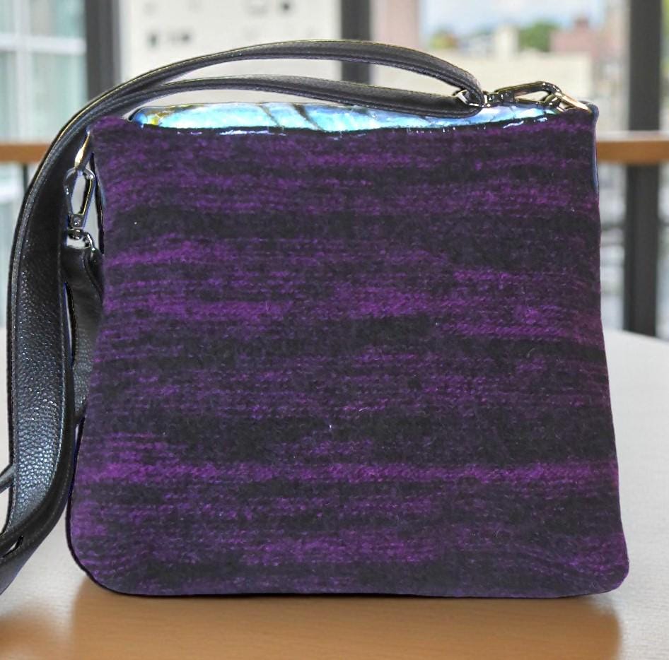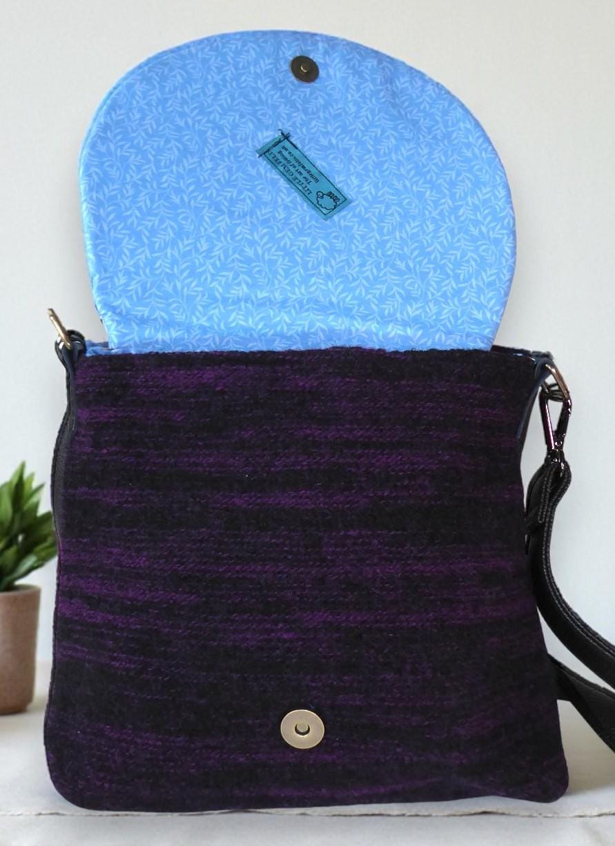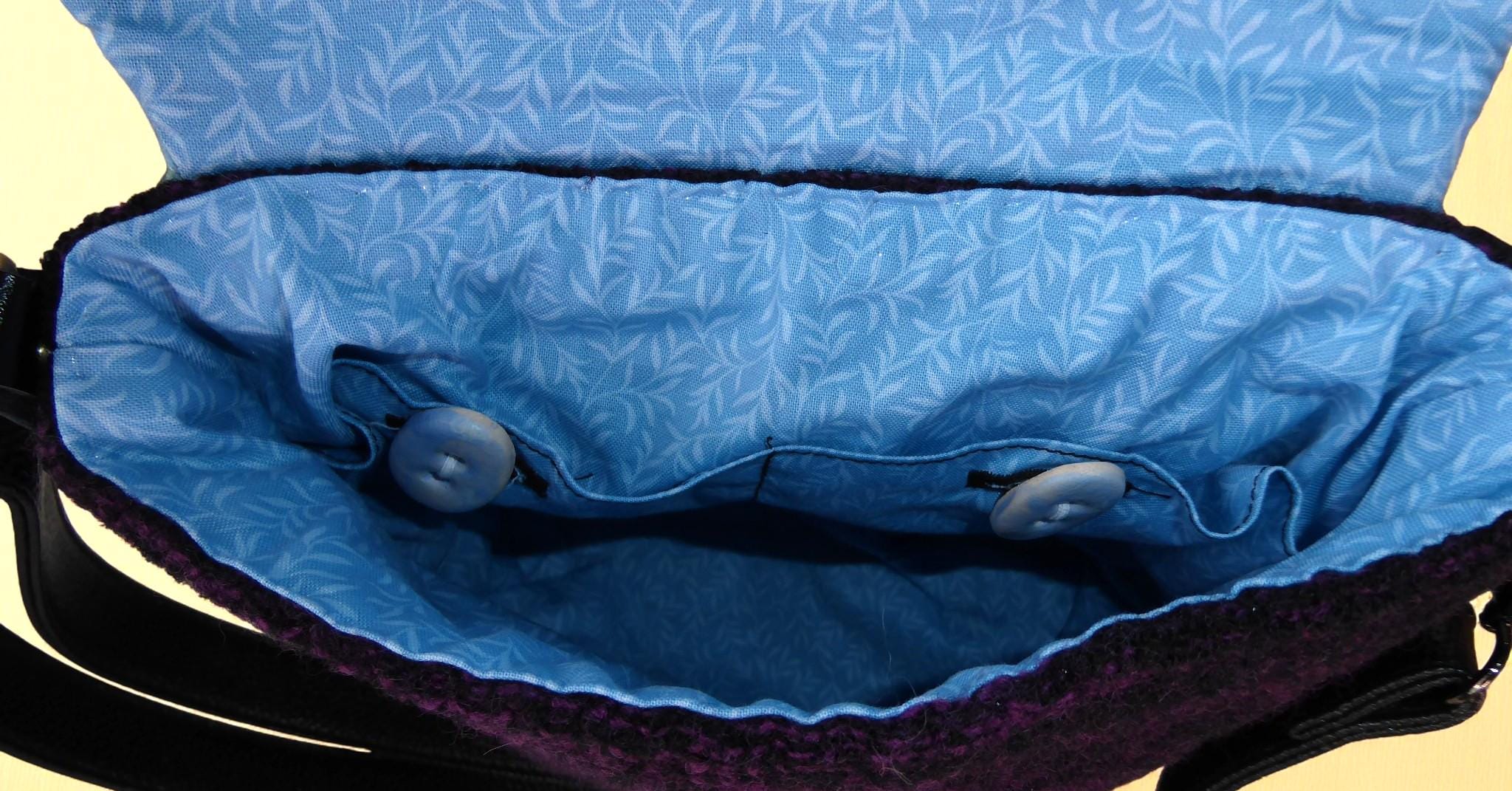 This shoulder bag is fully lined, with pockets and hand-made buttons. It has a black detachable P.U. leather strap which is 17mm wide. The strap can be extended from 100cm to 120cm.