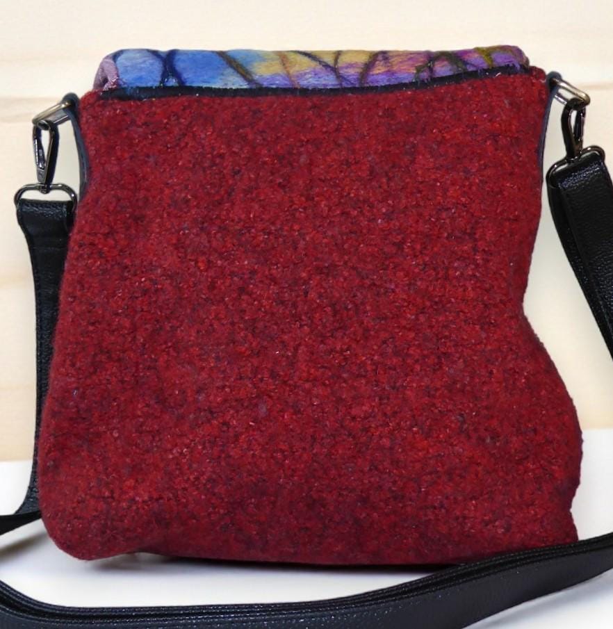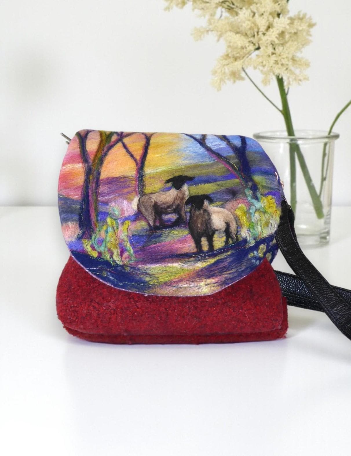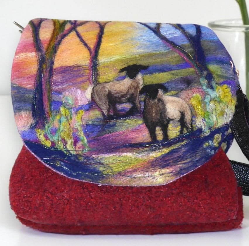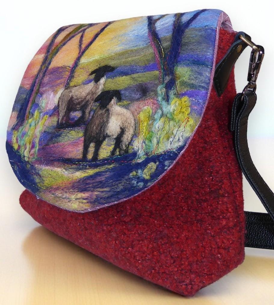 The bag has a flap with a wet-felted background onto which I have needle-felted two sheep. I have added embroidery to give some added definition.