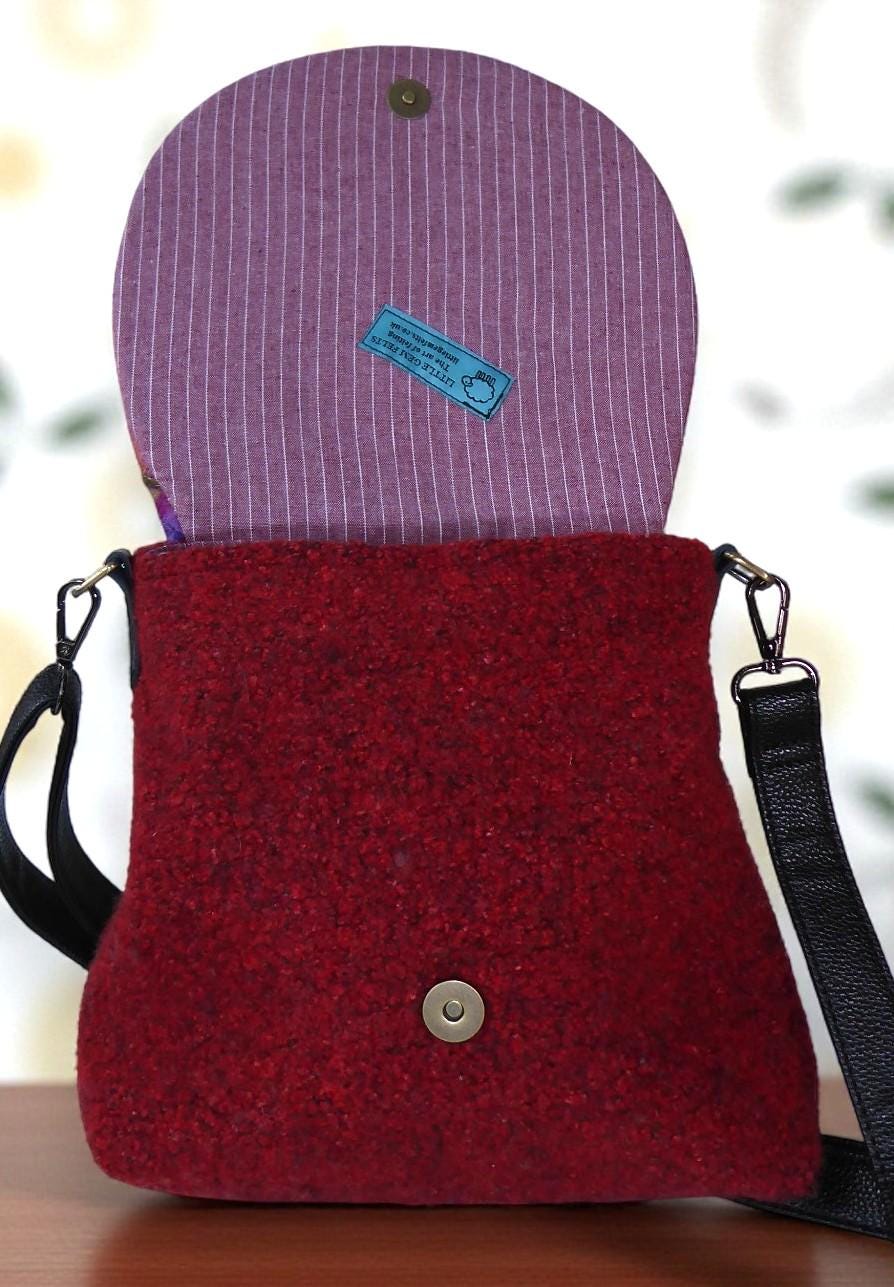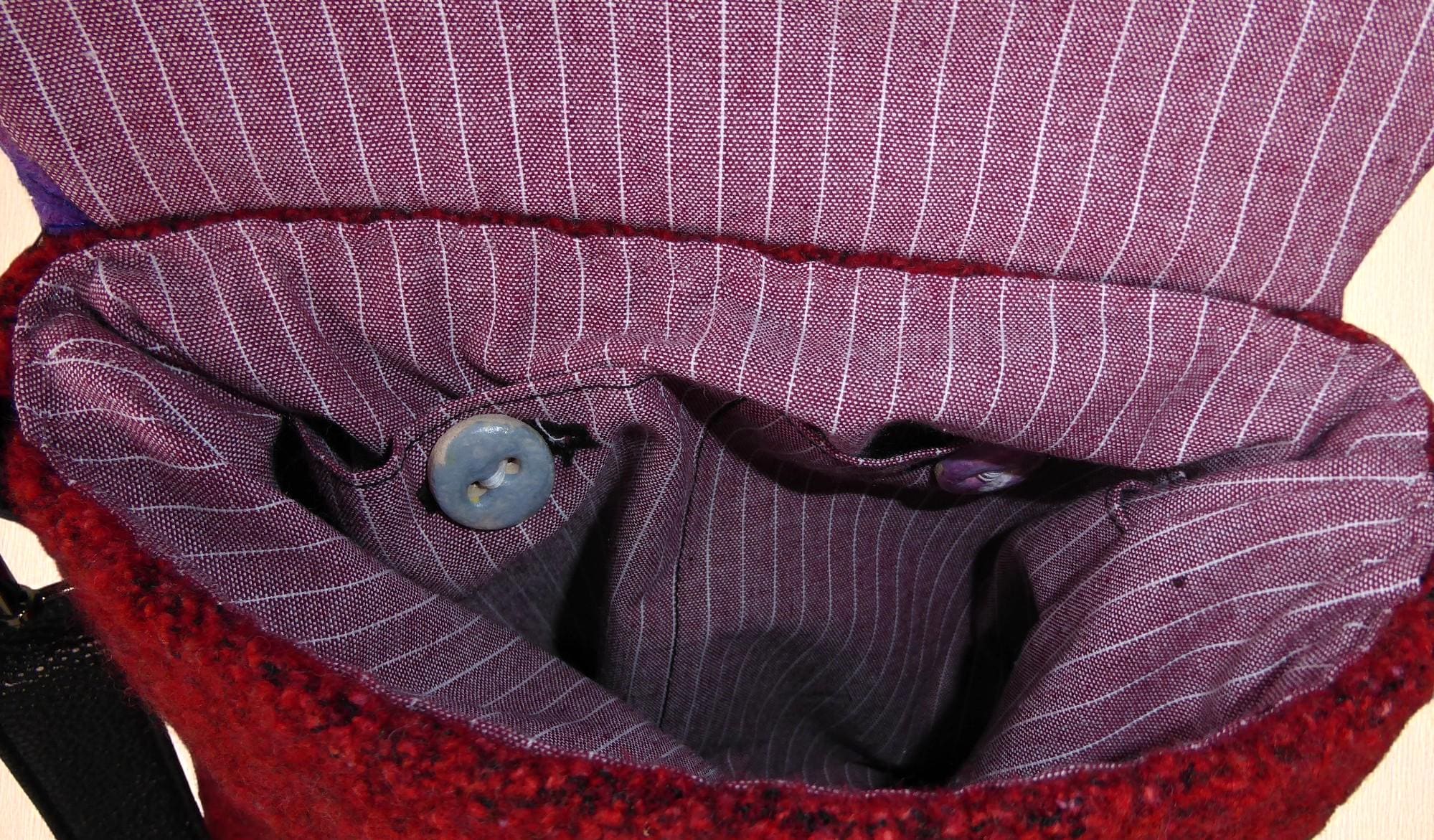 This shoulder bag is fully lined, with pockets and hand-made buttons. It has a black detachable P.U. leather strap which is 17mm wide. The strap can be extended from 100cm to 120cm.