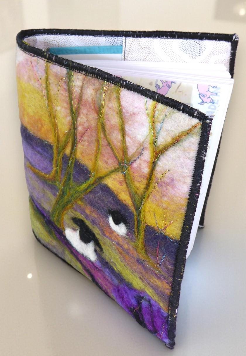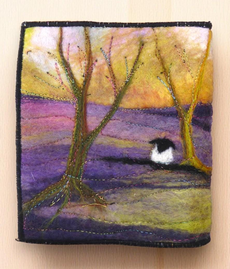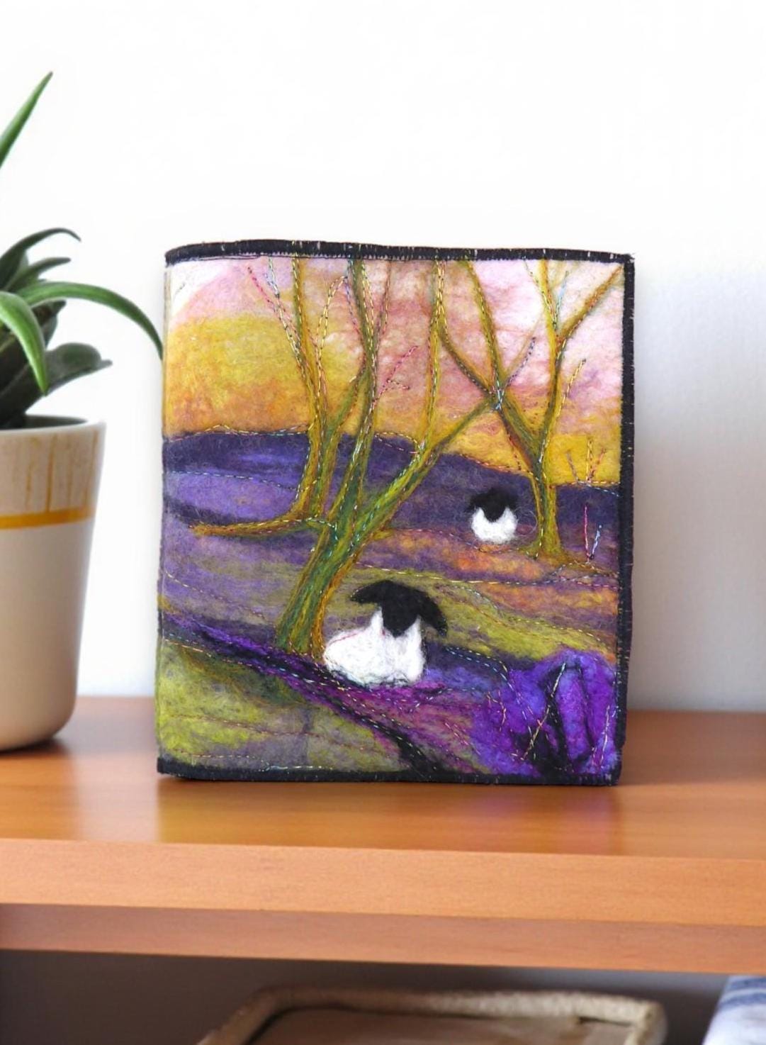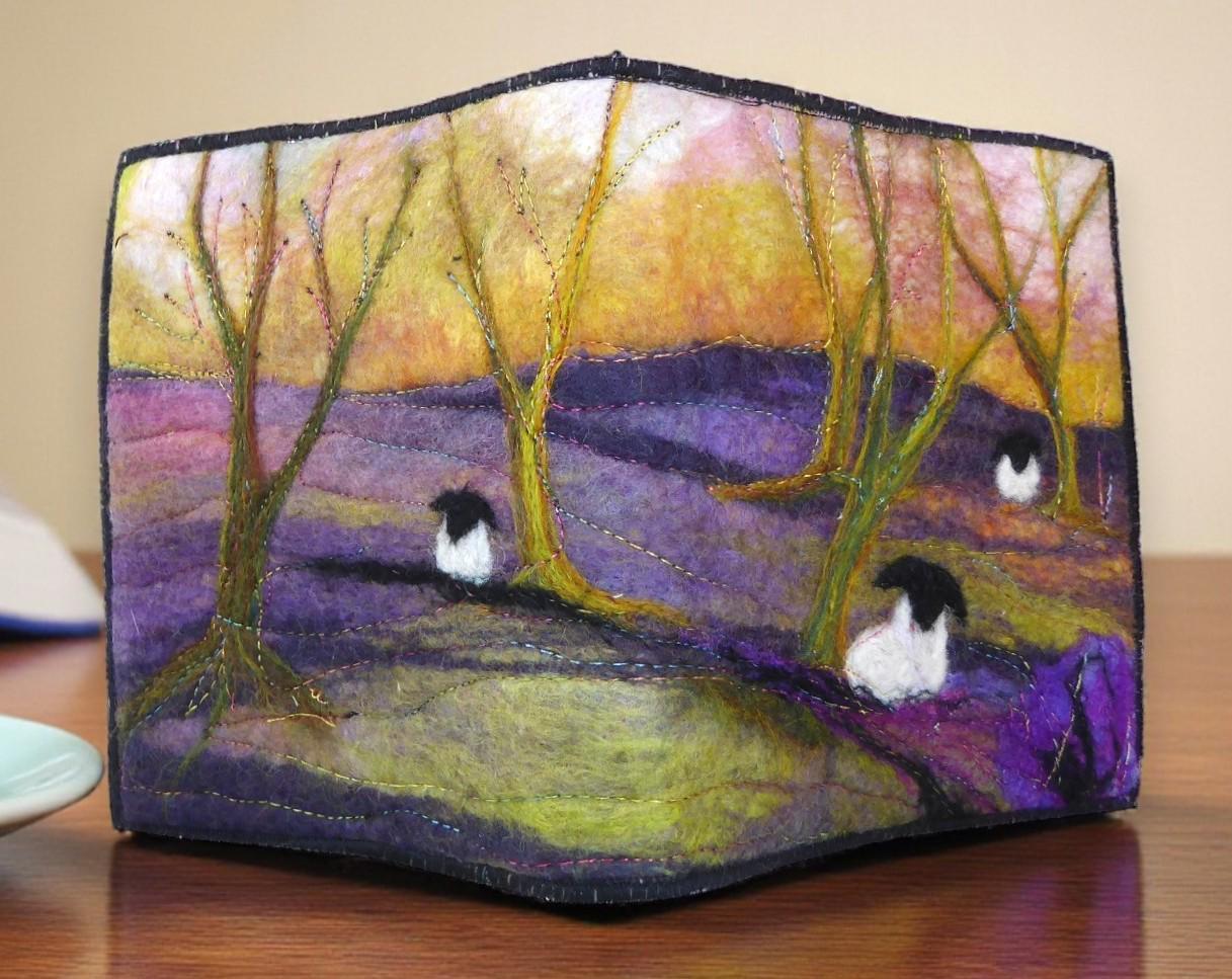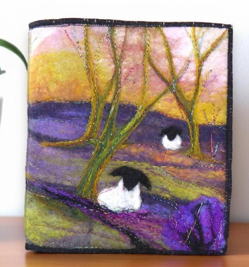 To make this book, I needle-felted some sheep onto a wet-felted background. I then added embroidery and beads for added detail.