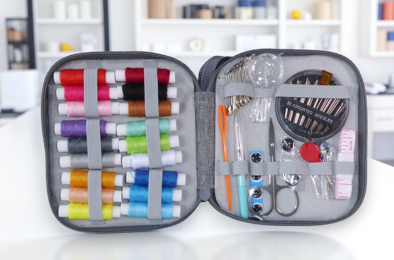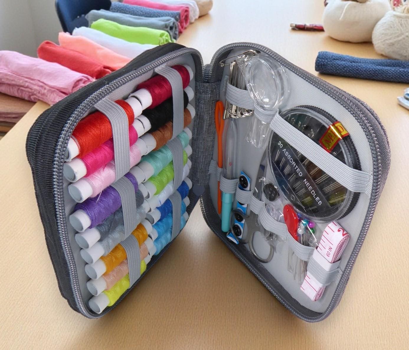 Inside are a selection of coloured threads, safety pins, needles tape measure and much more.