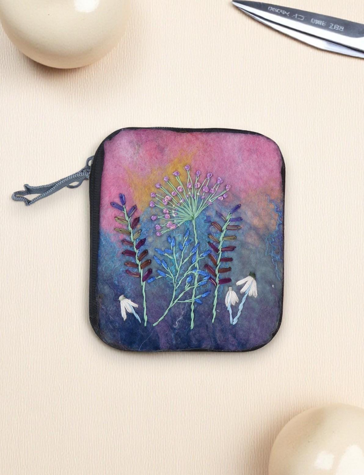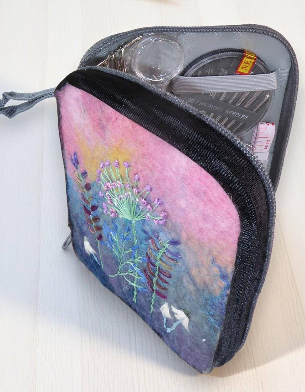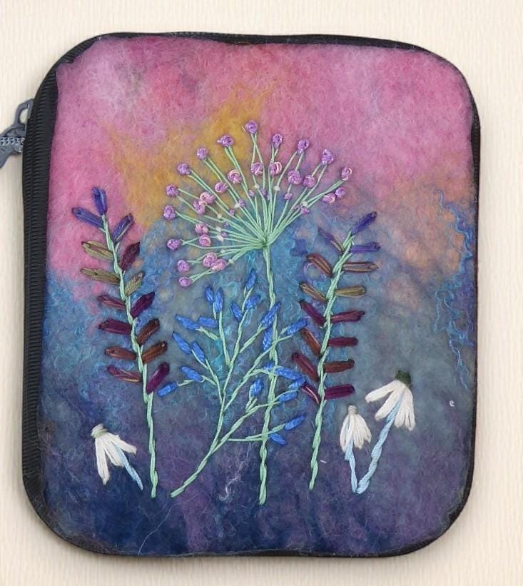The design has been embroidered onto a wet-felted background. Some of the fibres have been dyed by me. When the picture is finished I do free machine embroidery on it to increase the detail.