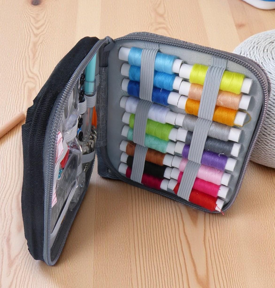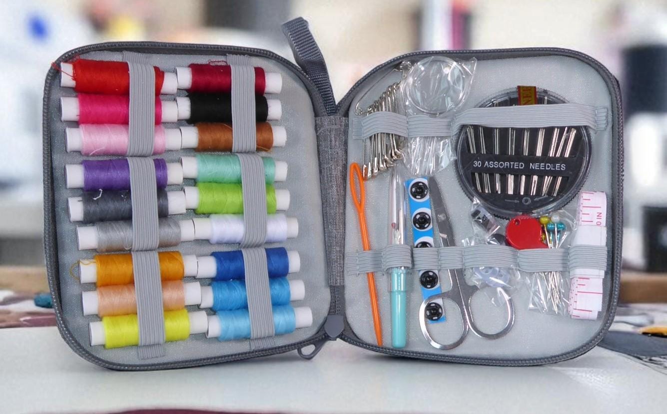 Inside are a selection of coloured threads, safety pins, needles tape measure and much more.