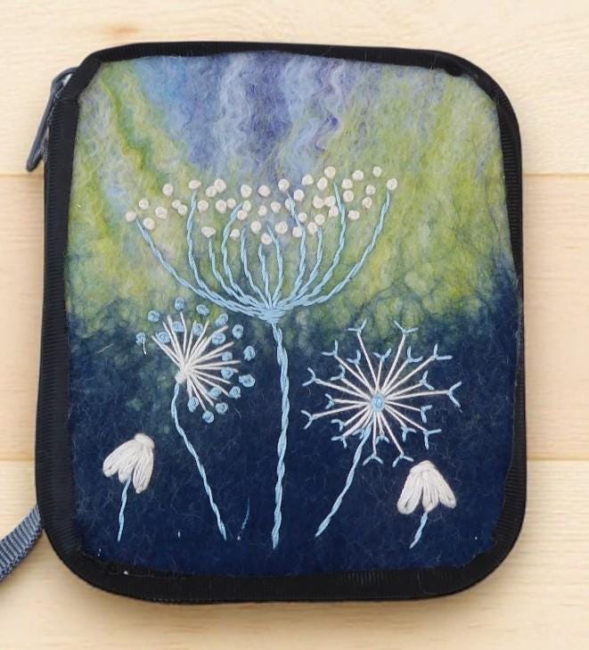 The design has been embroidered onto a wet-felted background. Some of the fibres have been dyed by me.
