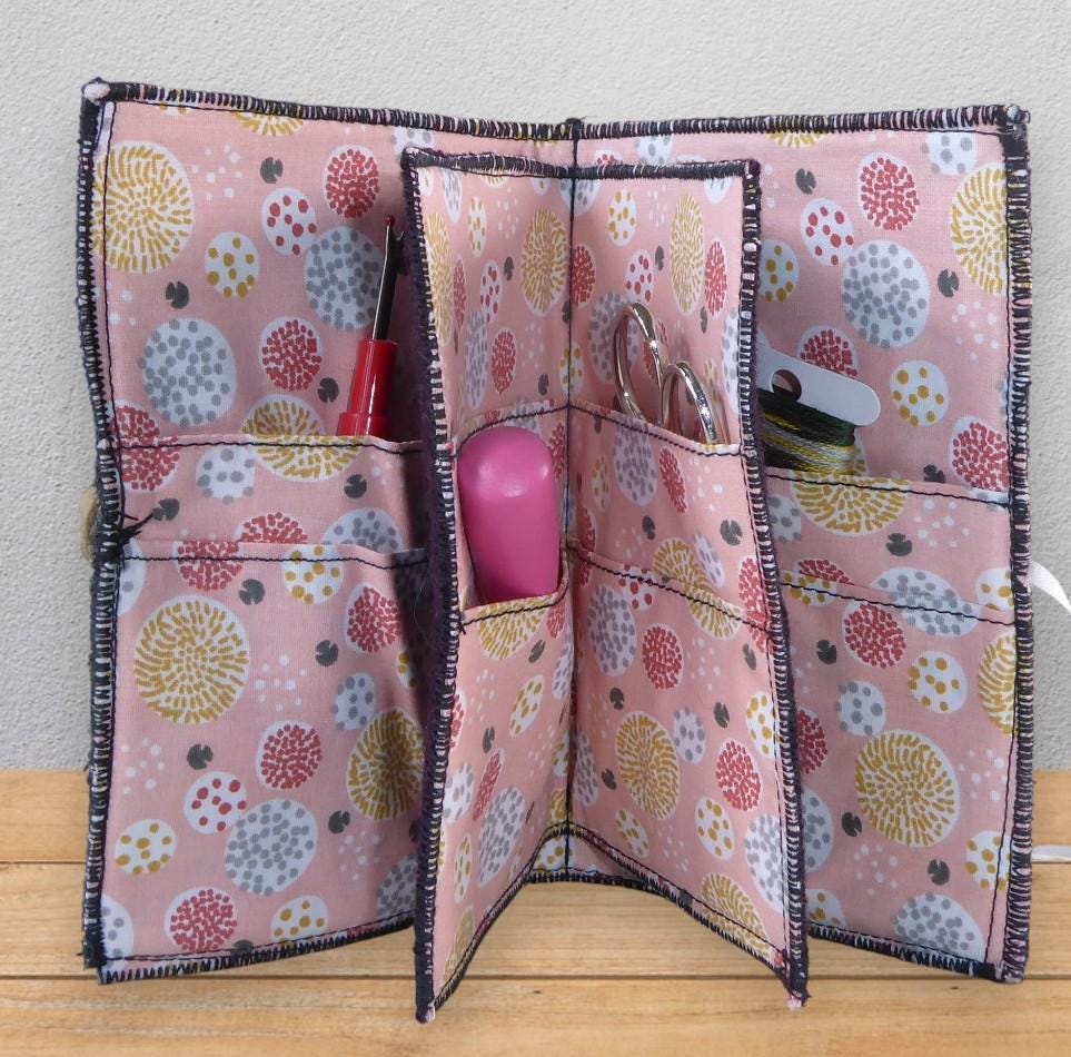 There are 8 pockets inside for needles, pins, tape measure etc. or you could use it for credit and store cards.