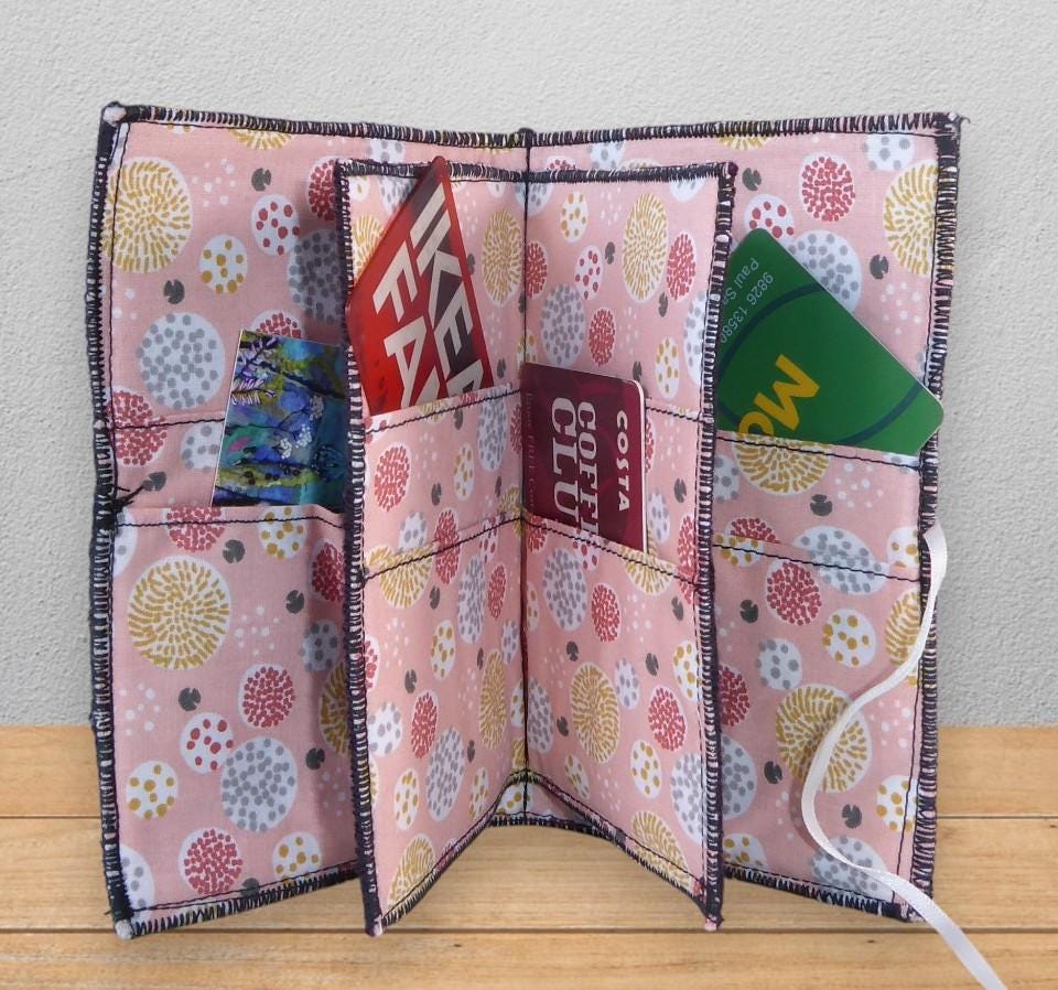 The wallet has a ribbon closure. It is 15cm x 10 cm (6" x 4") which is small enough to slip into your handbag or pocket.
