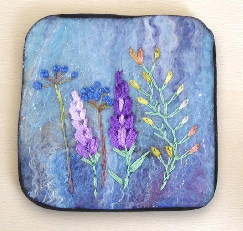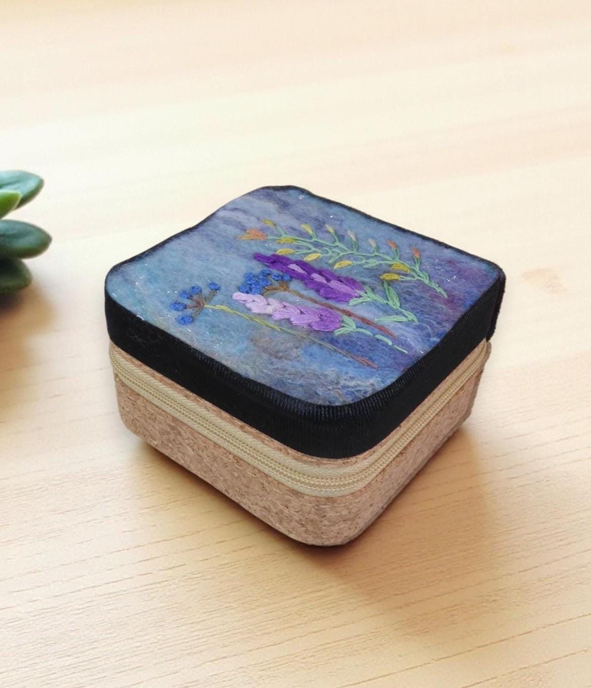 The body is made from cork and the top features an embroidered floral design on a wet-felted background.