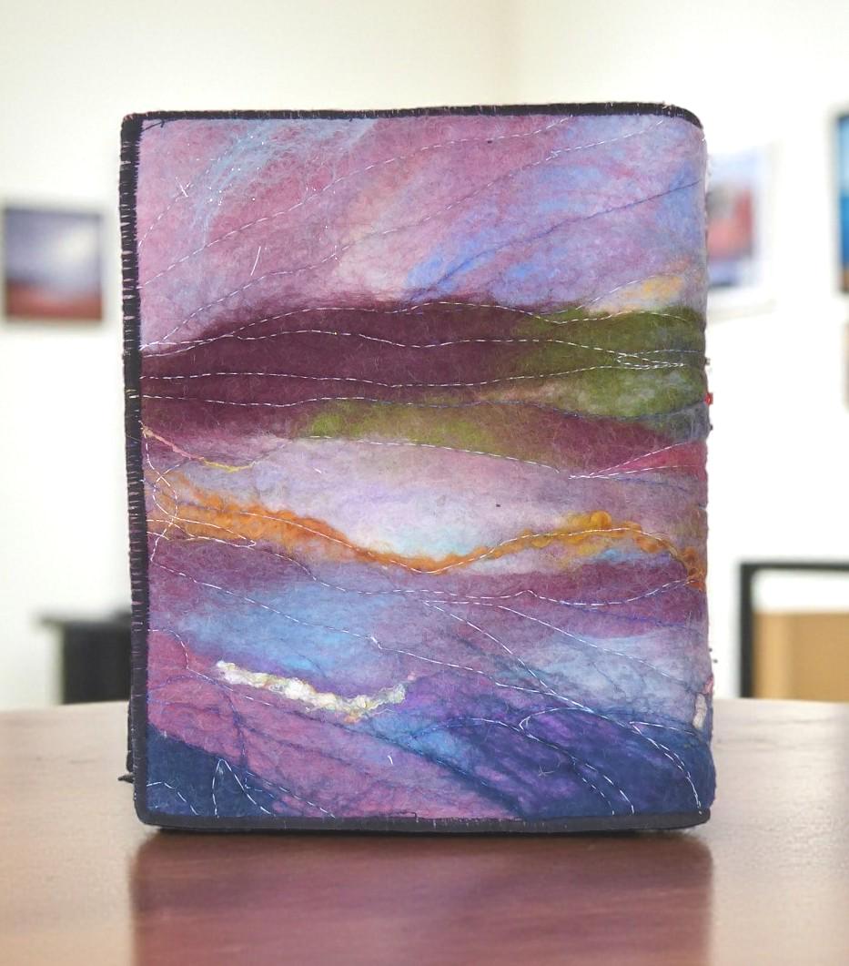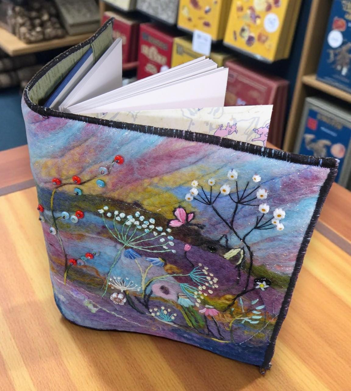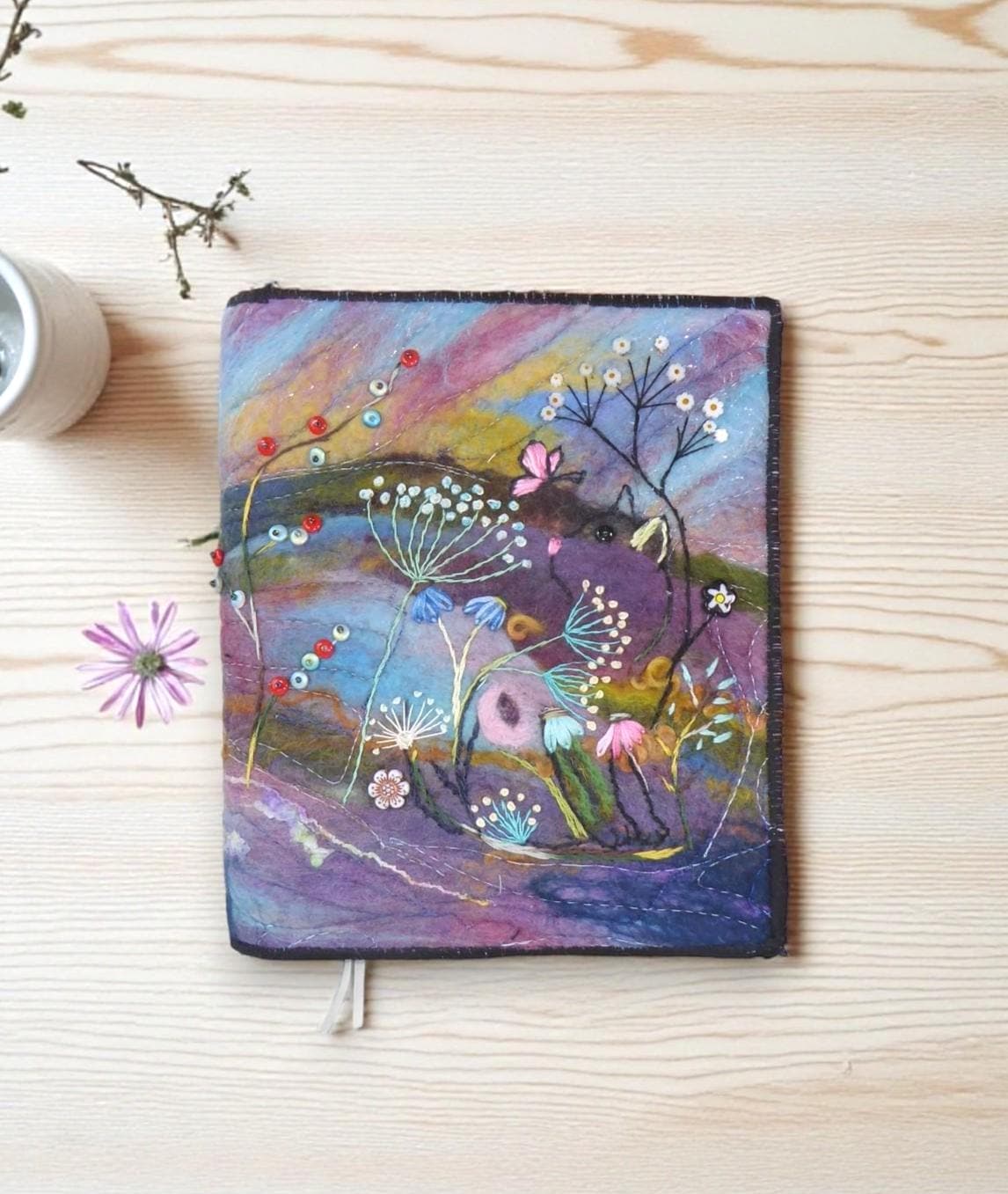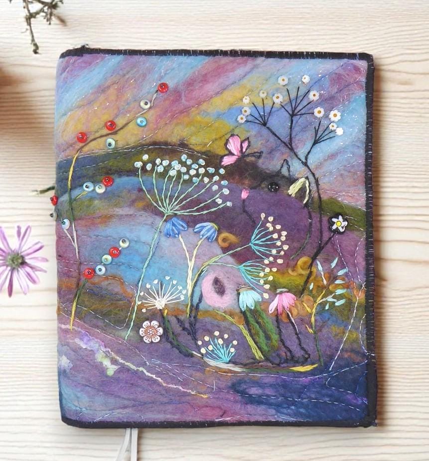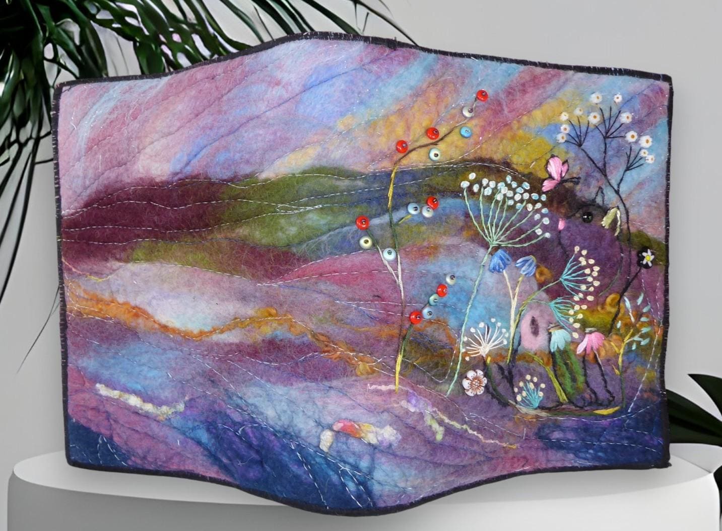 I have embroidered flowers onto a wet-felted background. Onto this, I have added beads and embroidery to give the picture added depth.
