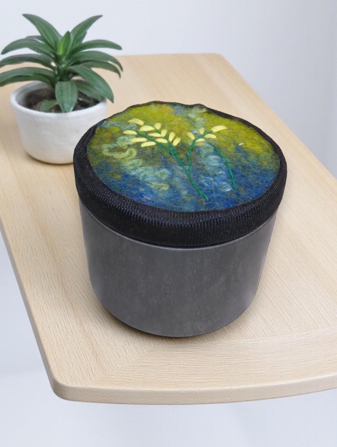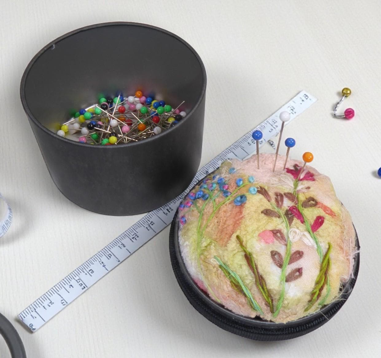With the lid on, you have a tin for your pins with a felted design on the lid.