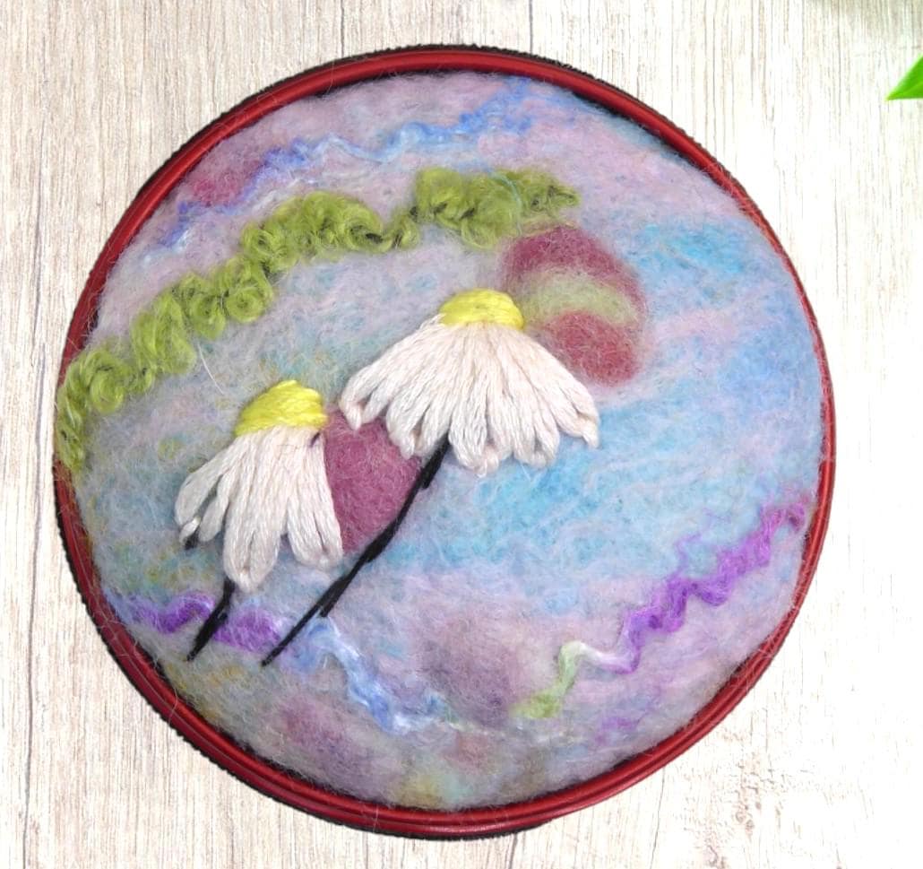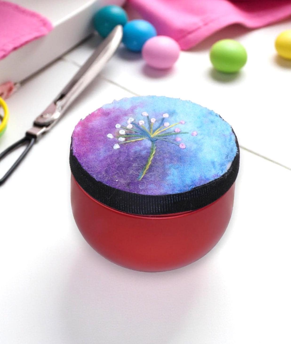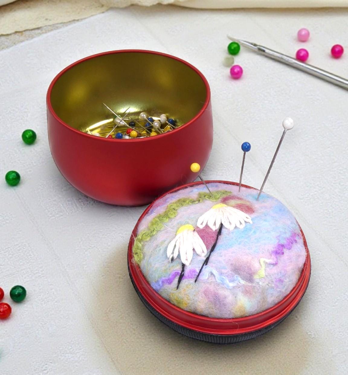 With the lid on, you have a tin for your pins with a felted design on the lid.