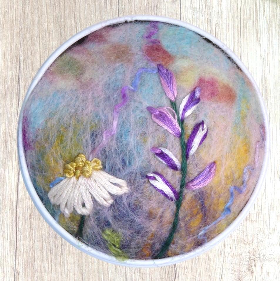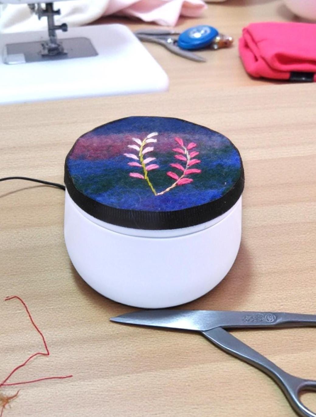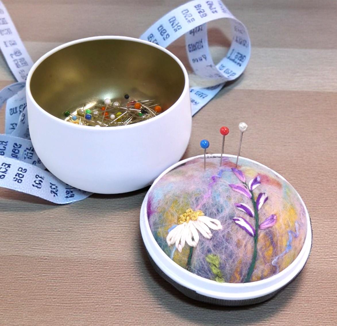 With the lid on, you have a tin for your pins with a felted design on the lid.