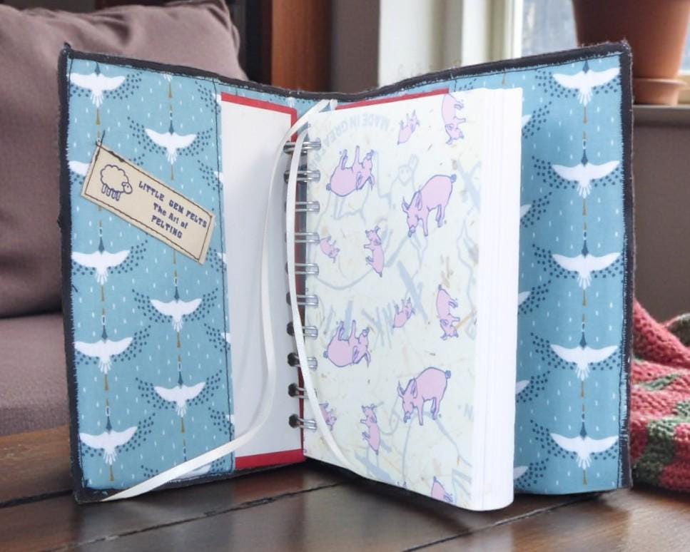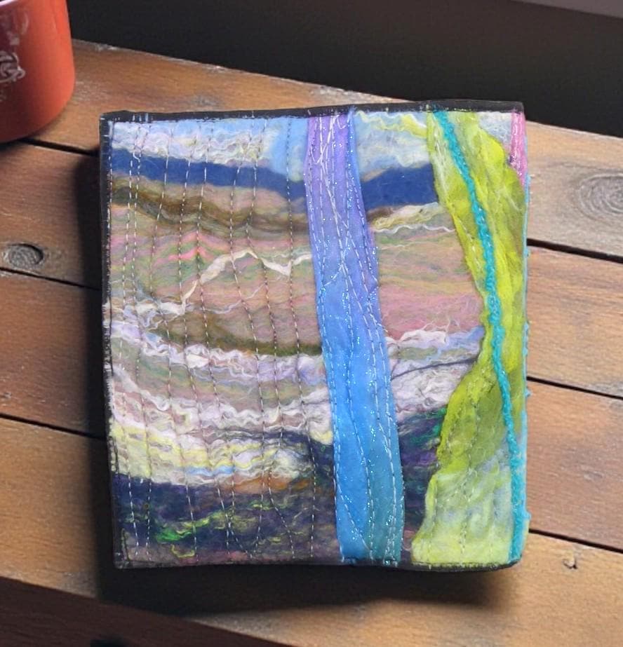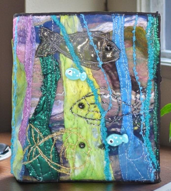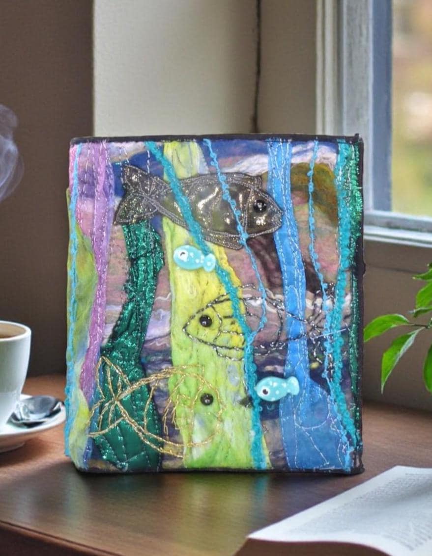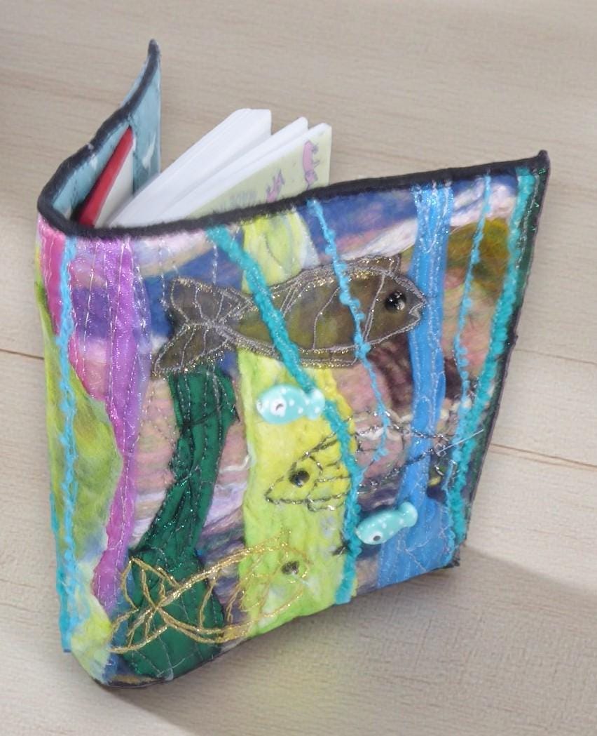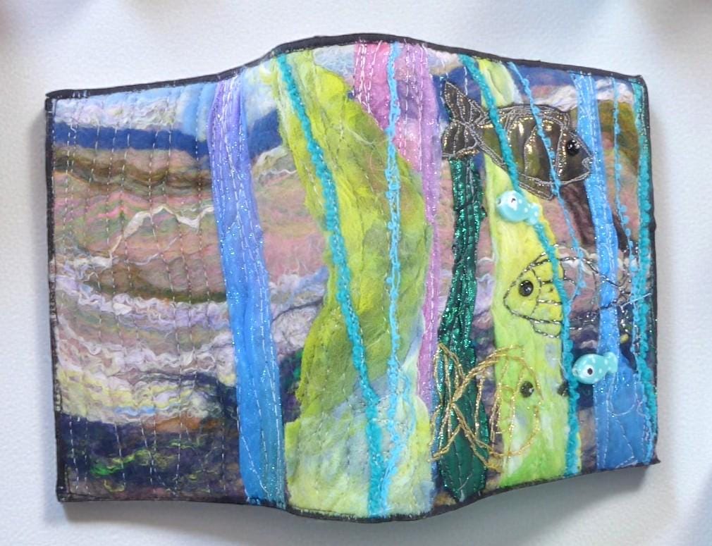 To make this book, I needle-felted some fish onto a needle-felted background. I then added embroidery and beads for added detail.