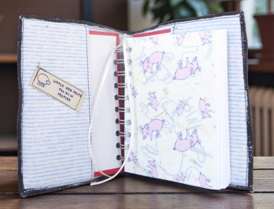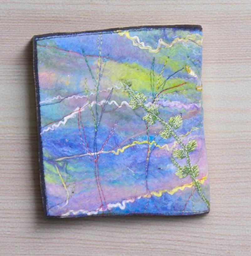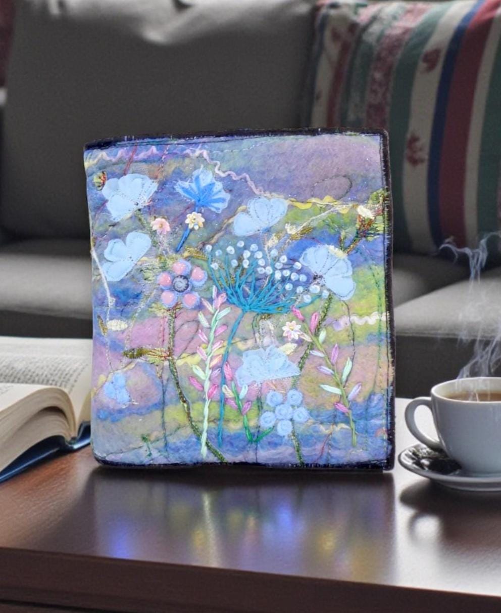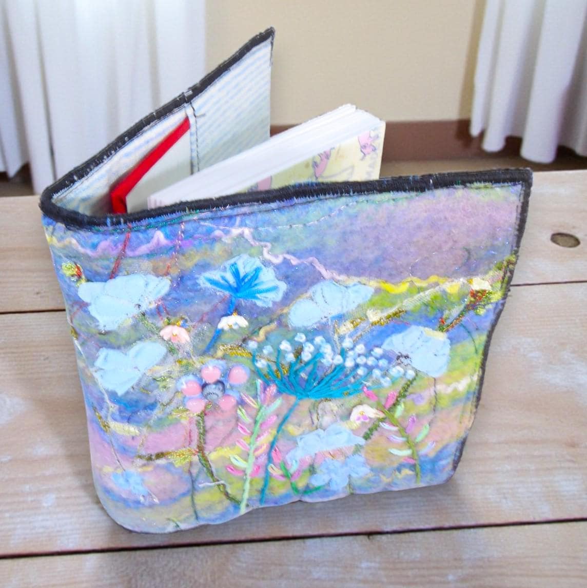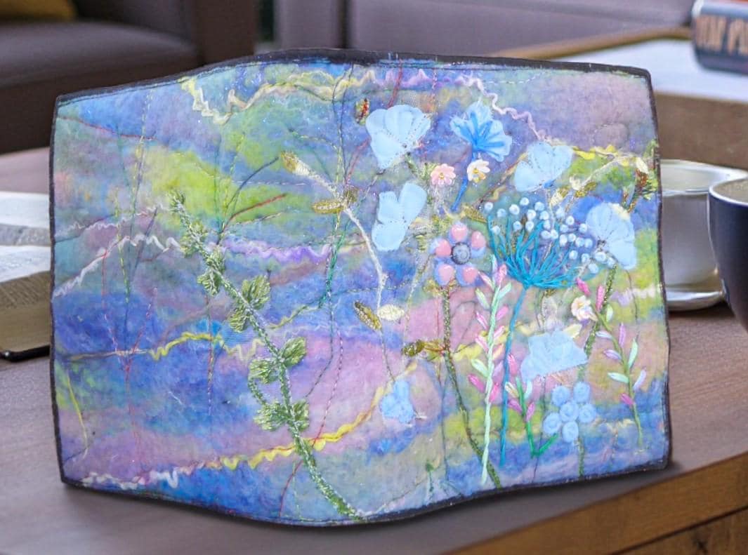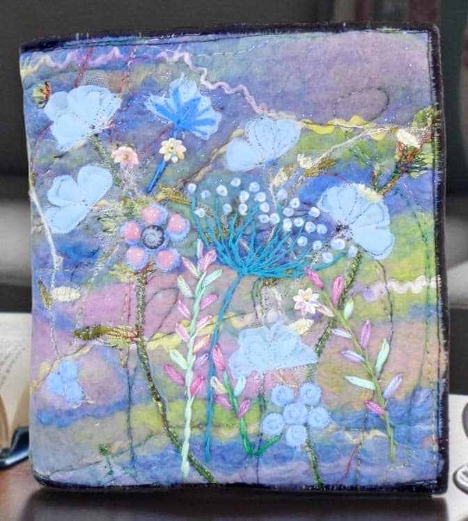 To make this book, I sewed and embroidered some flowers a onto a wet-felted background. I then added beads for extra detail.