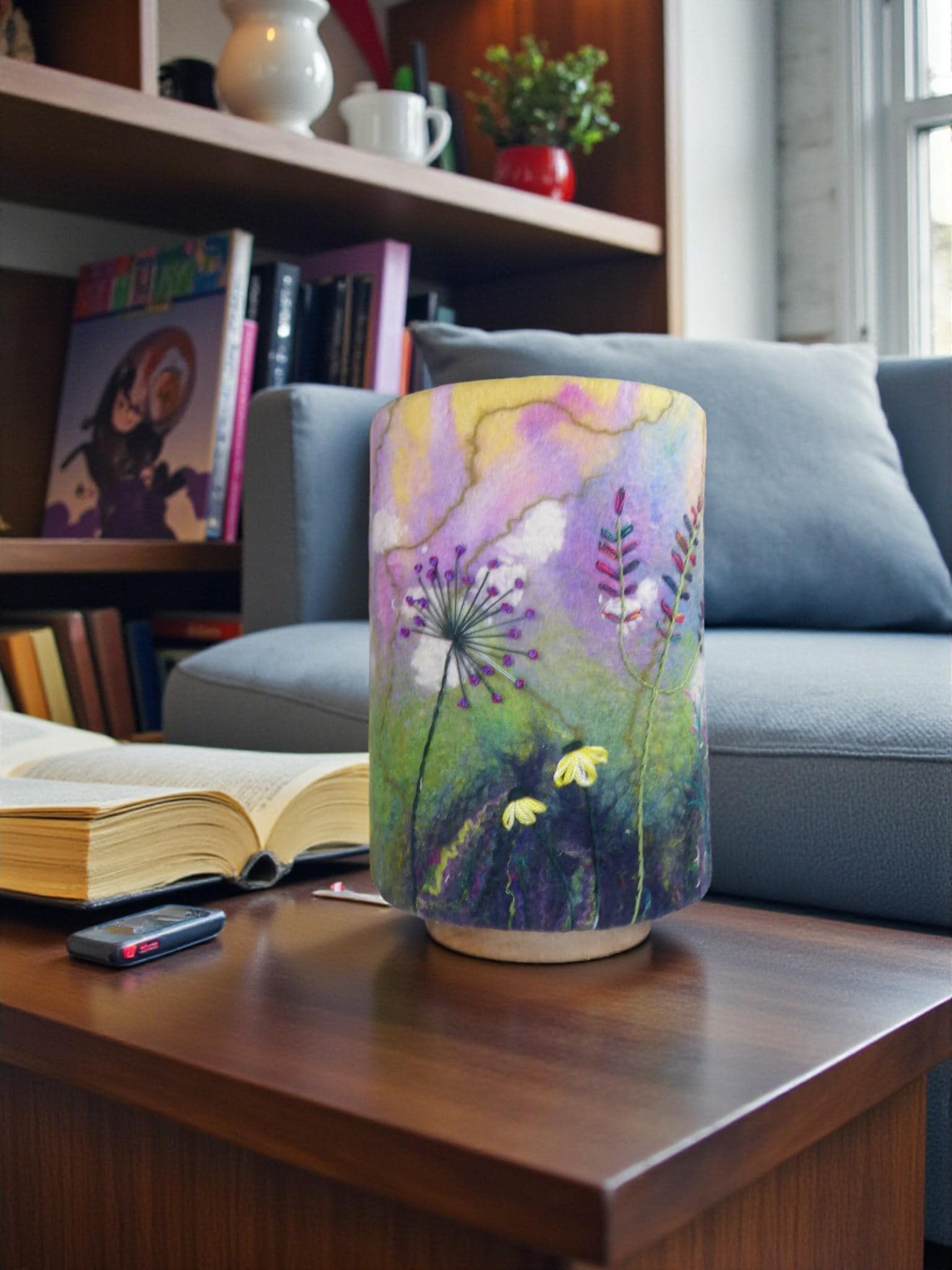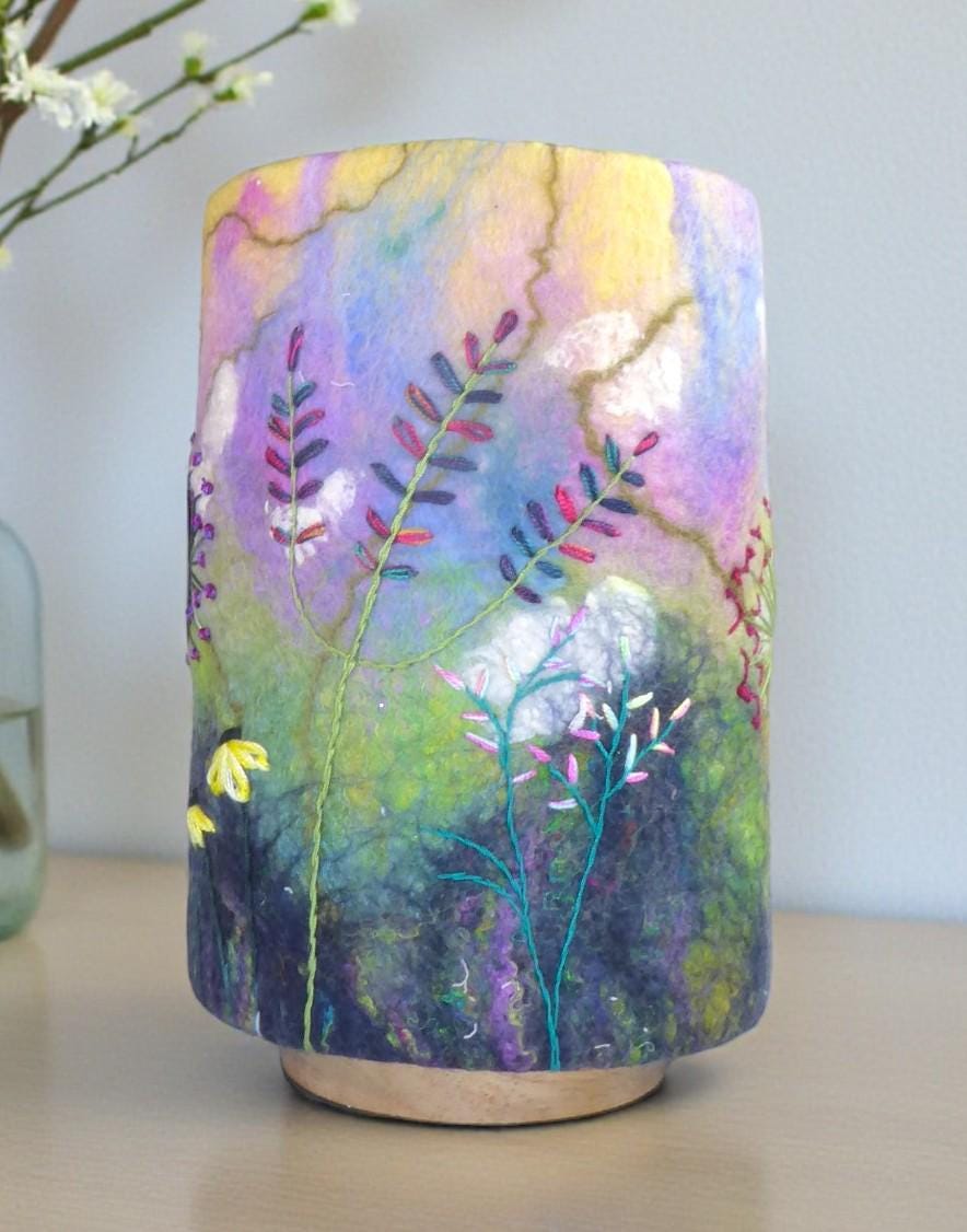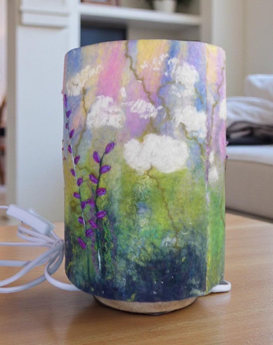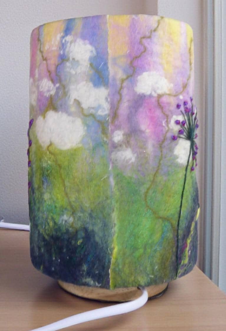 This lamp has a hand-felted shade with a hand-embroidered design and wooden base.