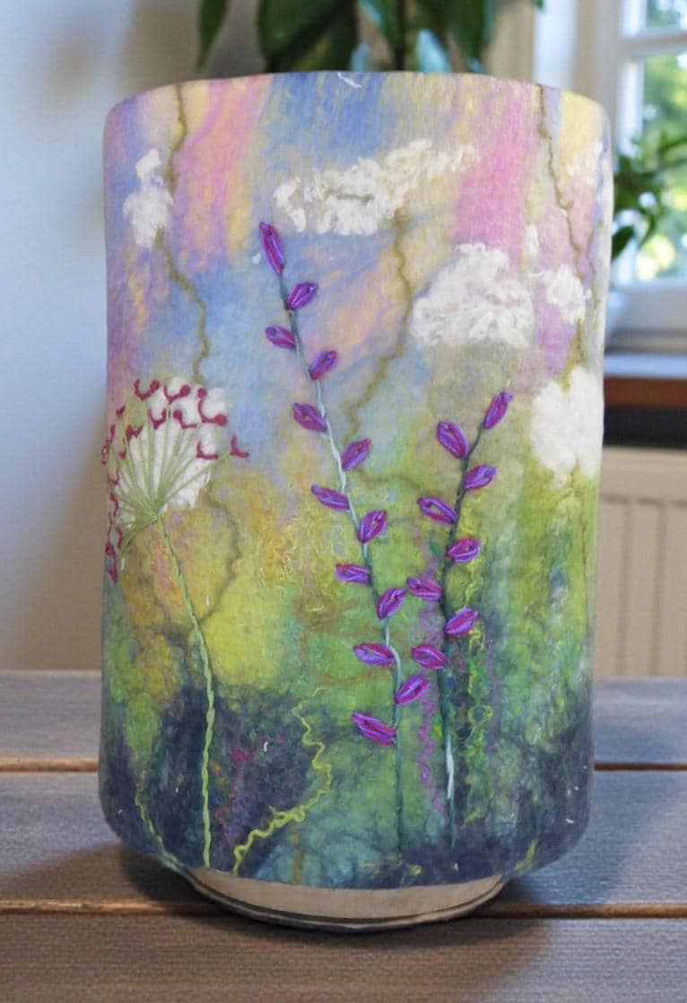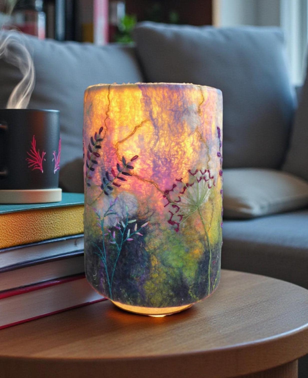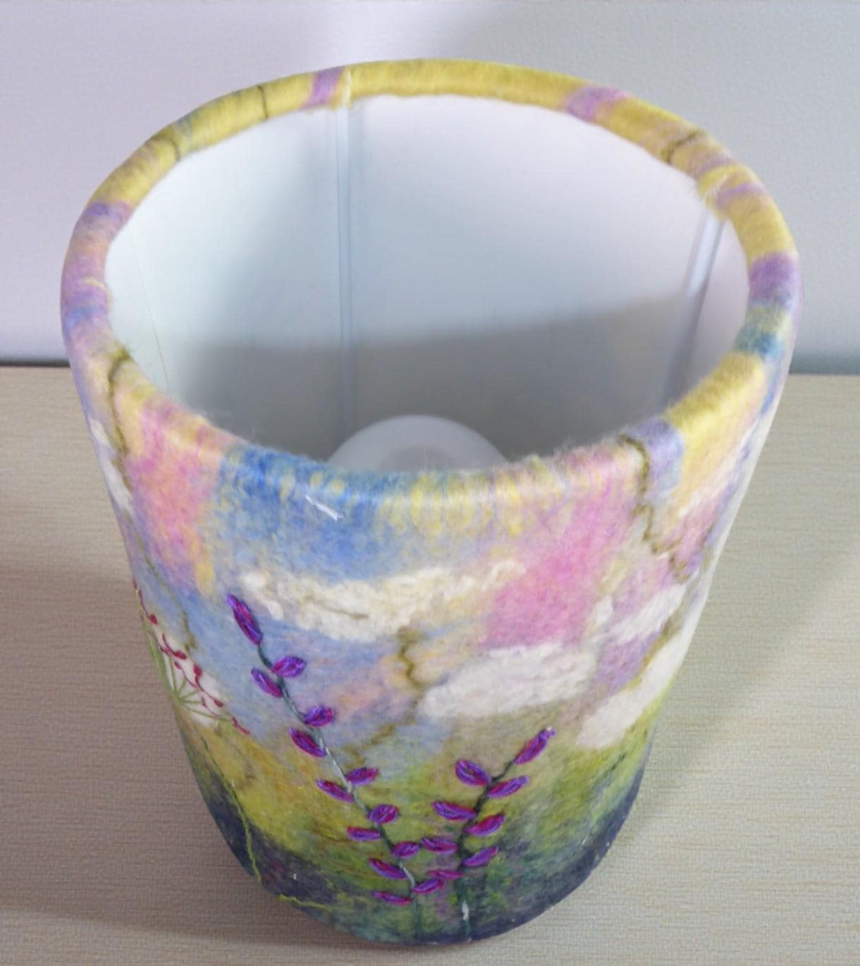 This lamp has a hand-felted shade with a hand-embroidered design and wooden base.