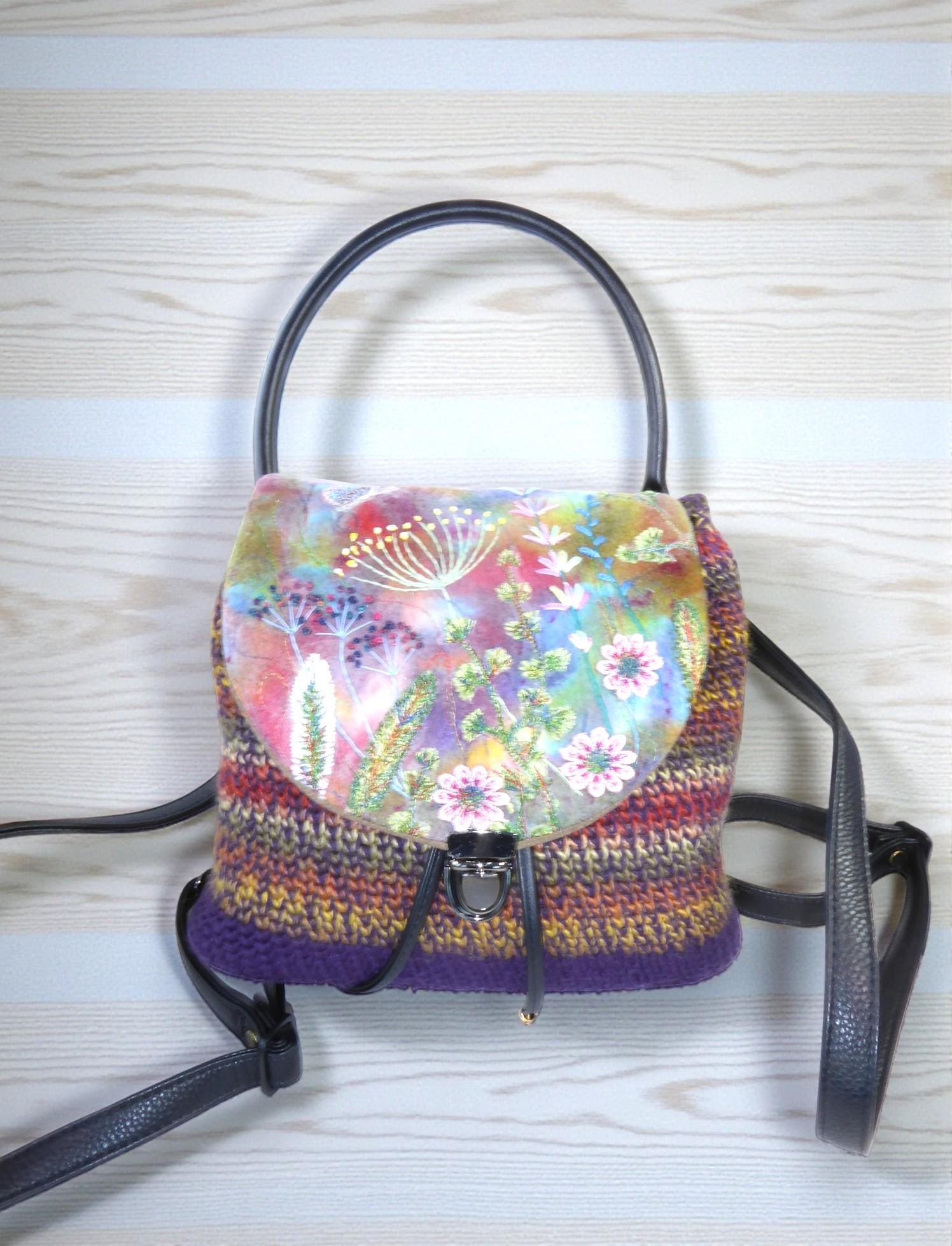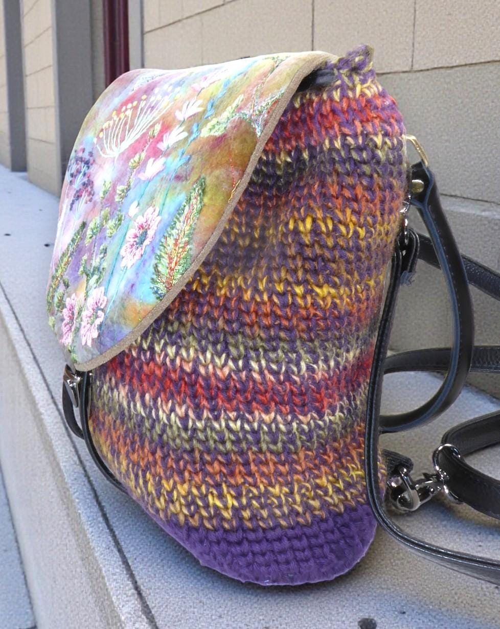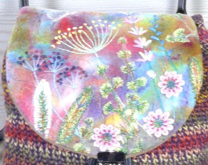 The back-pack has a flap, onto which I have needle-felted flowers. I have then added embroidery to give definition.