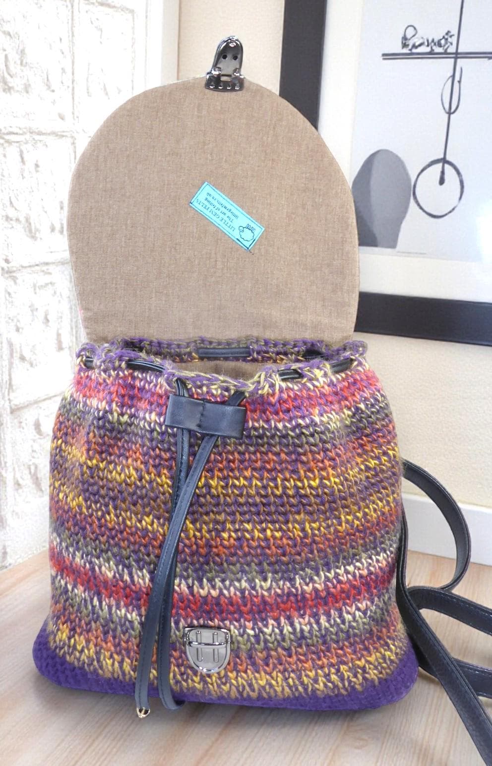 There is a P.U. leather draw-string to close the top and the flap is secured with a magnetic clasp.