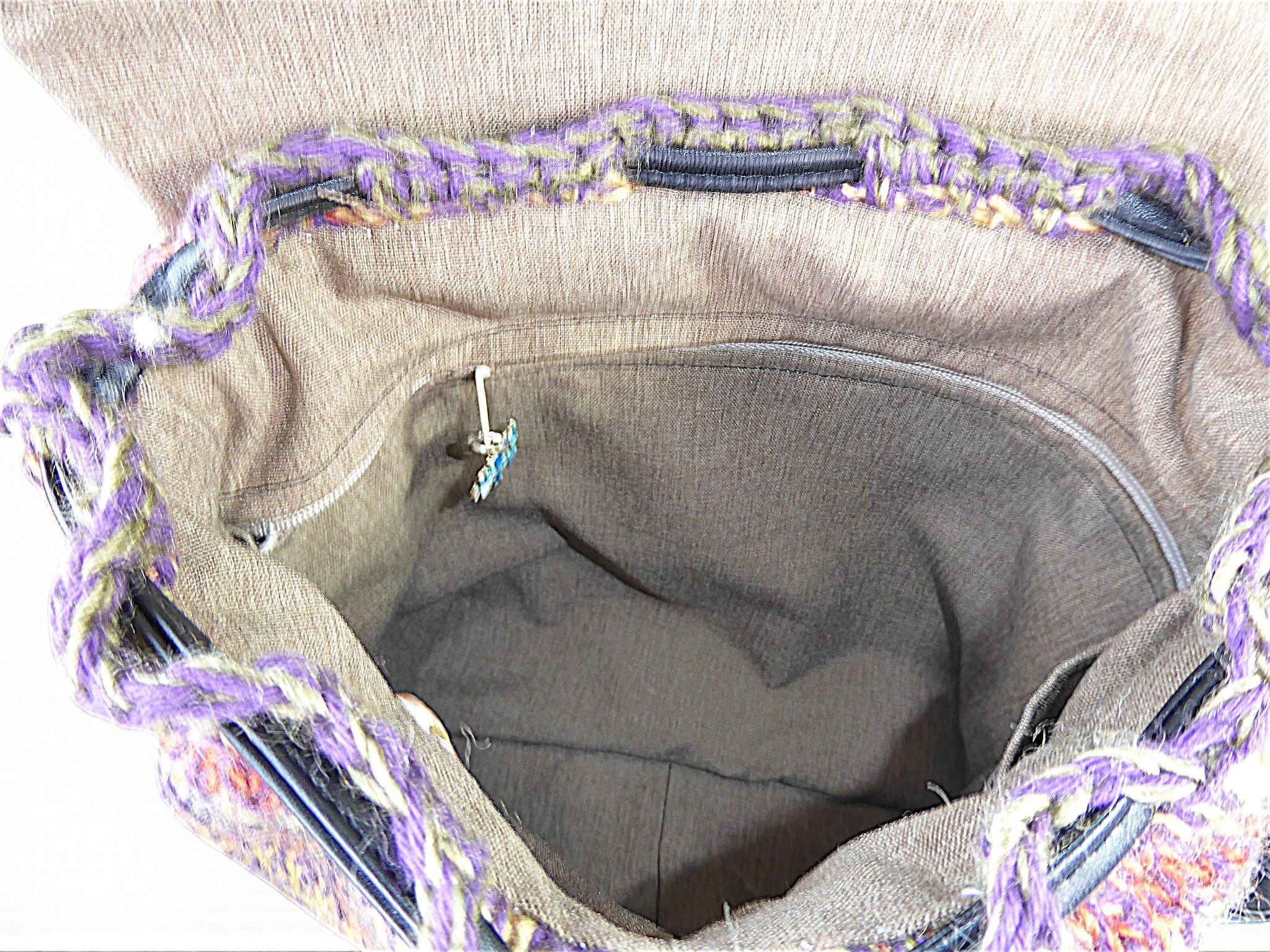 This shoulder back-pack is fully lined and has two buttoned pockets and a zipped pocket inside. The buttons are hand-made ceramic.