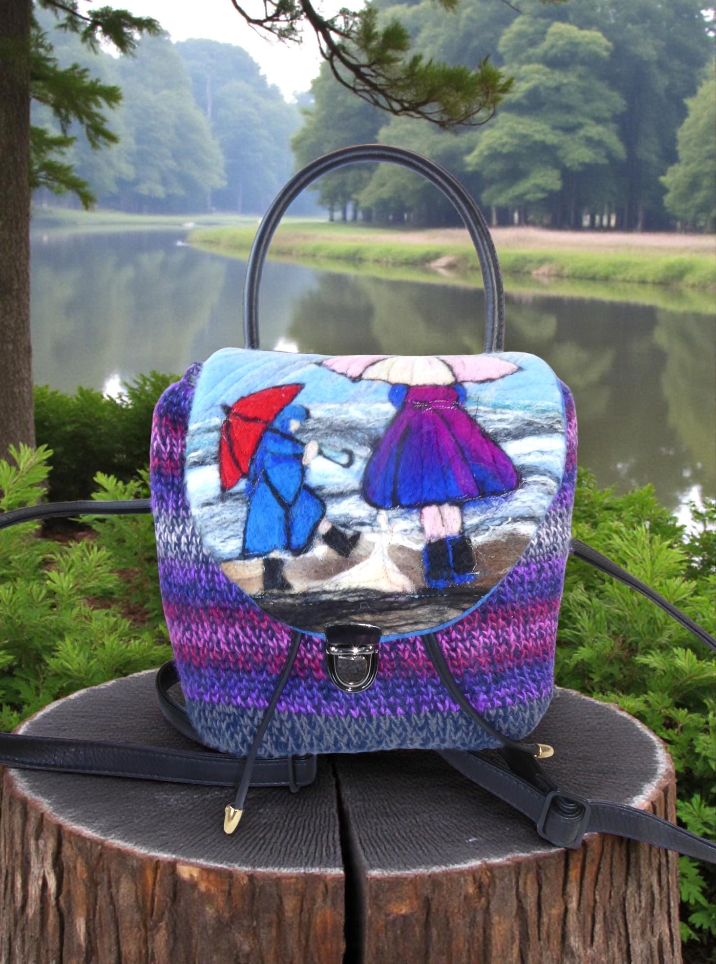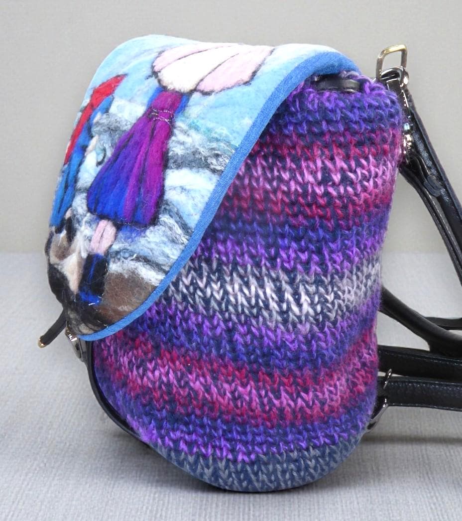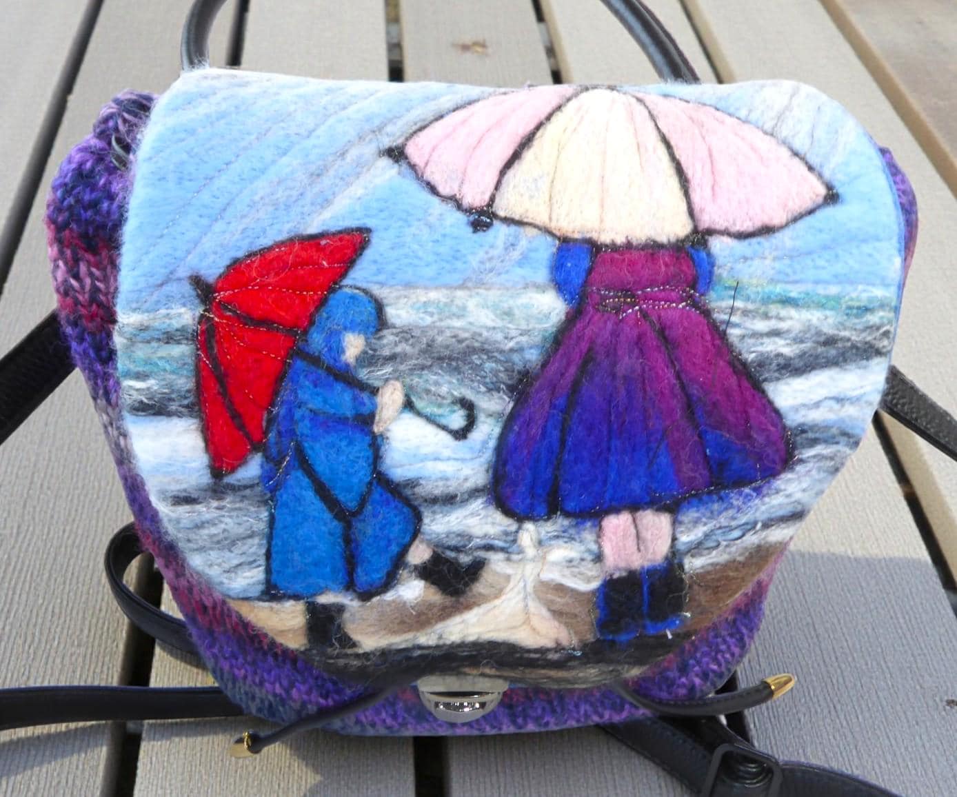 The back-pack has a flap, onto which I have needle-felted a mother and child on the beach in the rain. I have then added embroidery to give definition.