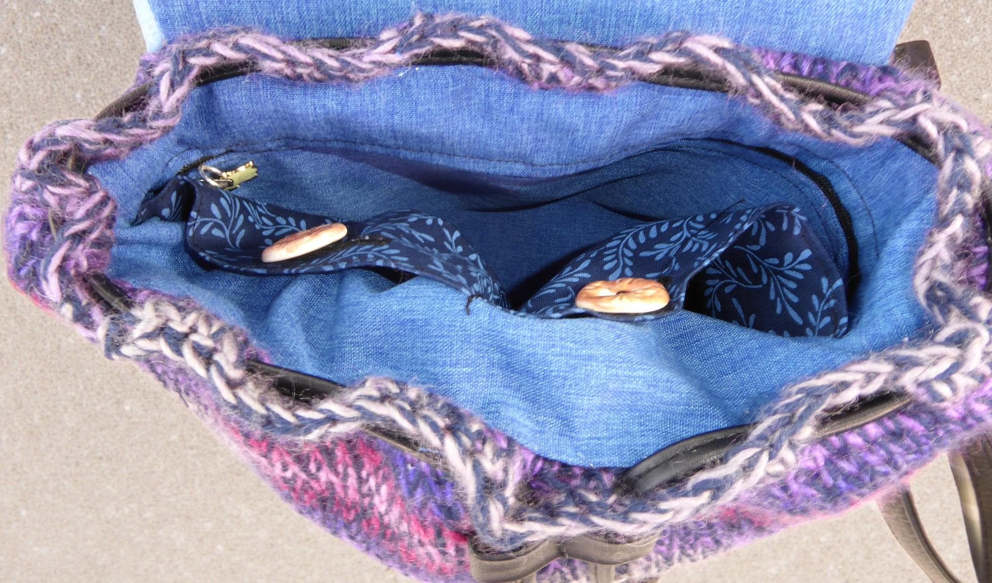 This shoulder back-pack is fully lined and has two buttoned pockets and a zipped pocket inside. The buttons are hand-made ceramic.