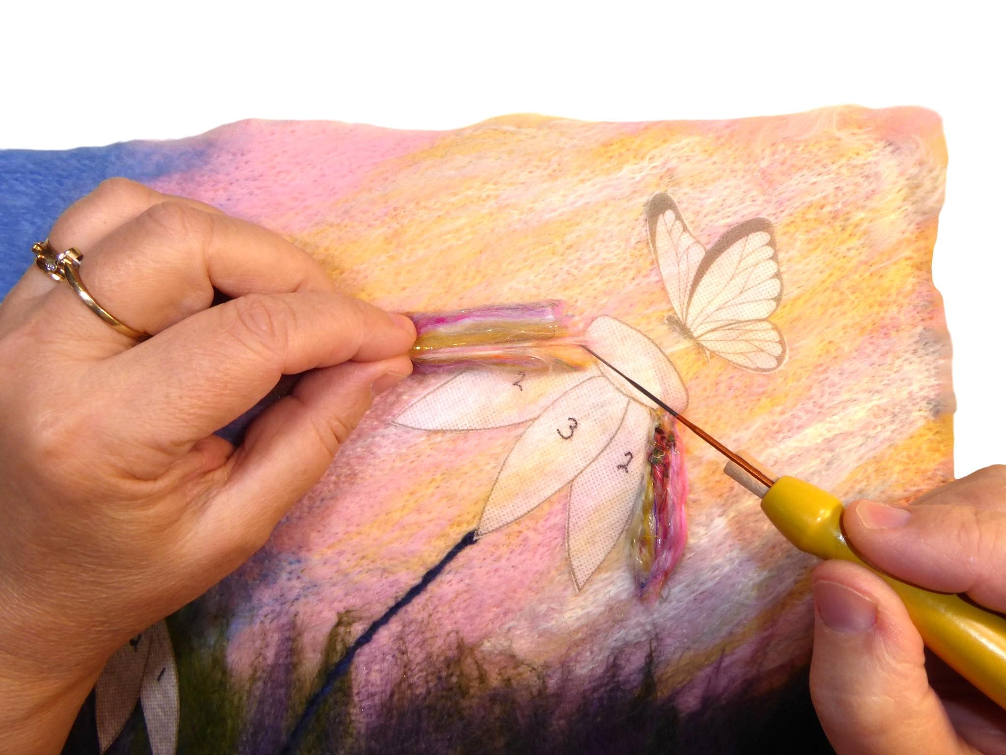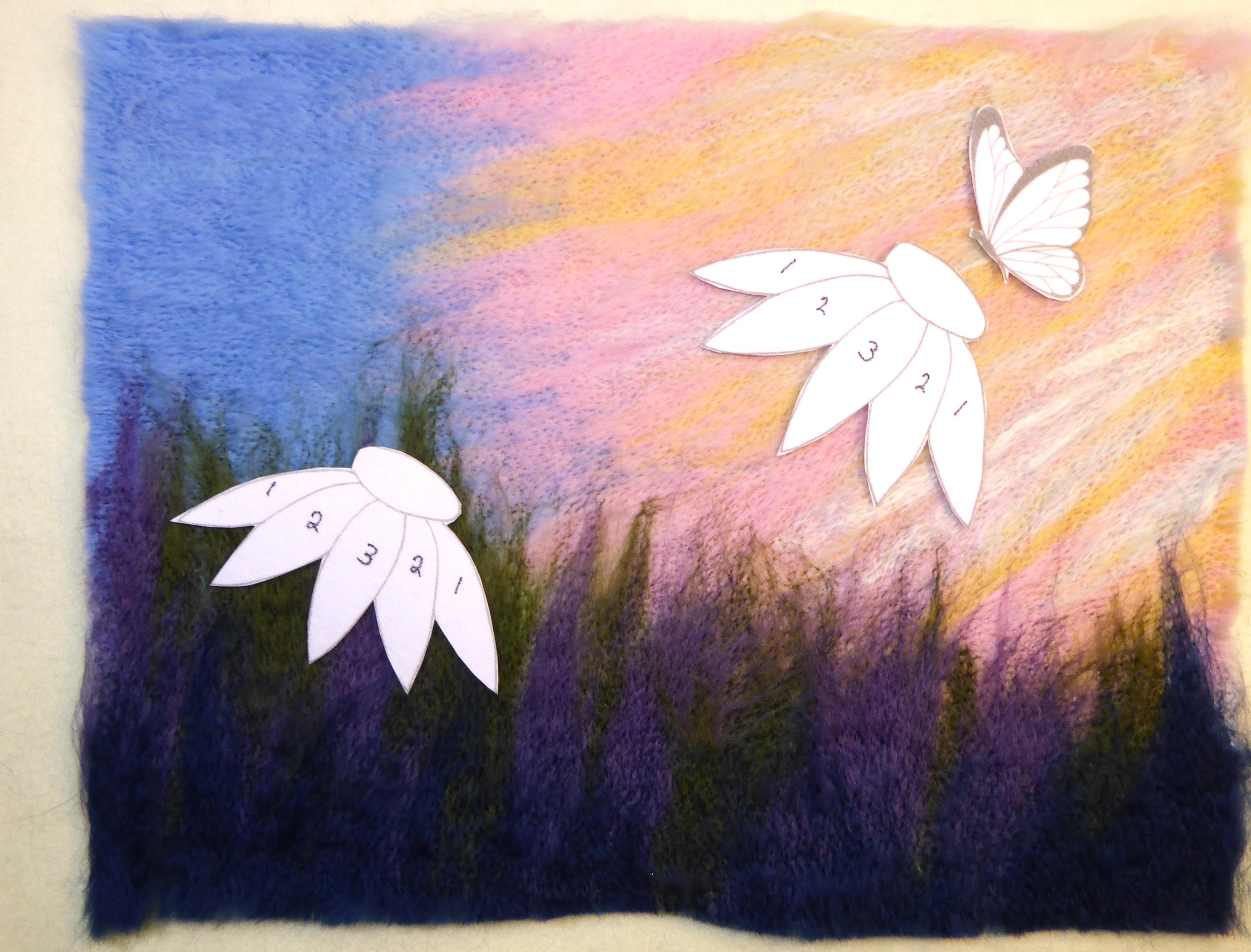The kit contains stick-on templates for the echinaceas and the butterfly. You just stick them onto the background and stab the fibres into the spaces. Everything is explained in the comprehensive instructions which include many colour photos.