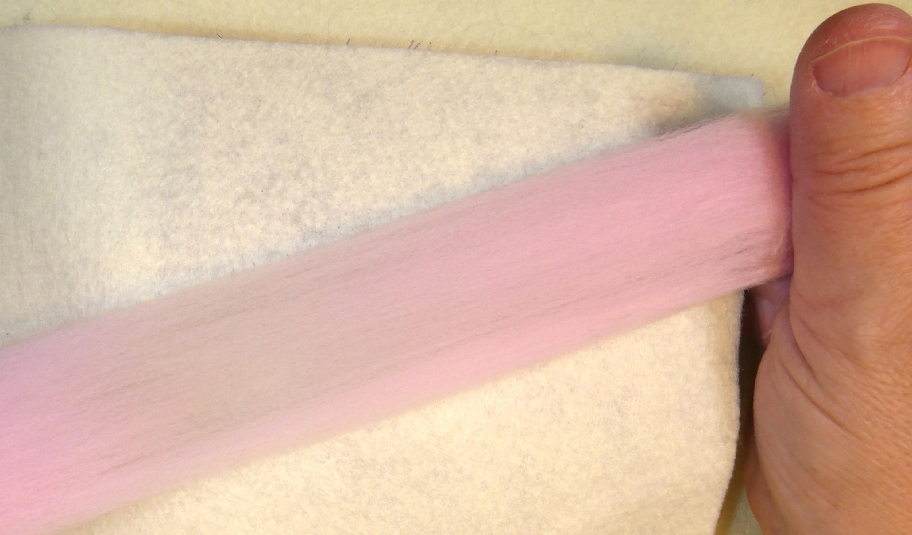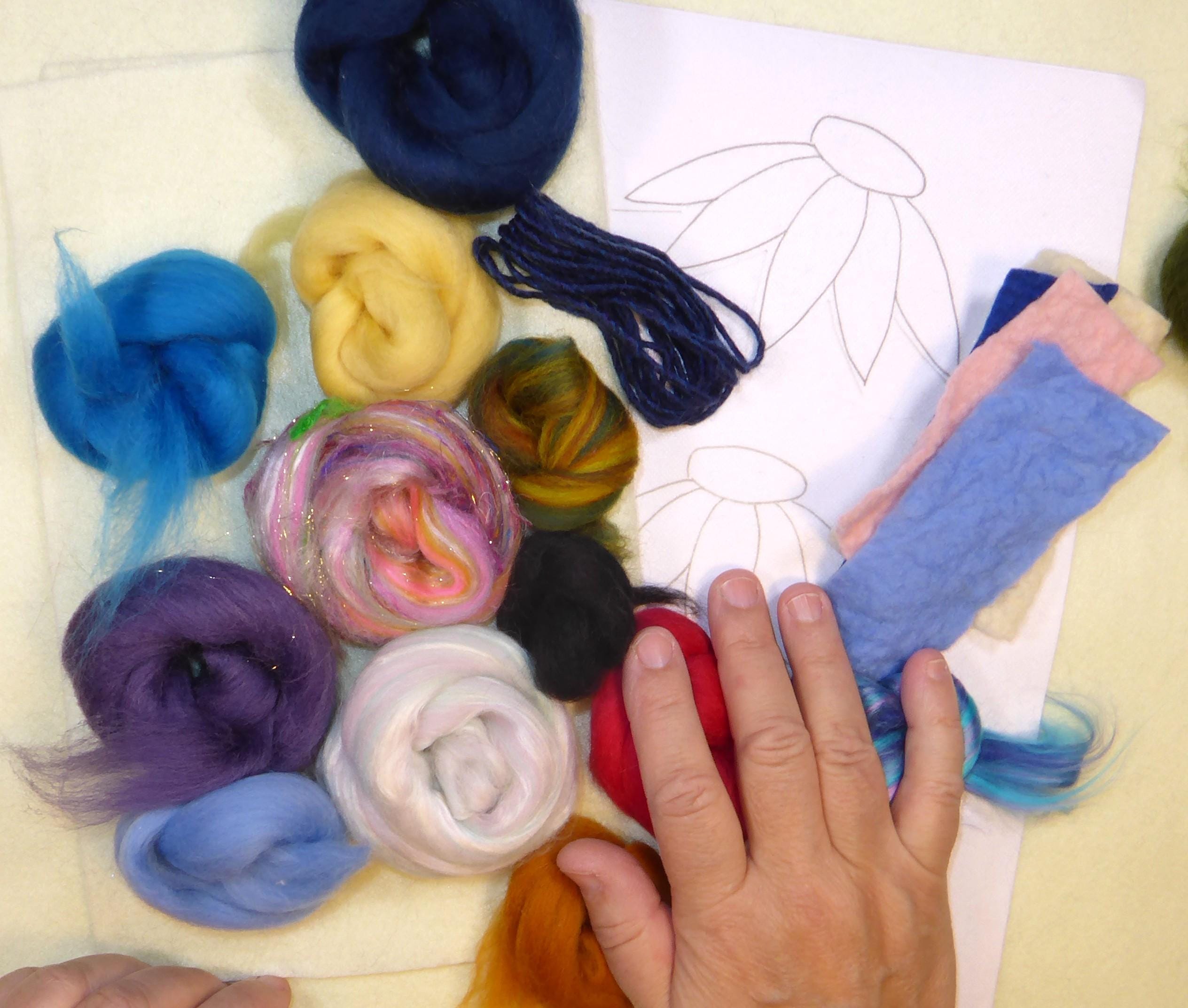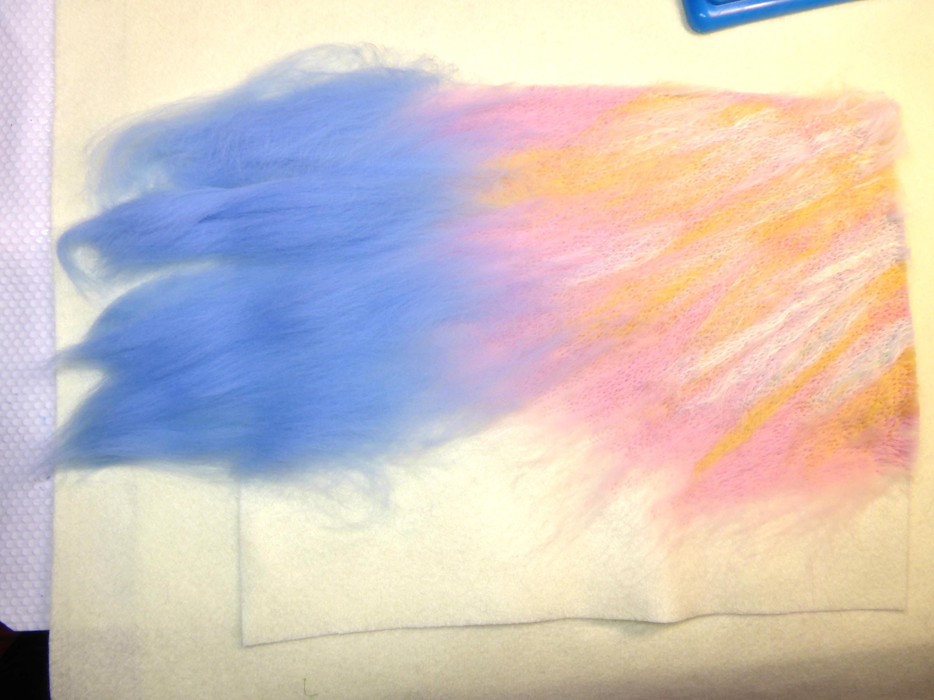 You start with a piece of acrylic felt, which you lay your fibres on and then lay this onto a sponge or felting brush. The felting brush is much easier to work on.