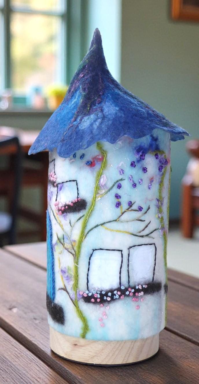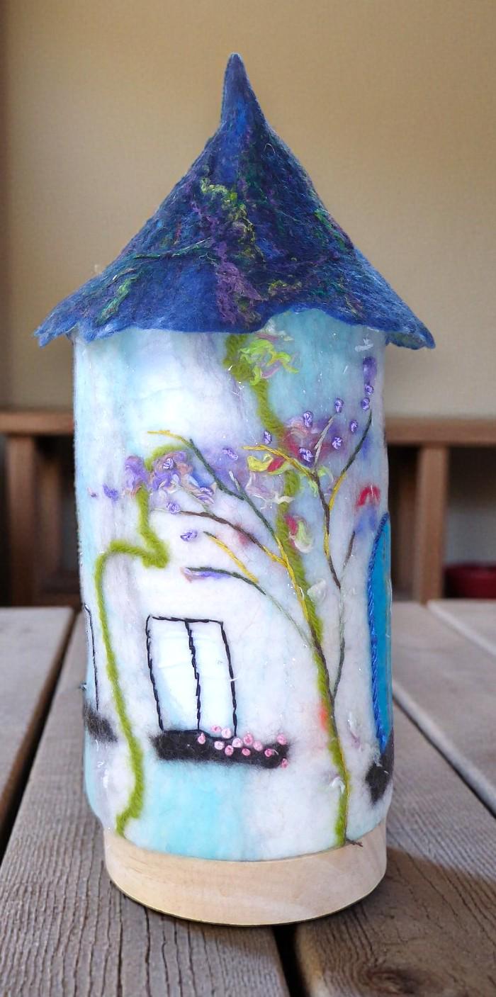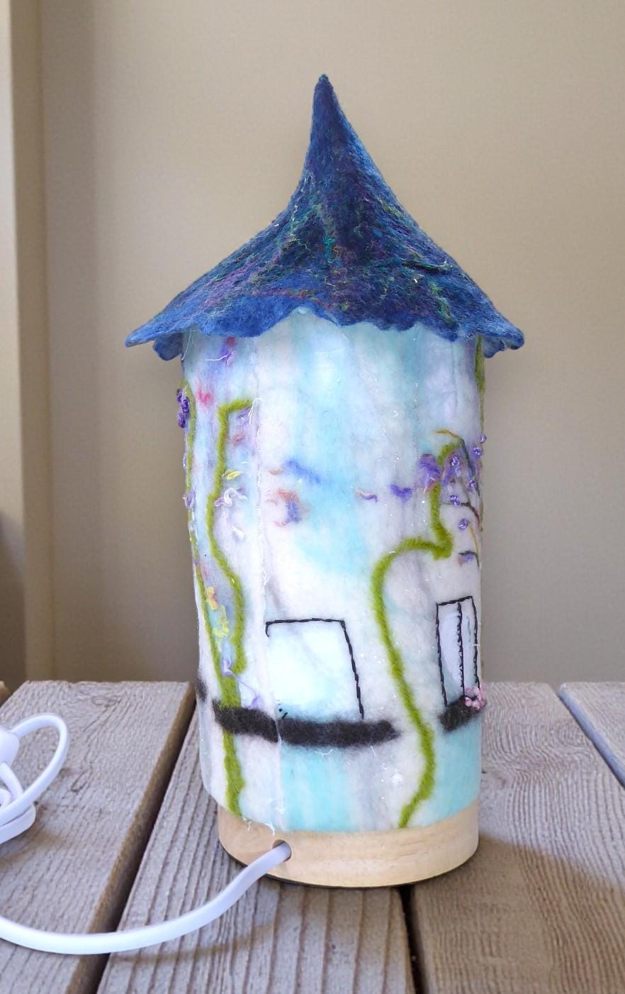 This small lamp has a hand-felted shade with a hand-embroidered design in the style of a 'Fairy House'. It has a wooden base and a felted, conical roof which can be removed.