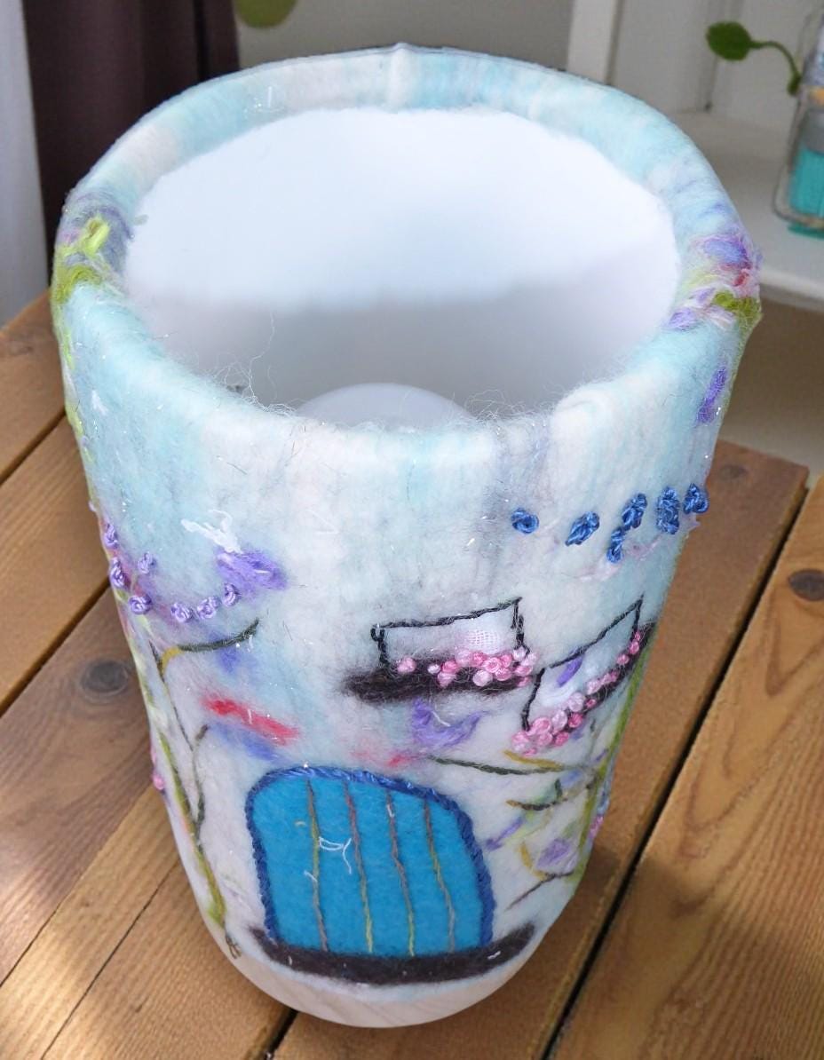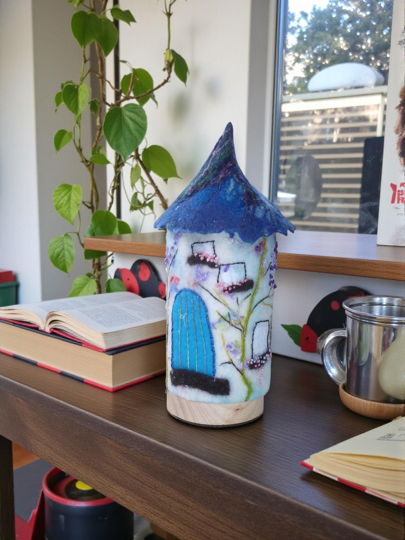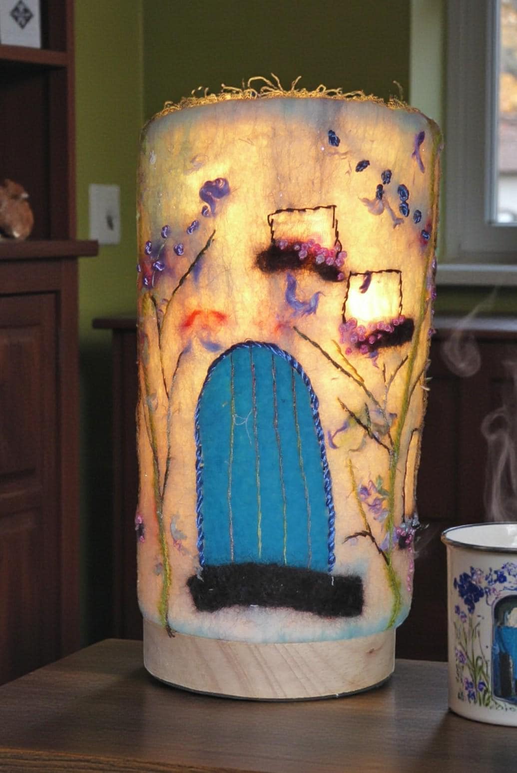 This small lamp has a hand-felted shade with a hand-embroidered design in the style of a 'Fairy House'. It has a wooden base and a felted, conical roof which can be removed.