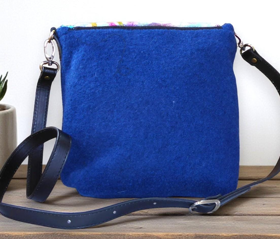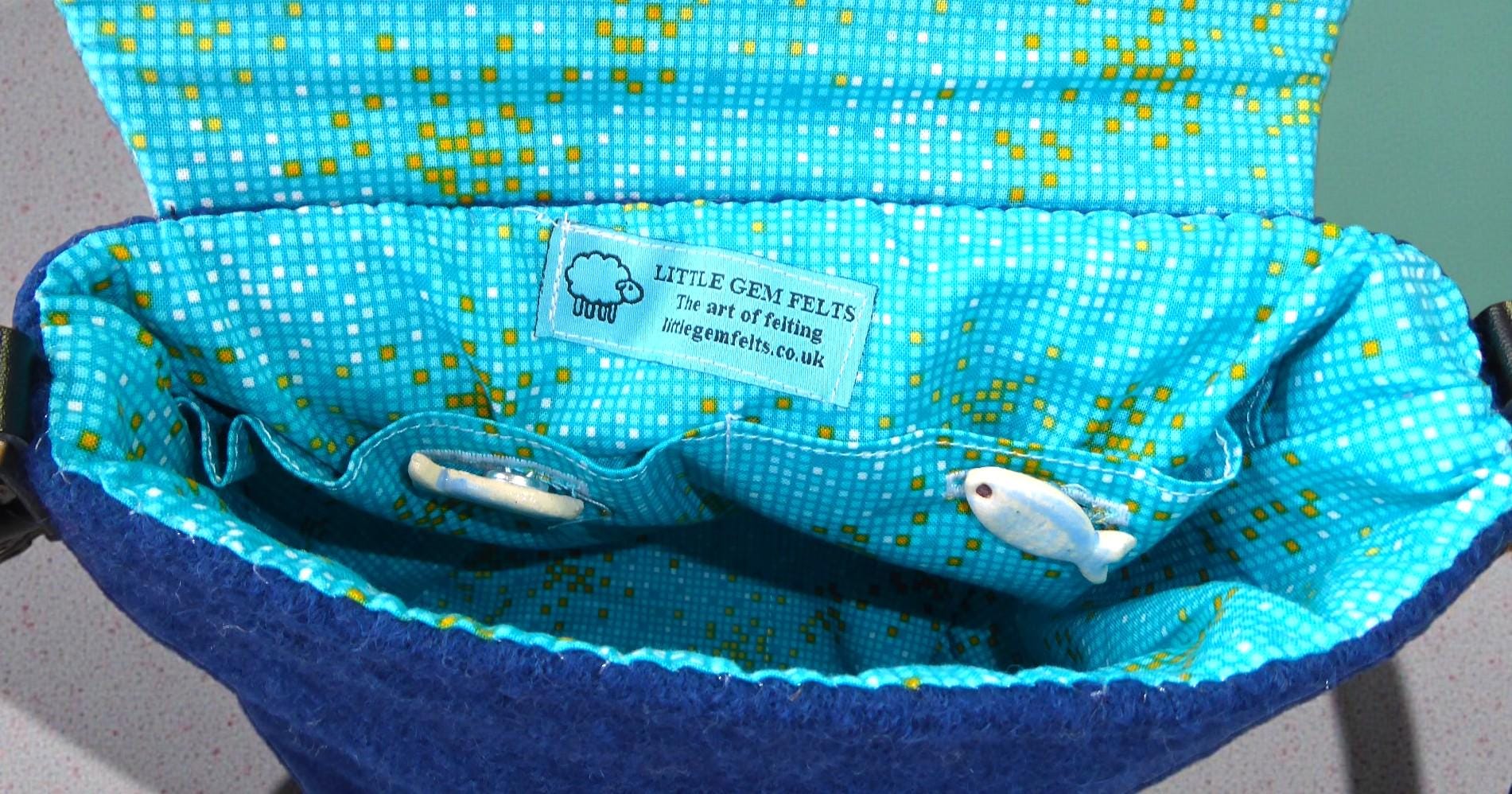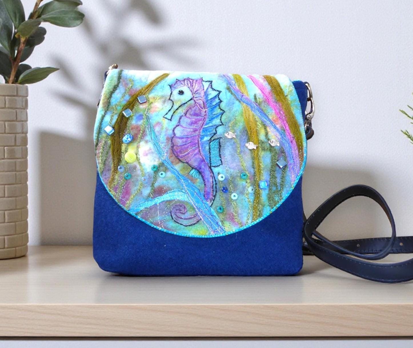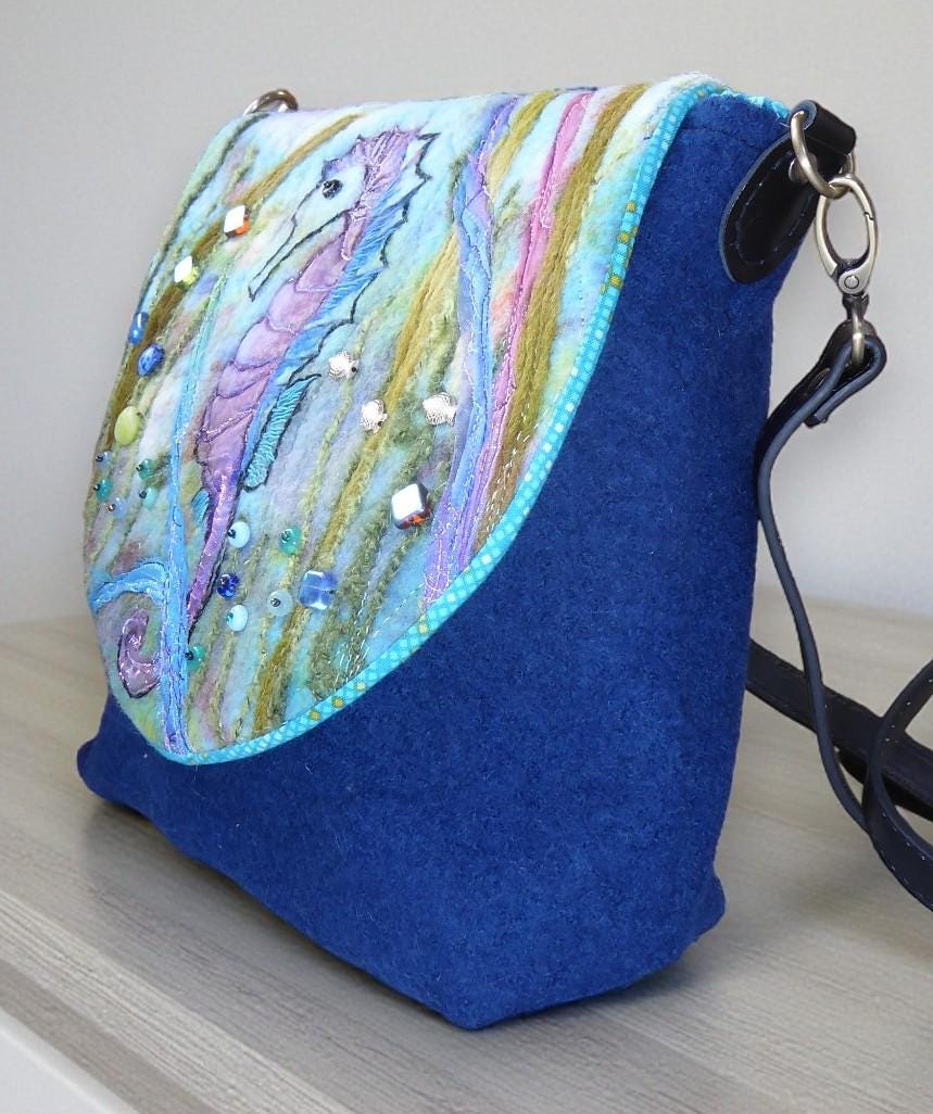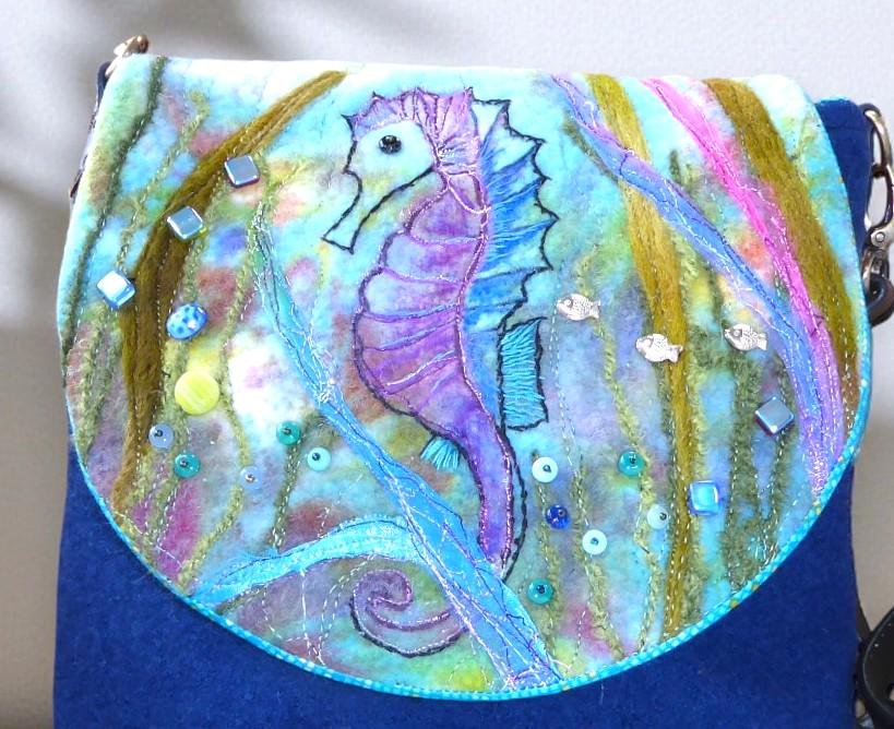 The bag has a flap, onto which I have needle-felted and embroidered a sea horse. I have added beads and embroidery for extra detail
