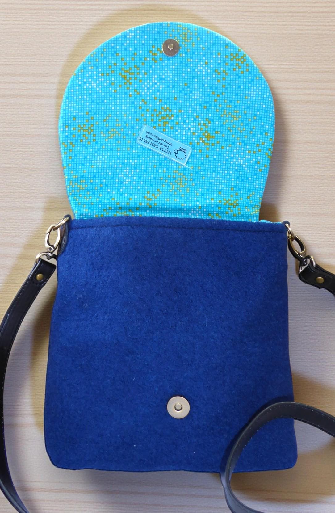 This shoulder bag is fully lined, with pockets secured by hand-made buttons. It has a p.u. leather detachable strap which is 17mm wide. The strap can be extended from 100cm to 120cm.