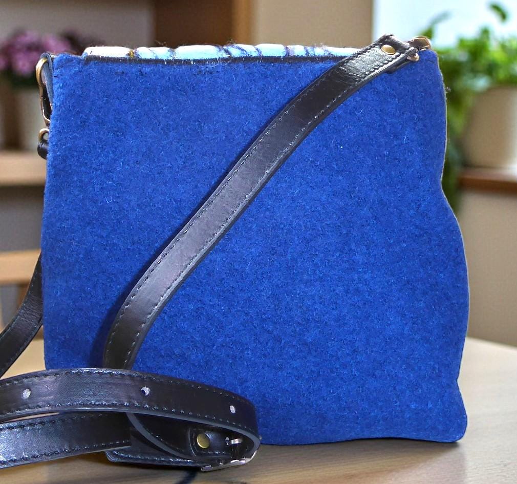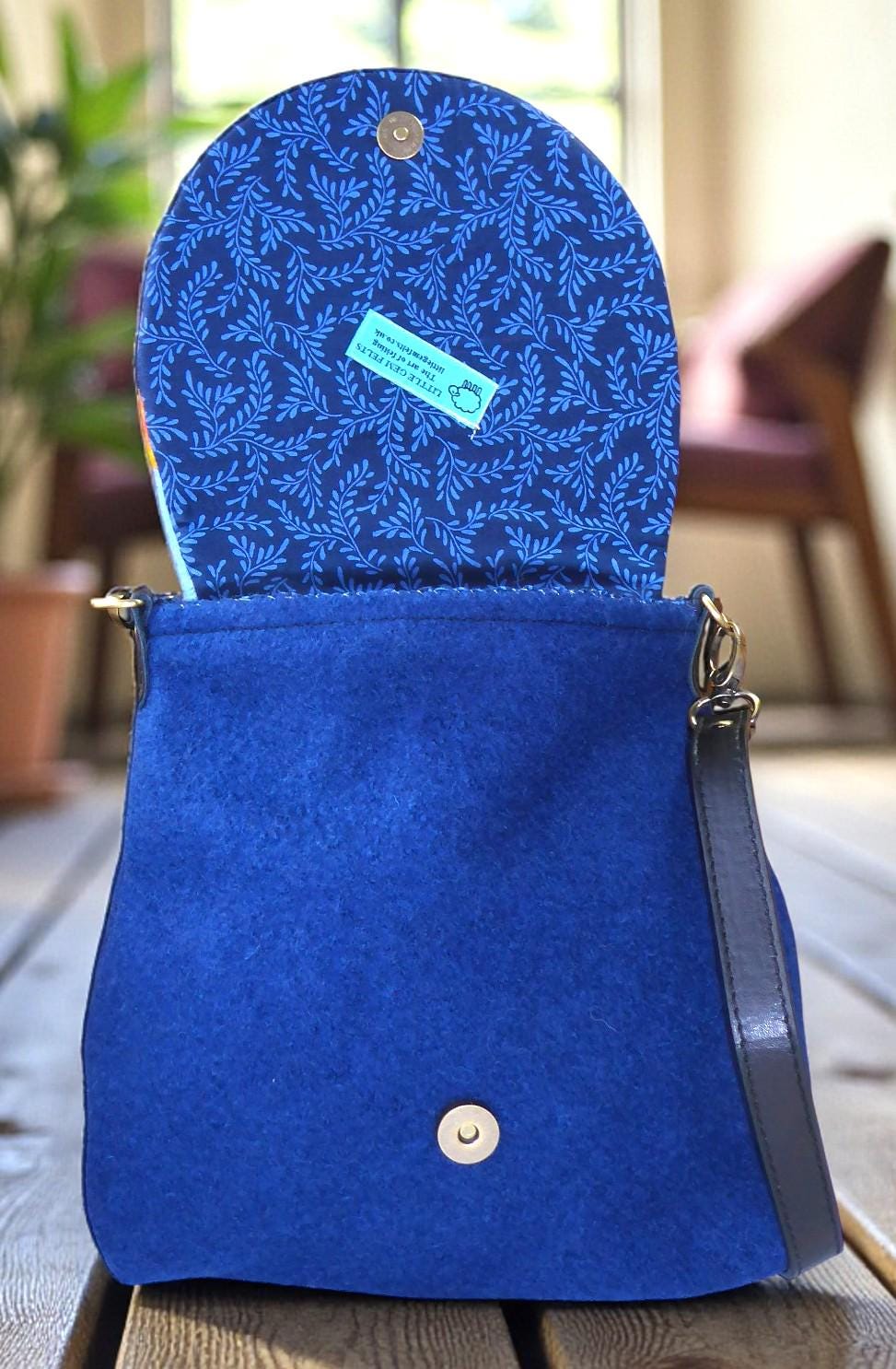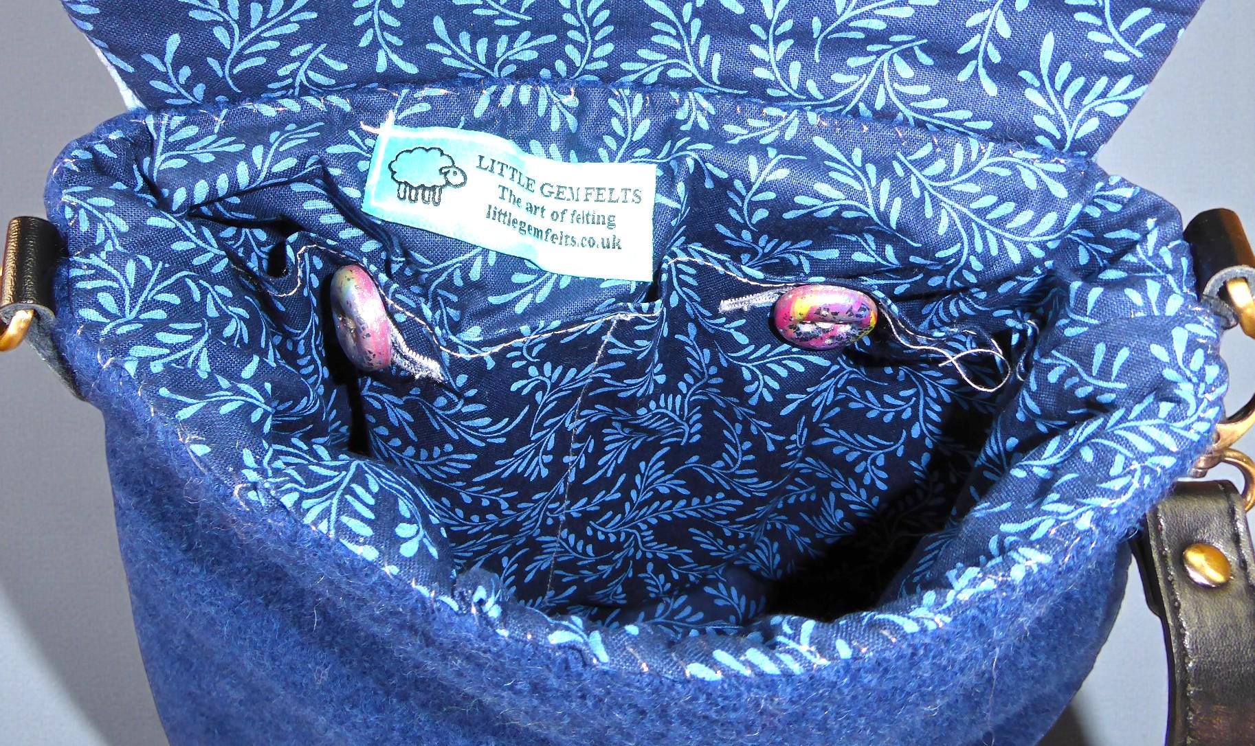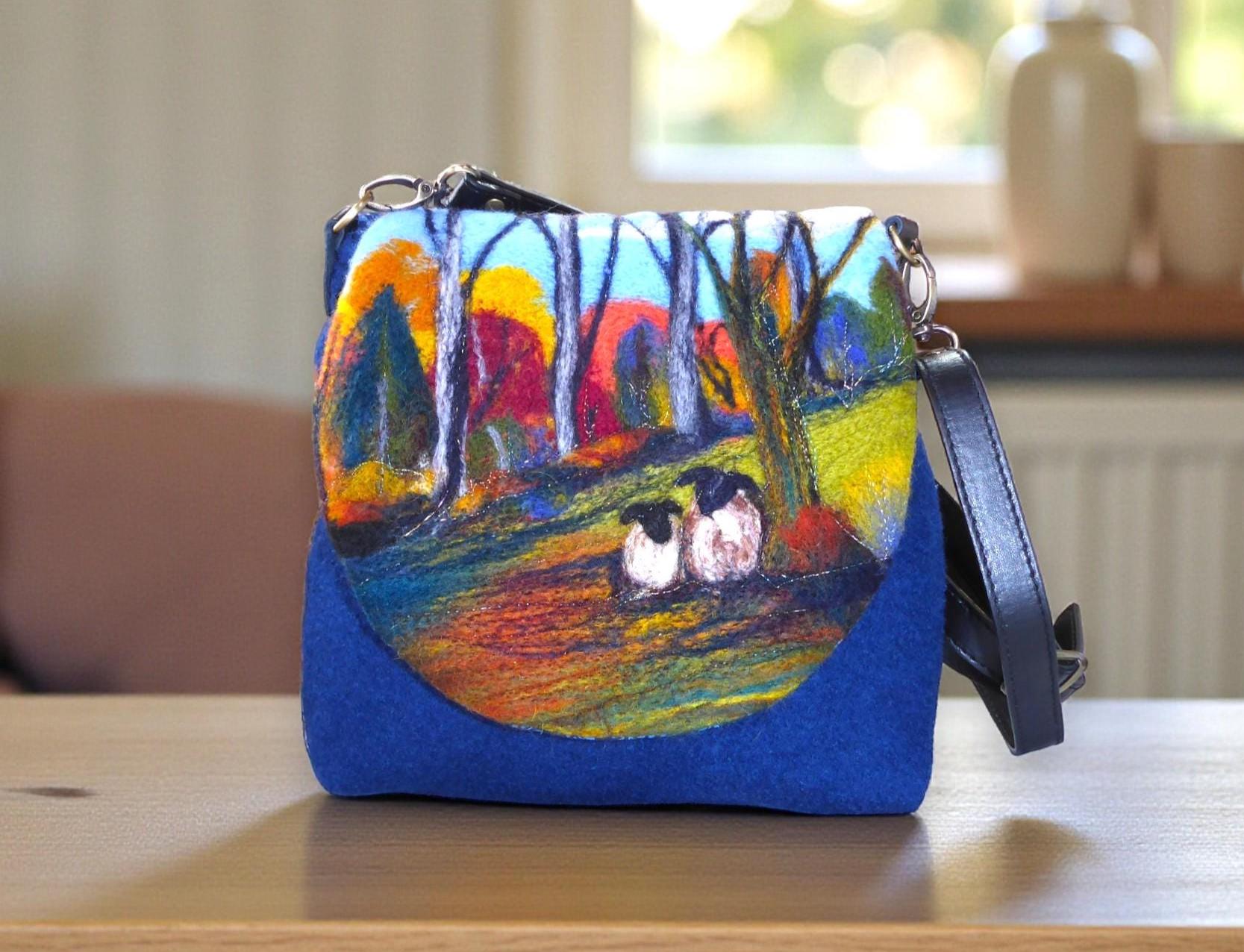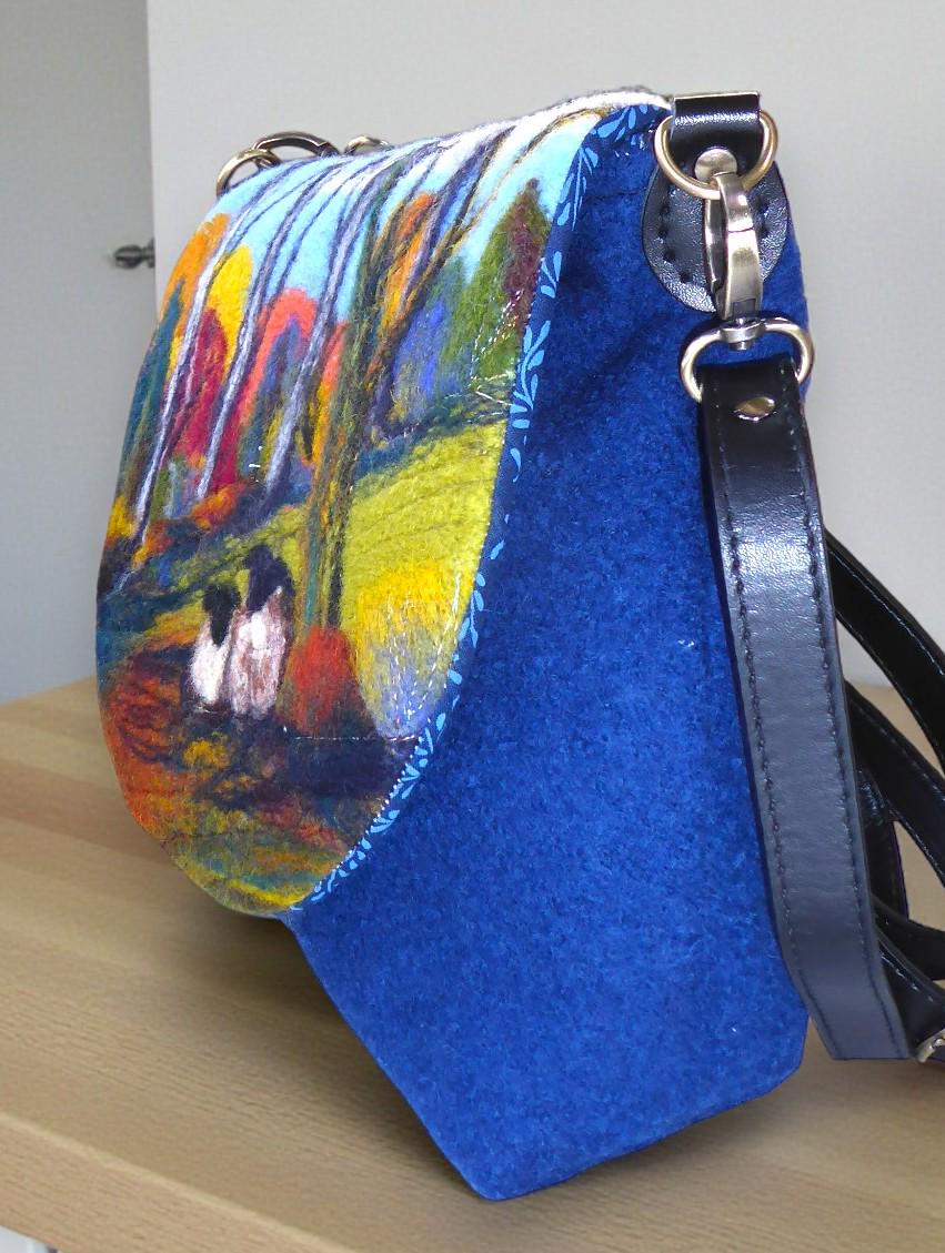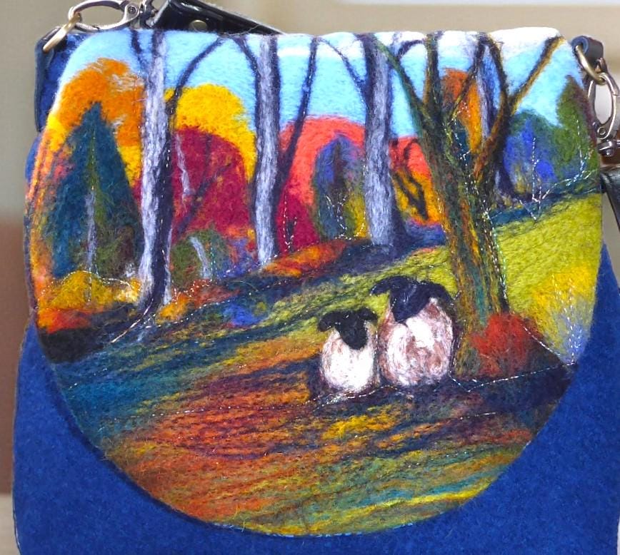 The bag has a flap, onto which I have needle-felted an autumnal scene with sheep in the woods.