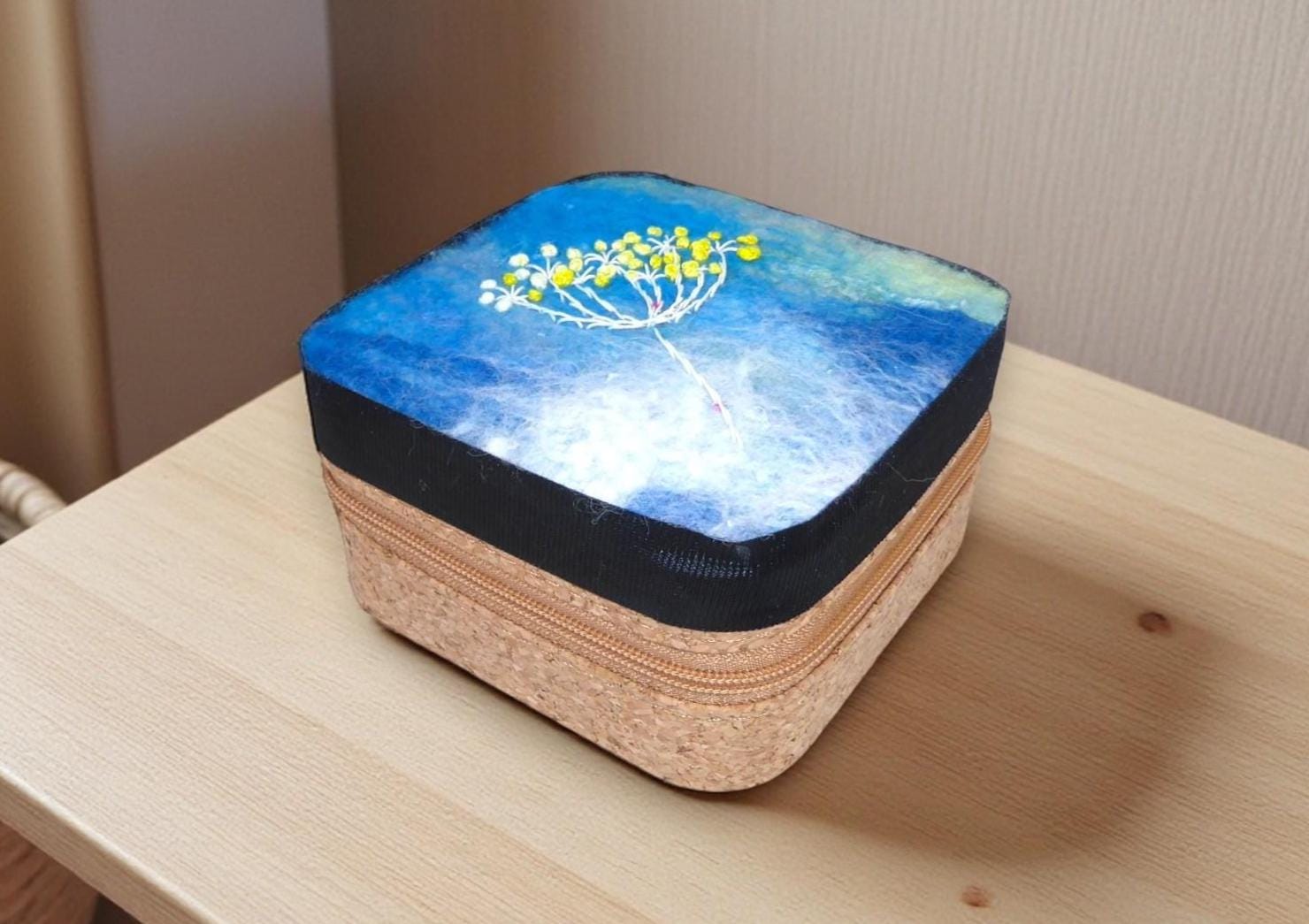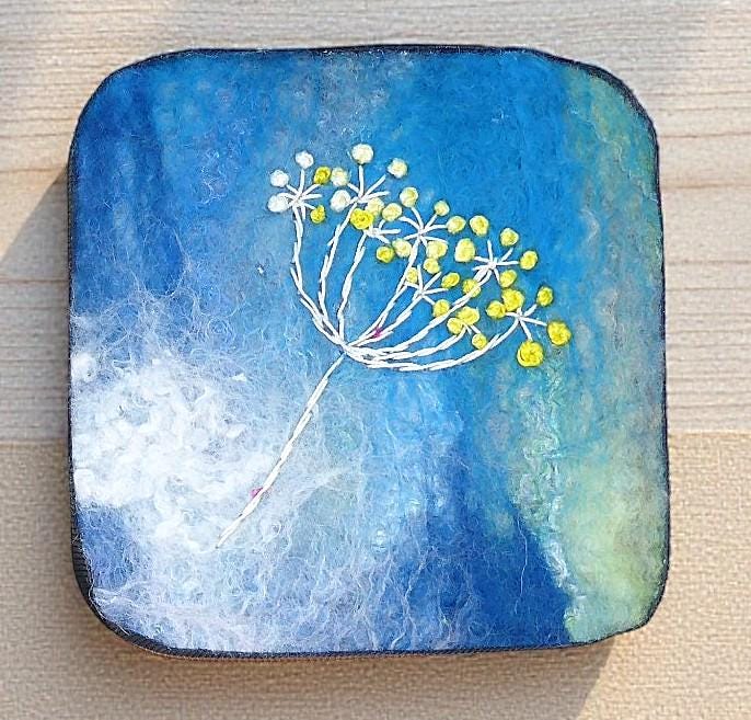 This box features an embroidered flower on a wet-felted background.