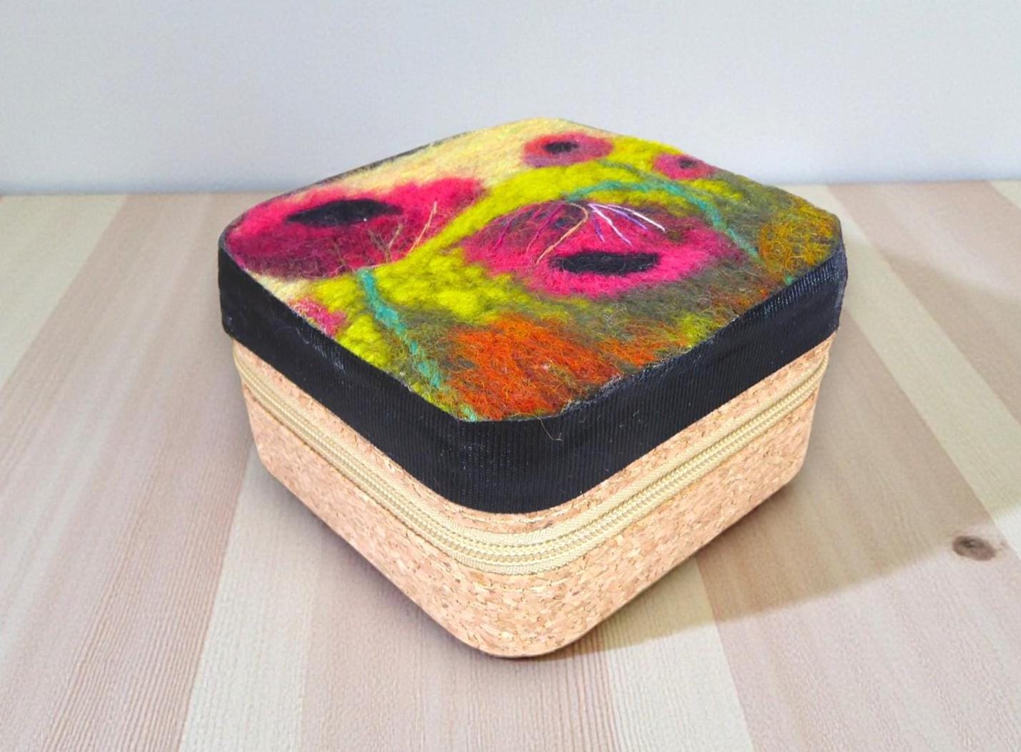 This box features needle-felted poppies on a wet-felted background.