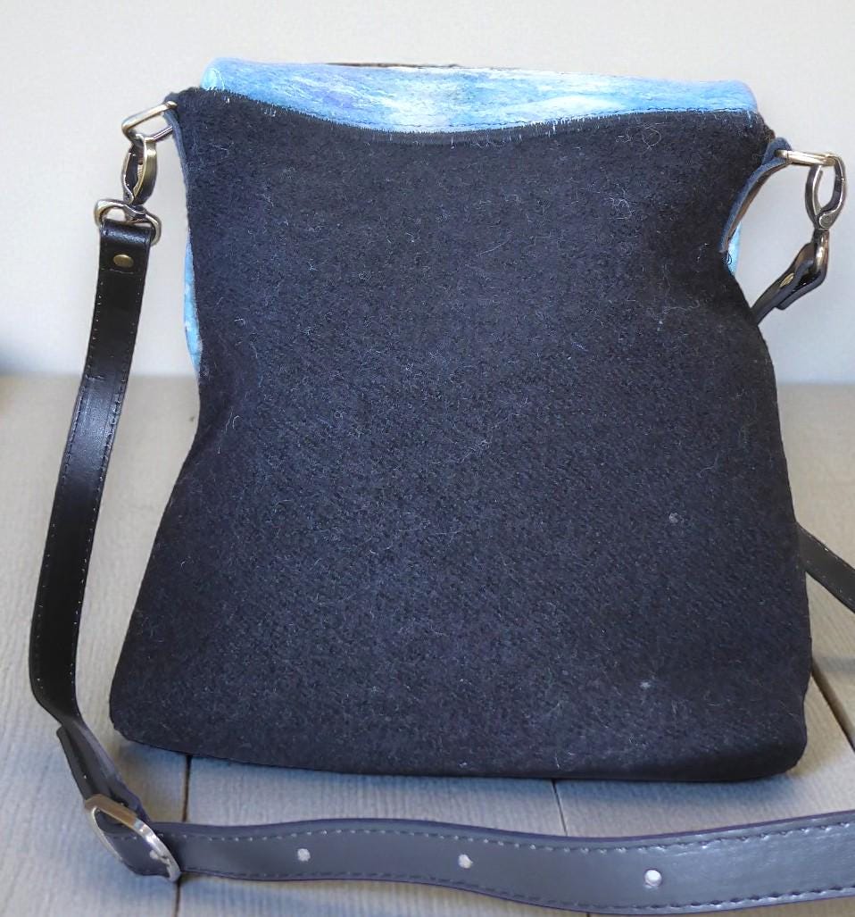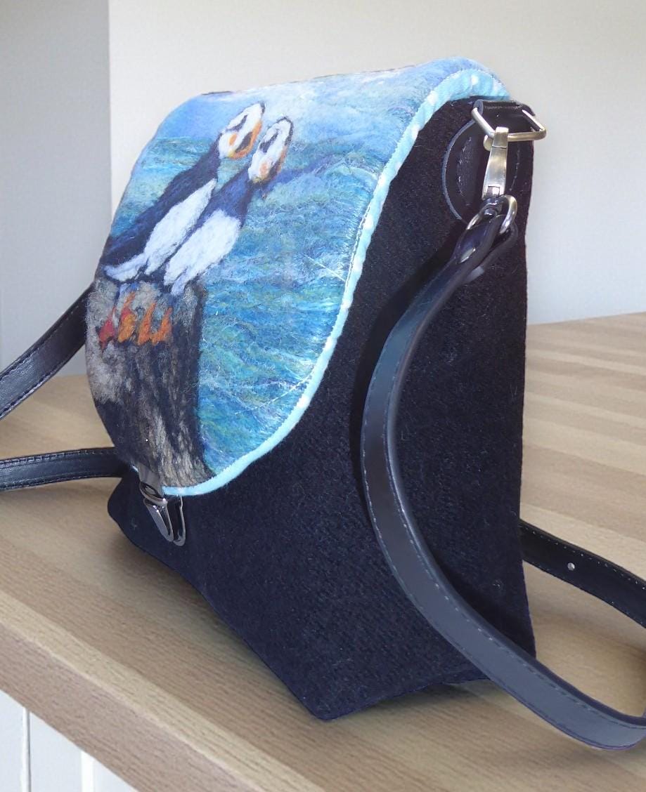The bag has a flap, onto which I have needle-felted a pair of puffins