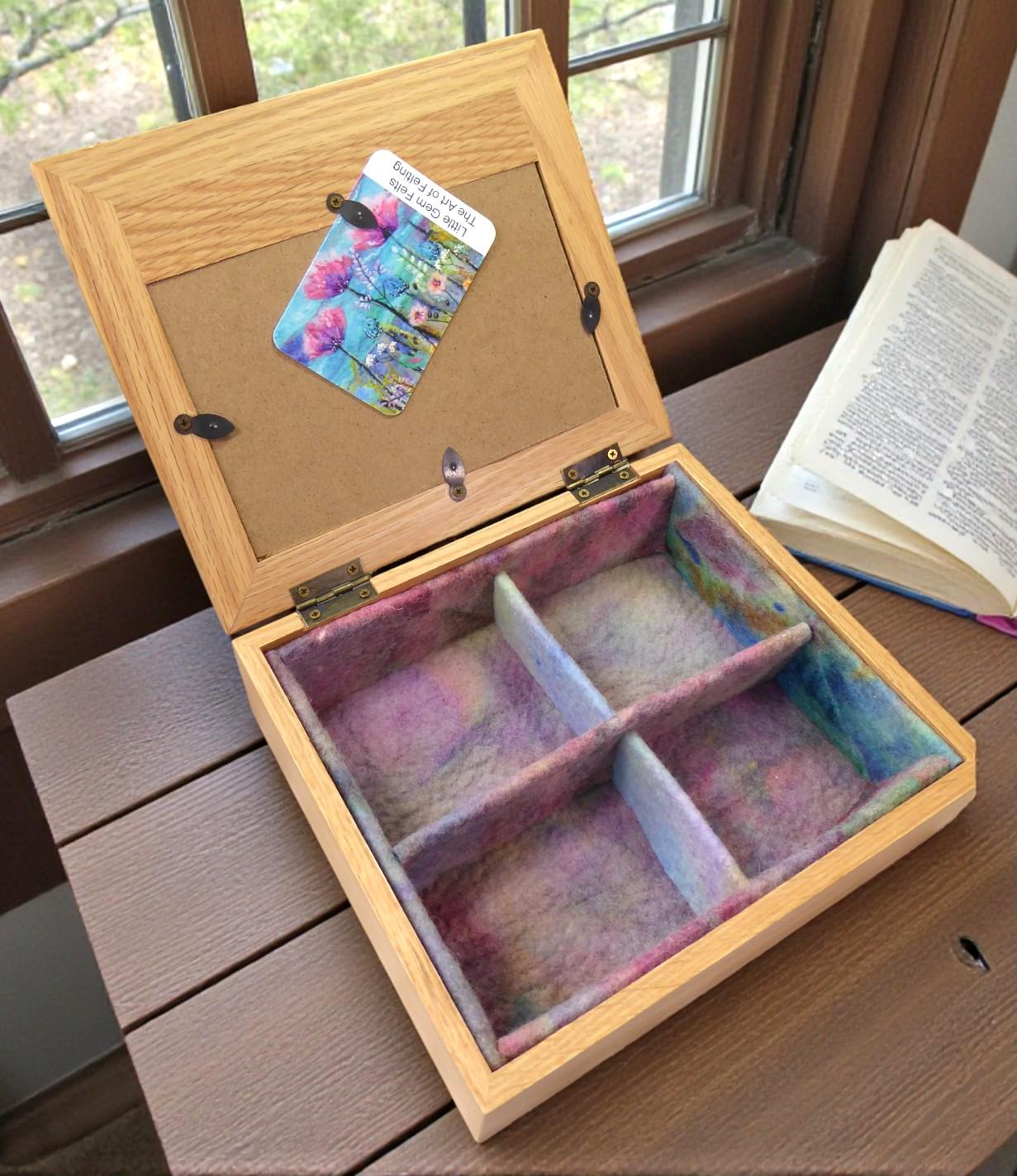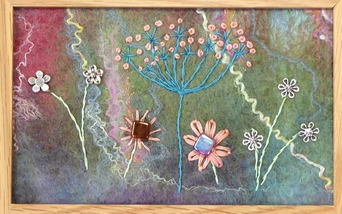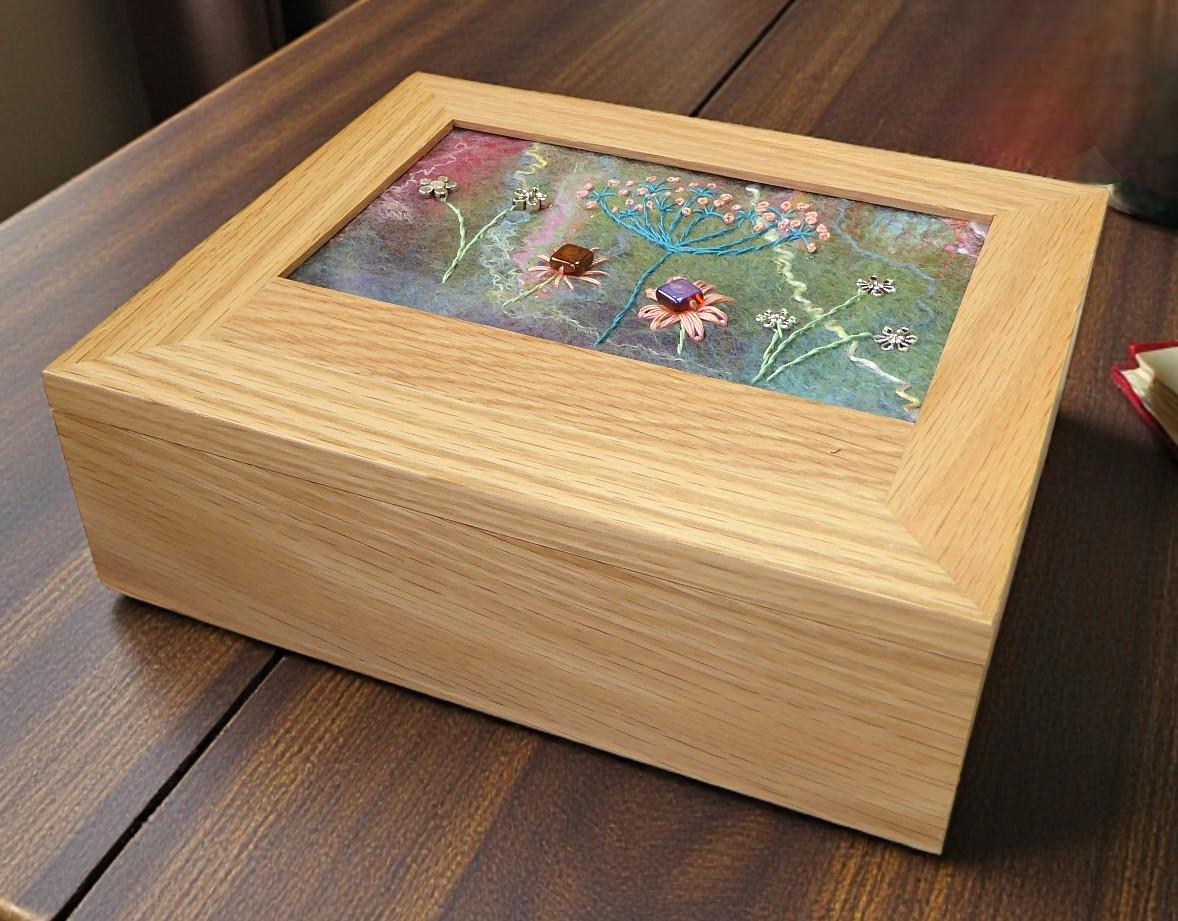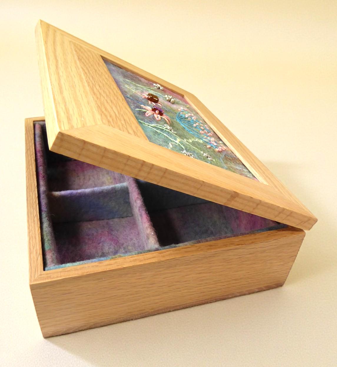 I have embroidered some flowers, with silver and glass beads, onto a wet-felted background, which is inlaid into the lid.