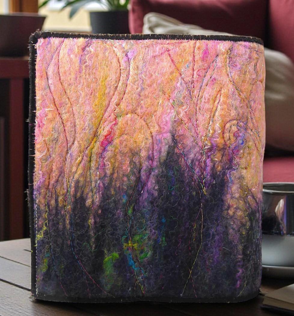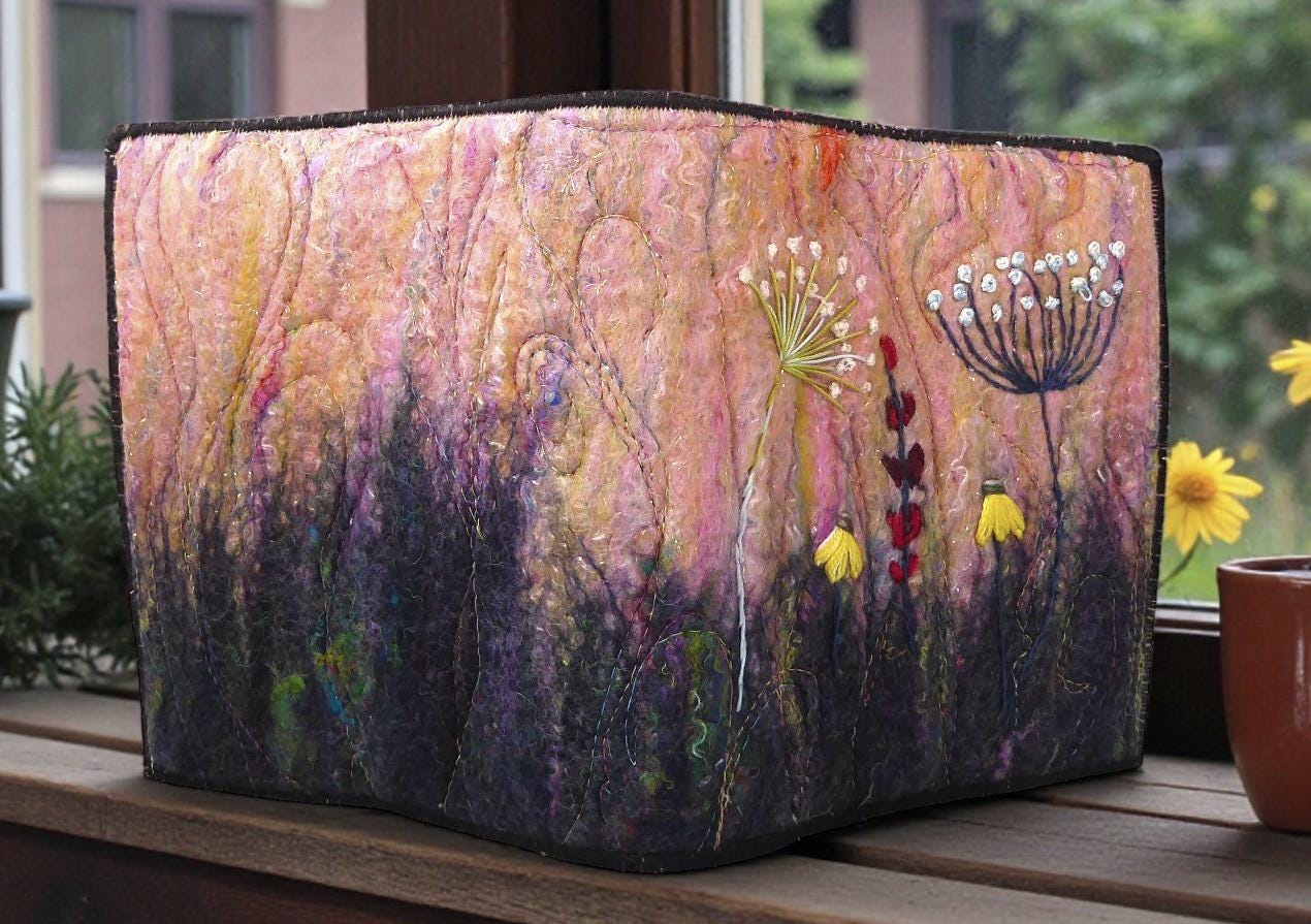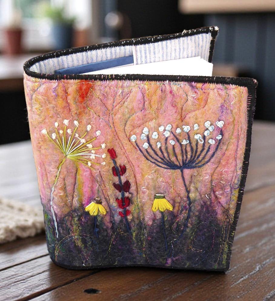 To make this book, I embroidered some flowers onto a wet-felted background. I then added embroidery for added detail.