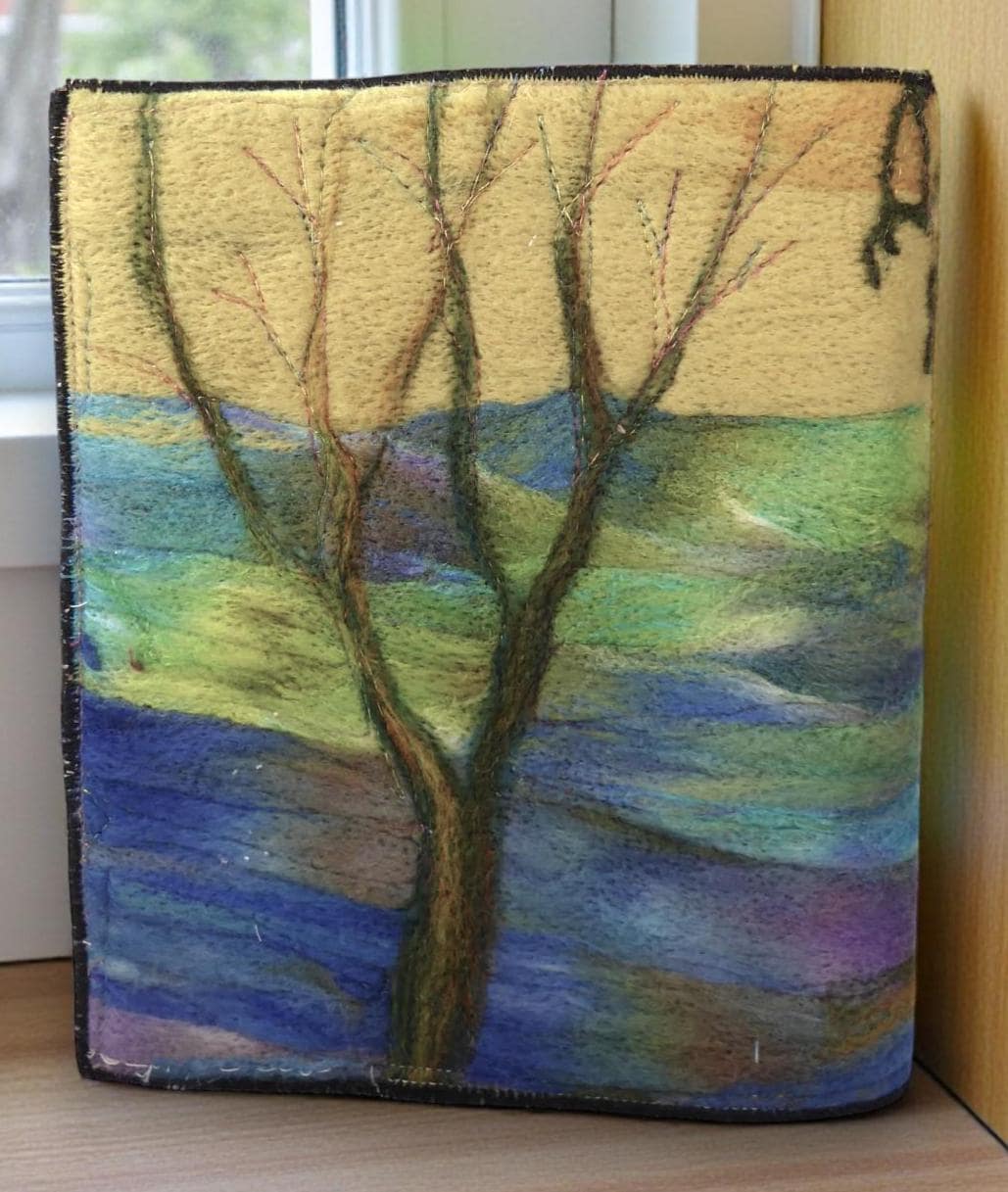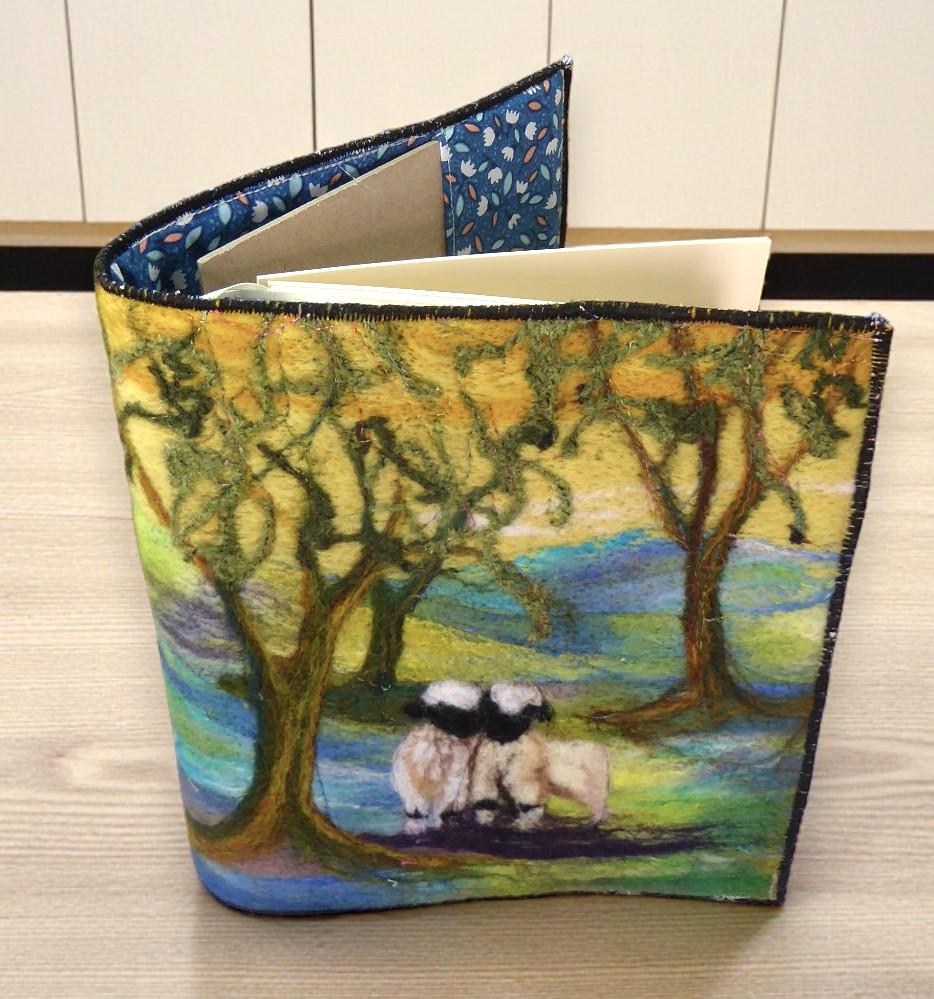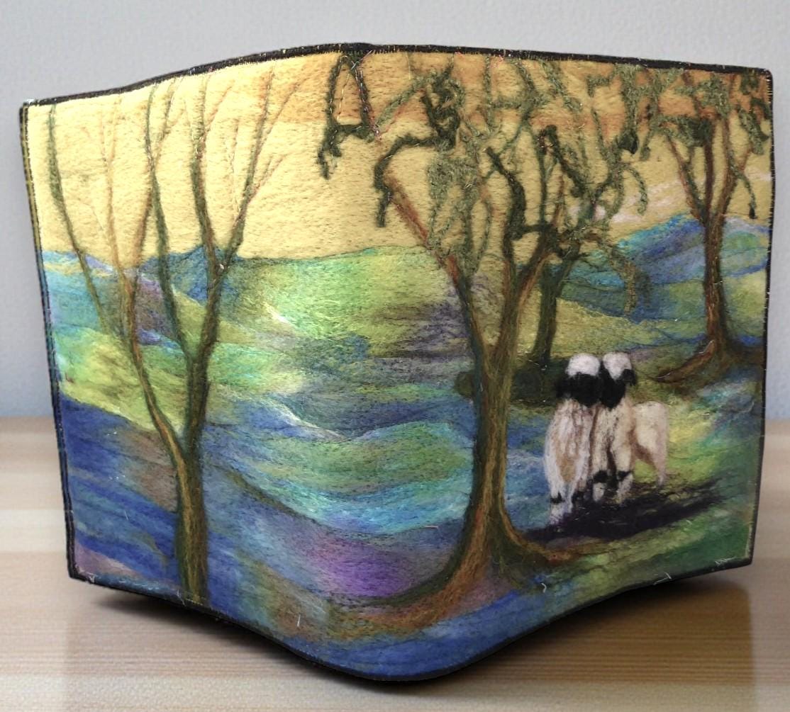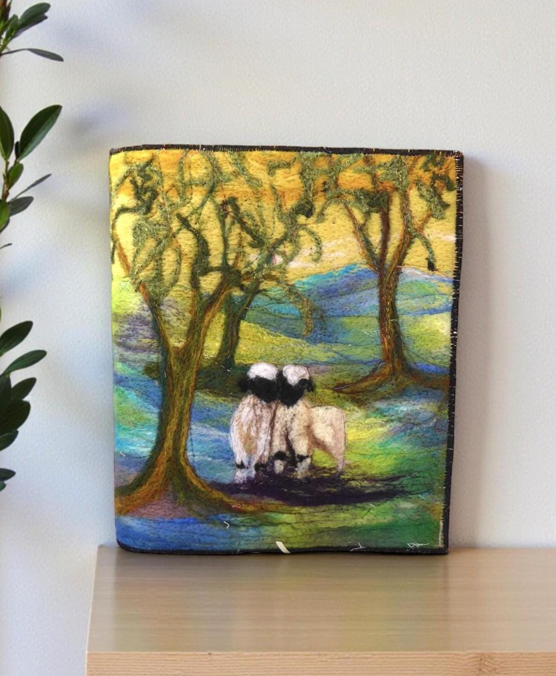 I have needle-felted a picture of two sheep in the woods.