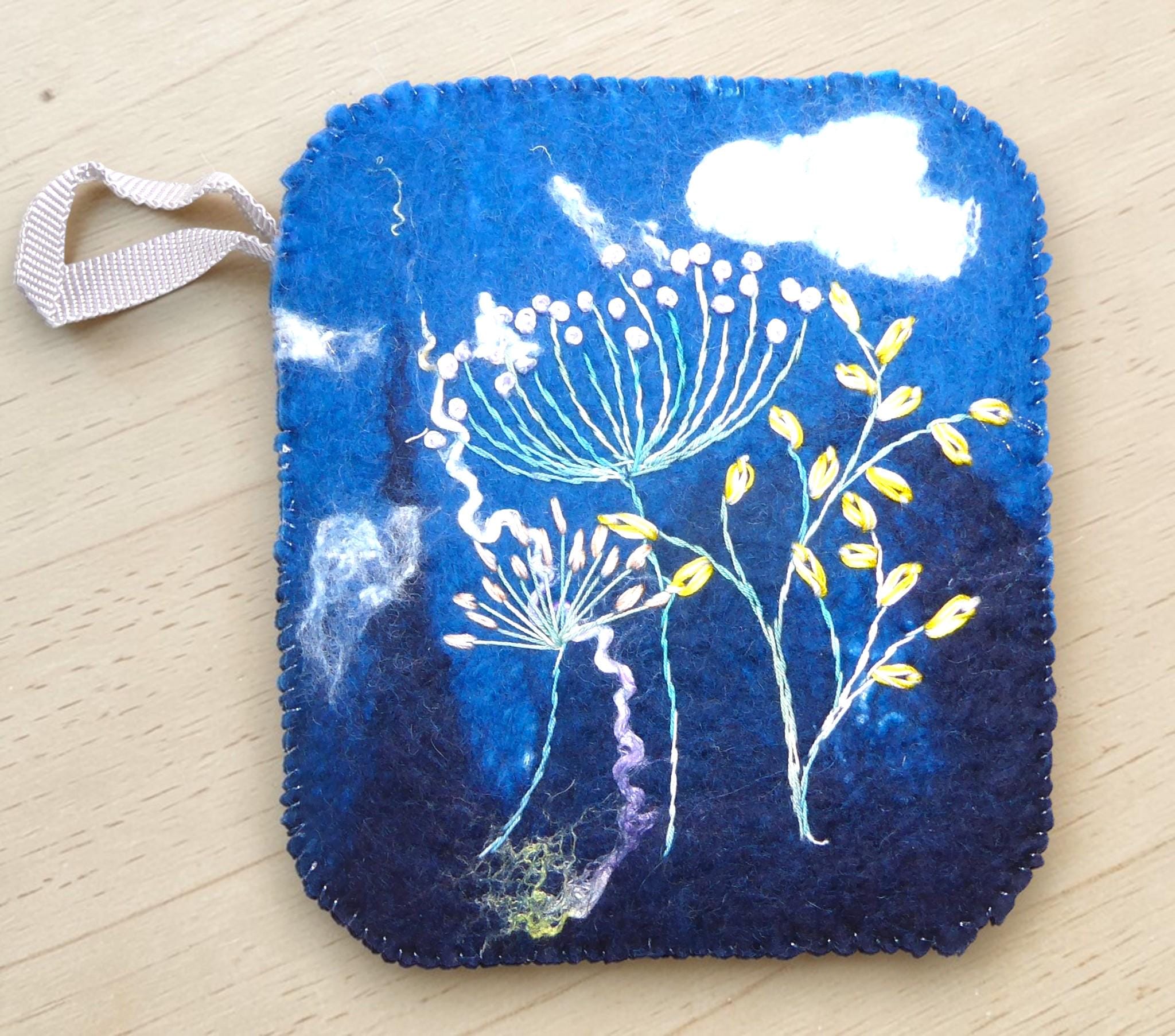 The design has been embroidered onto a wet-felted background. Some of the fibres have been dyed by me.