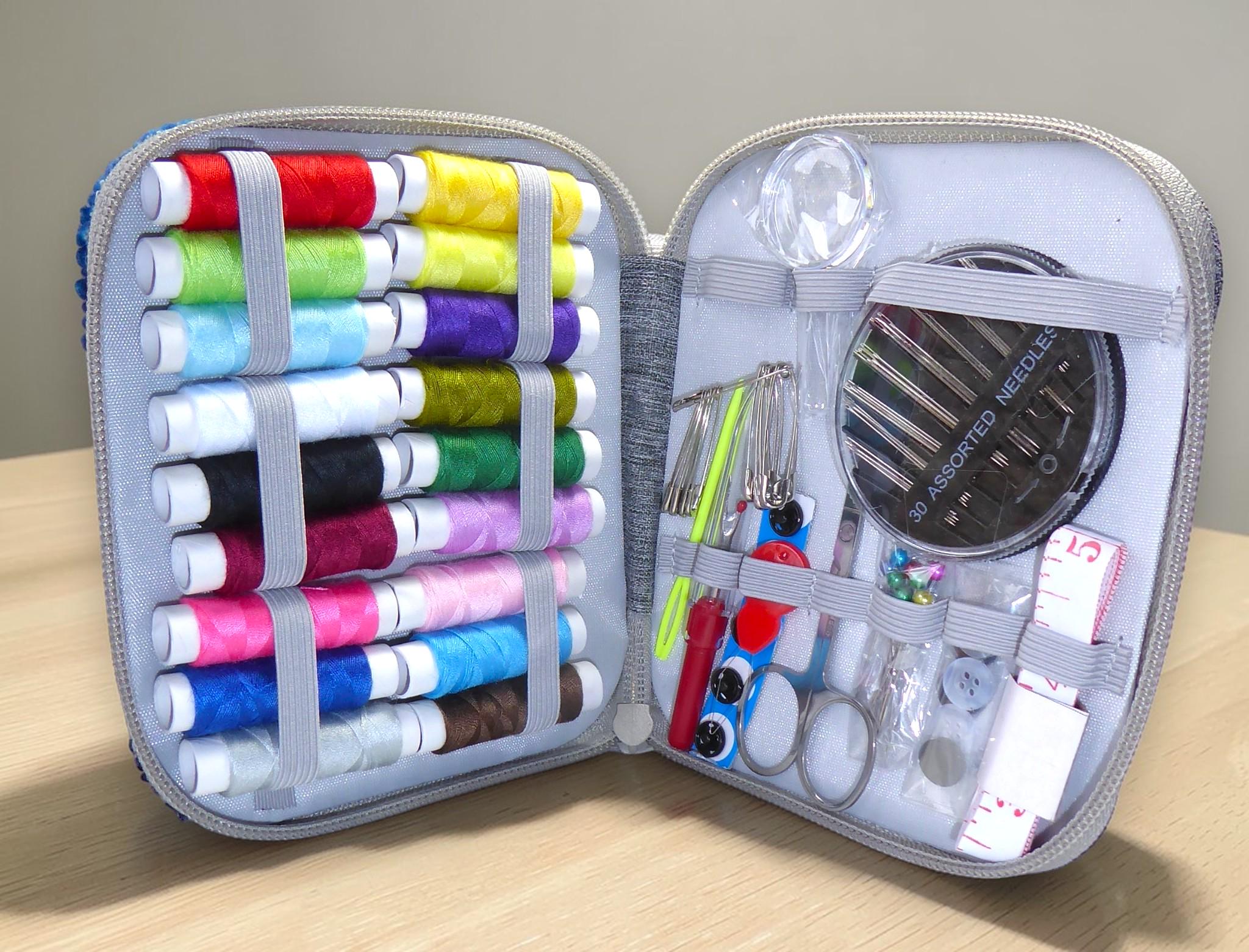 Inside are a selection of coloured threads, safety pins, needles tape measure and much more.