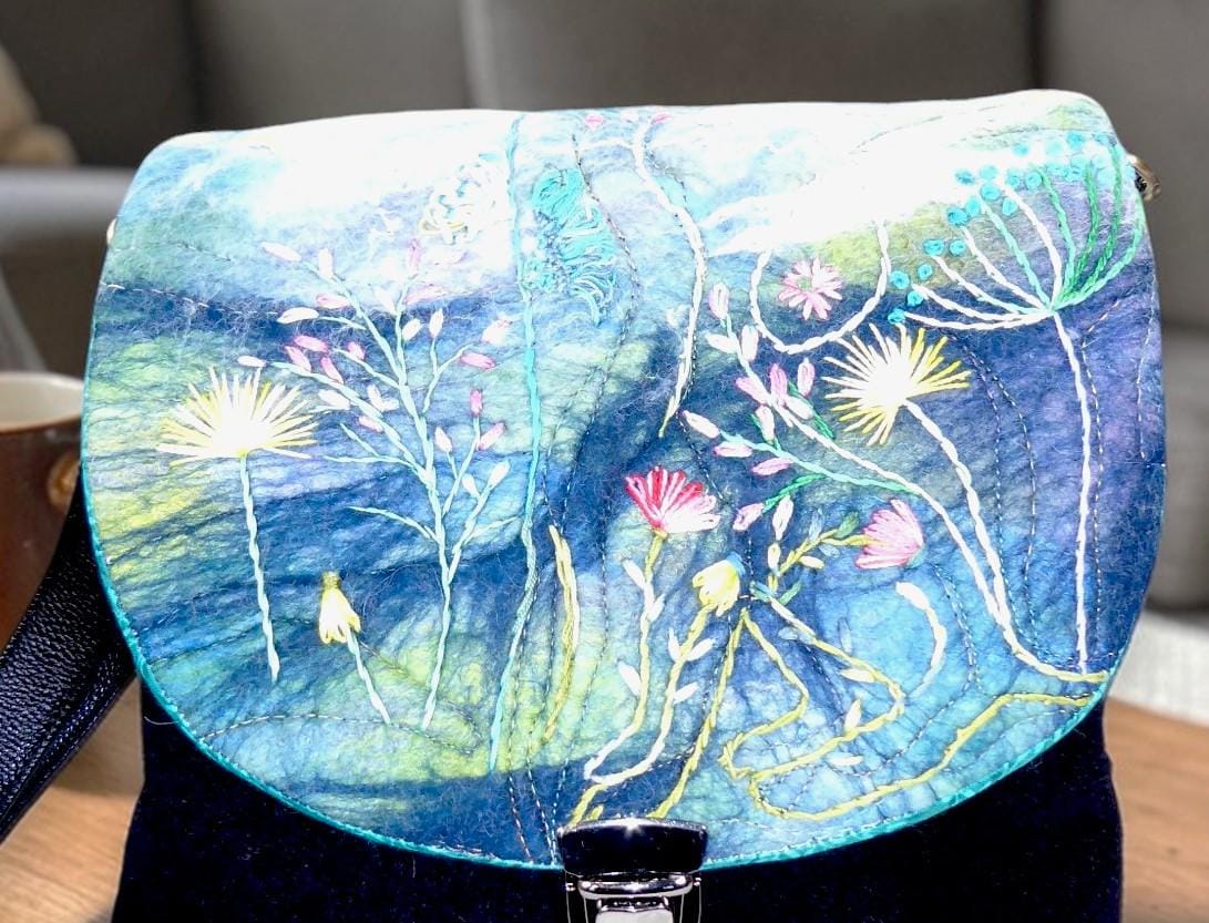 The picture on the flap is wet-felted, onto which I have embroidered some flowers.