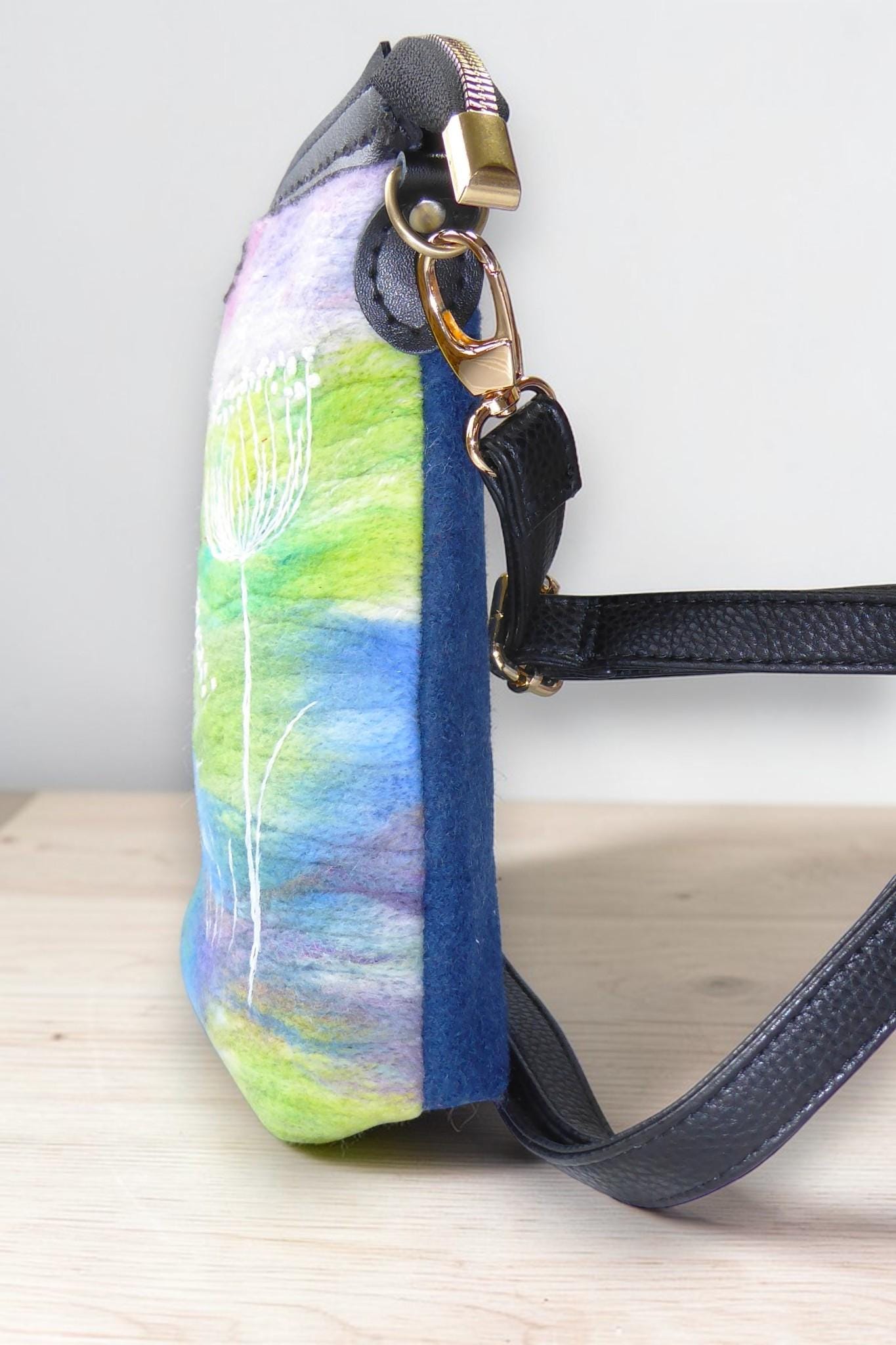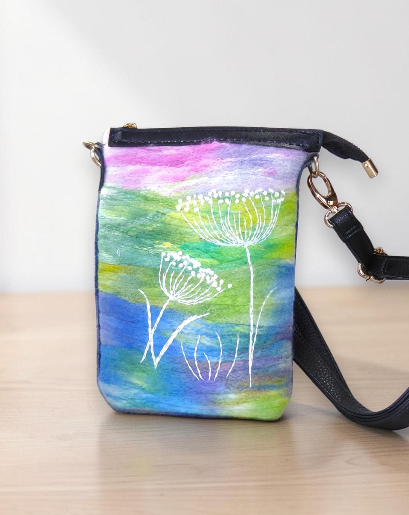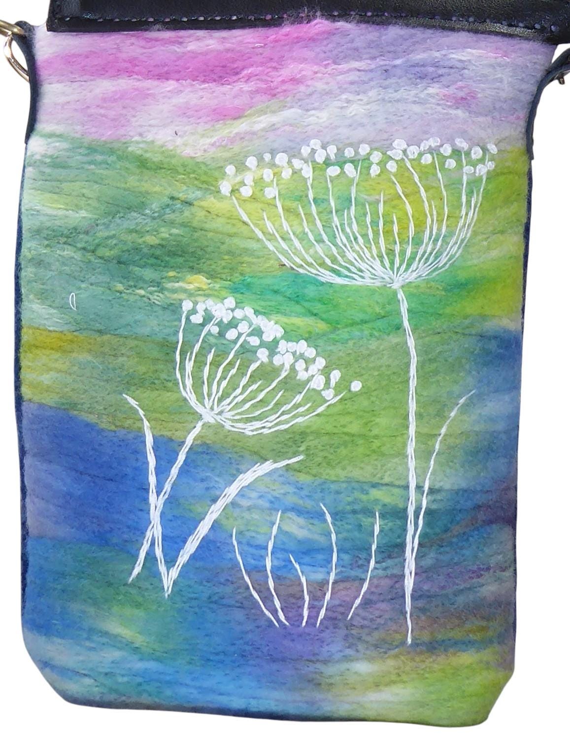 The design has embroidered flowers on a wet-felted background. The fabric for this bag is our own felt.
